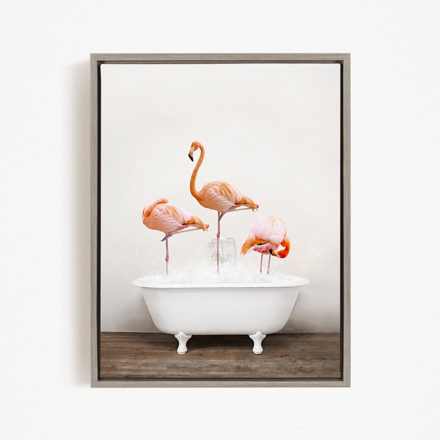 A framed image depicting three pink flamingos standing in a white bathtub filled with water.
