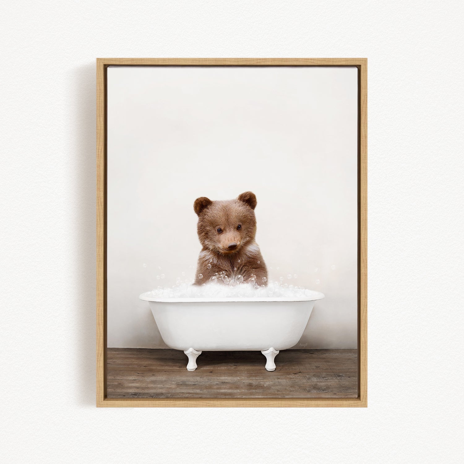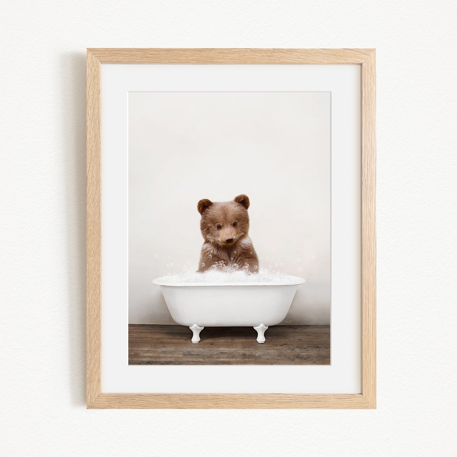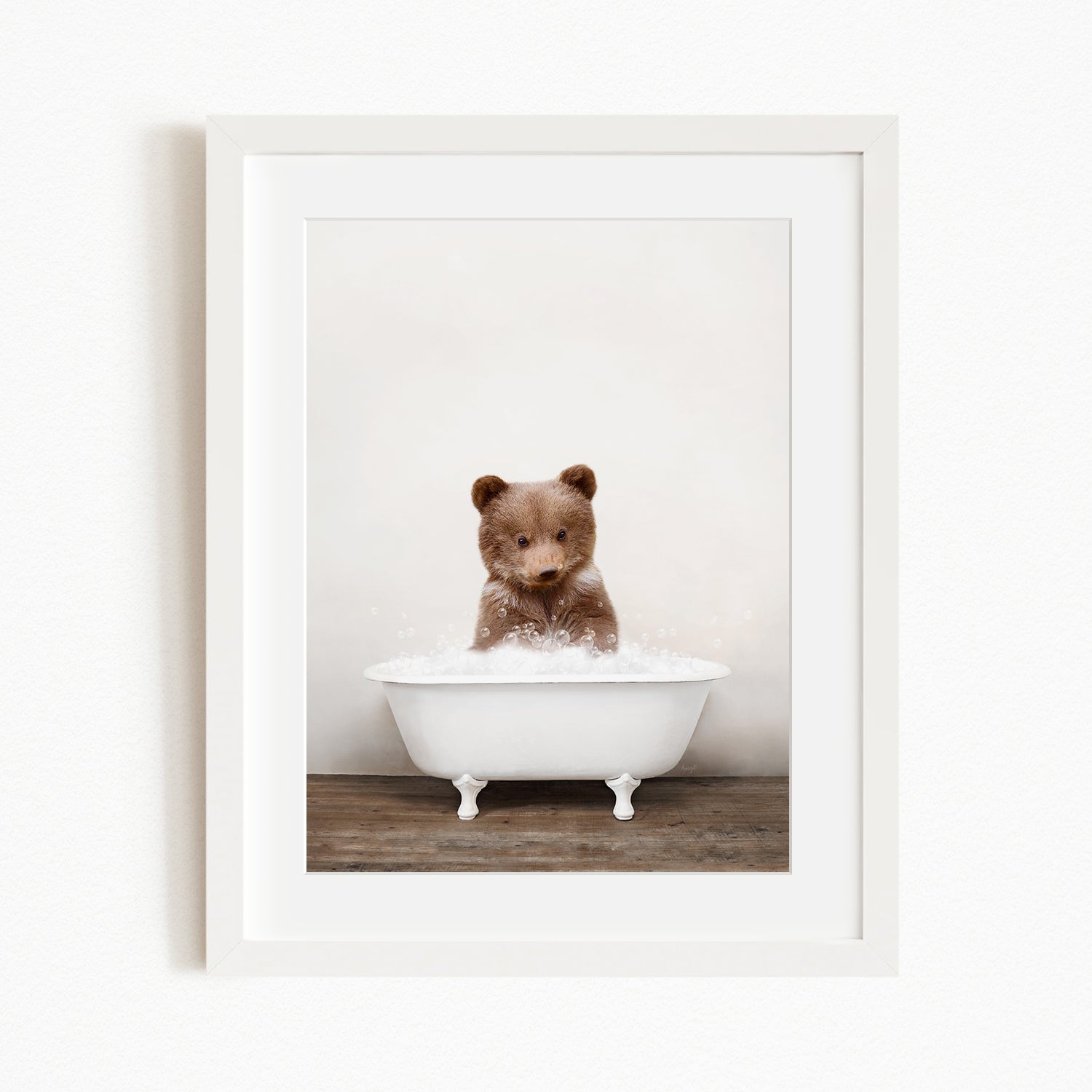 A cute brown bear cub sitting in a white bathtub filled with bubbles, looking directly at the camera.