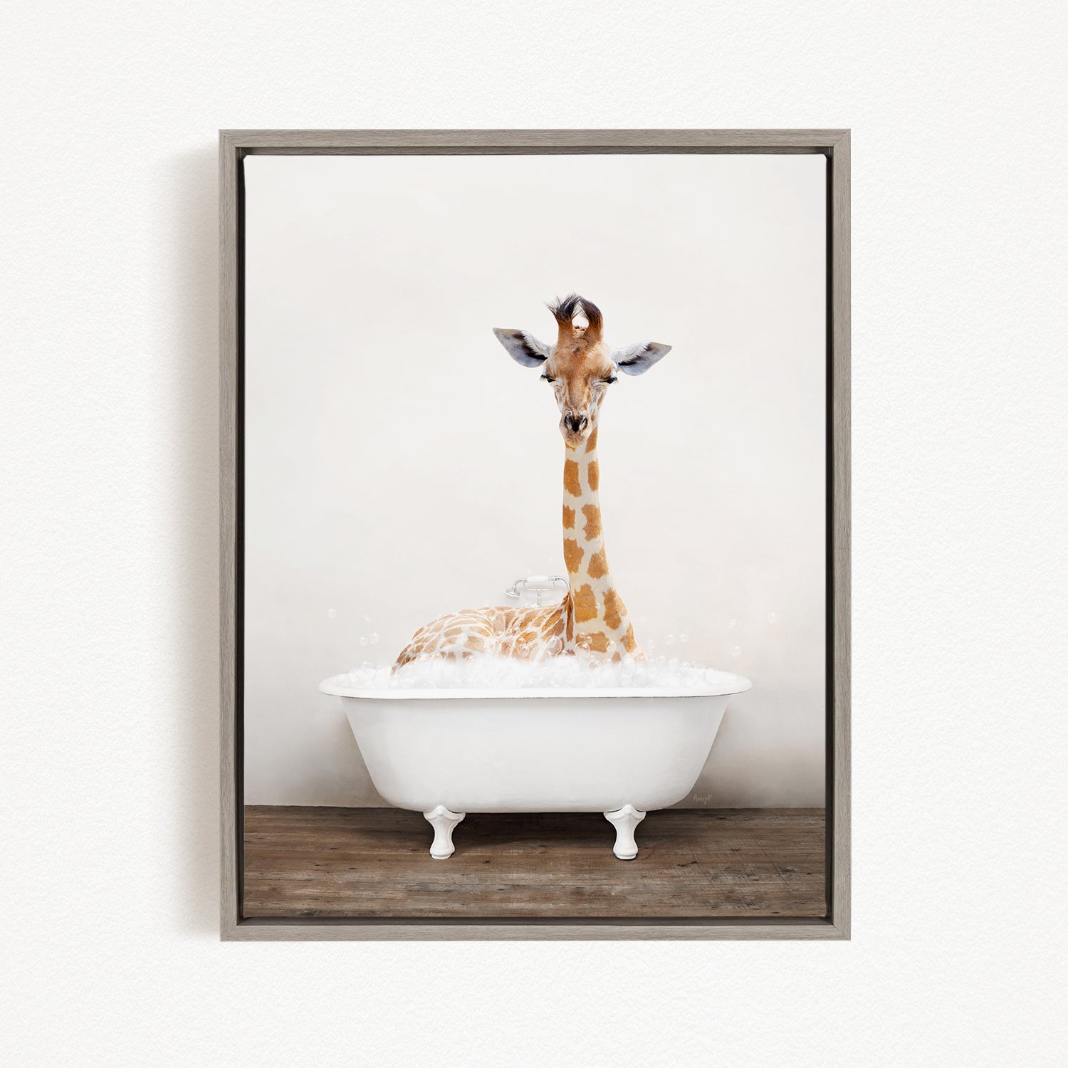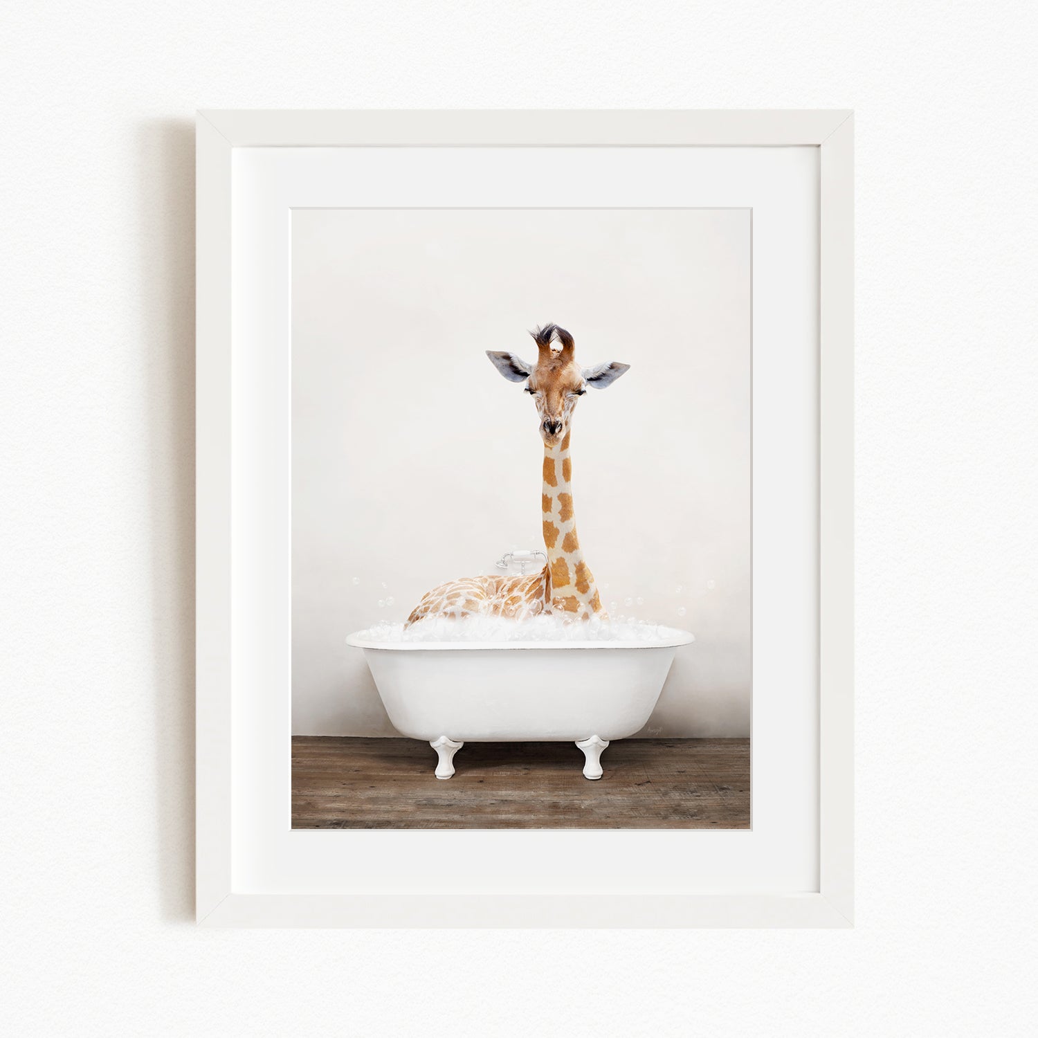 A giraffe is sitting in a white bathtub filled with bubbles, creating a whimsical and playful scene.