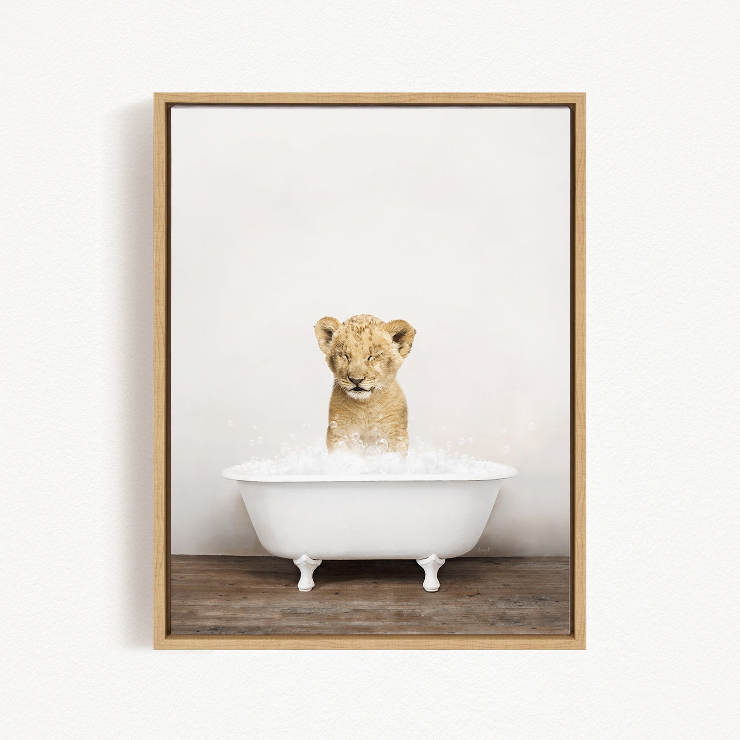 A young lion cub sitting in a white bathtub filled with water, looking directly at the camera.