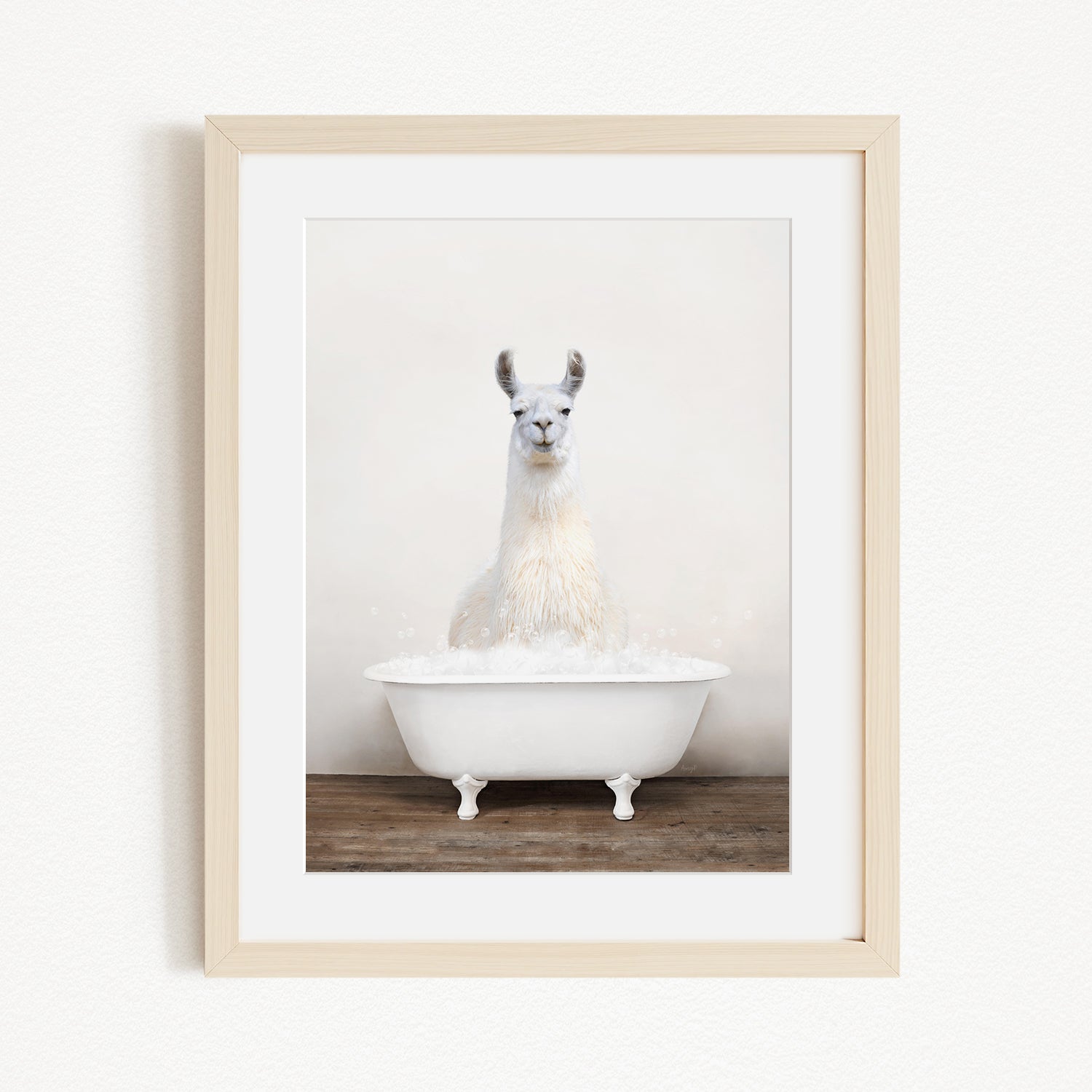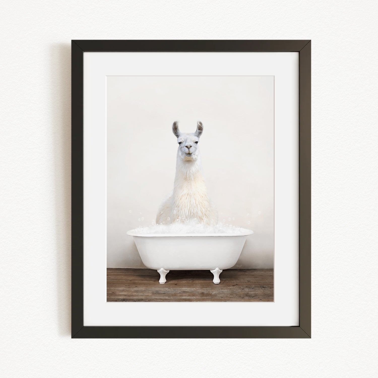 A white llama sitting in a white bathtub filled with bubbles, as depicted in the framed image.