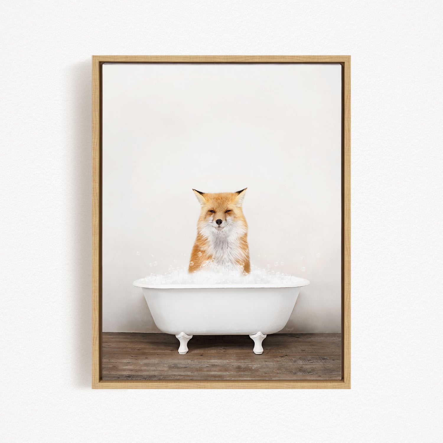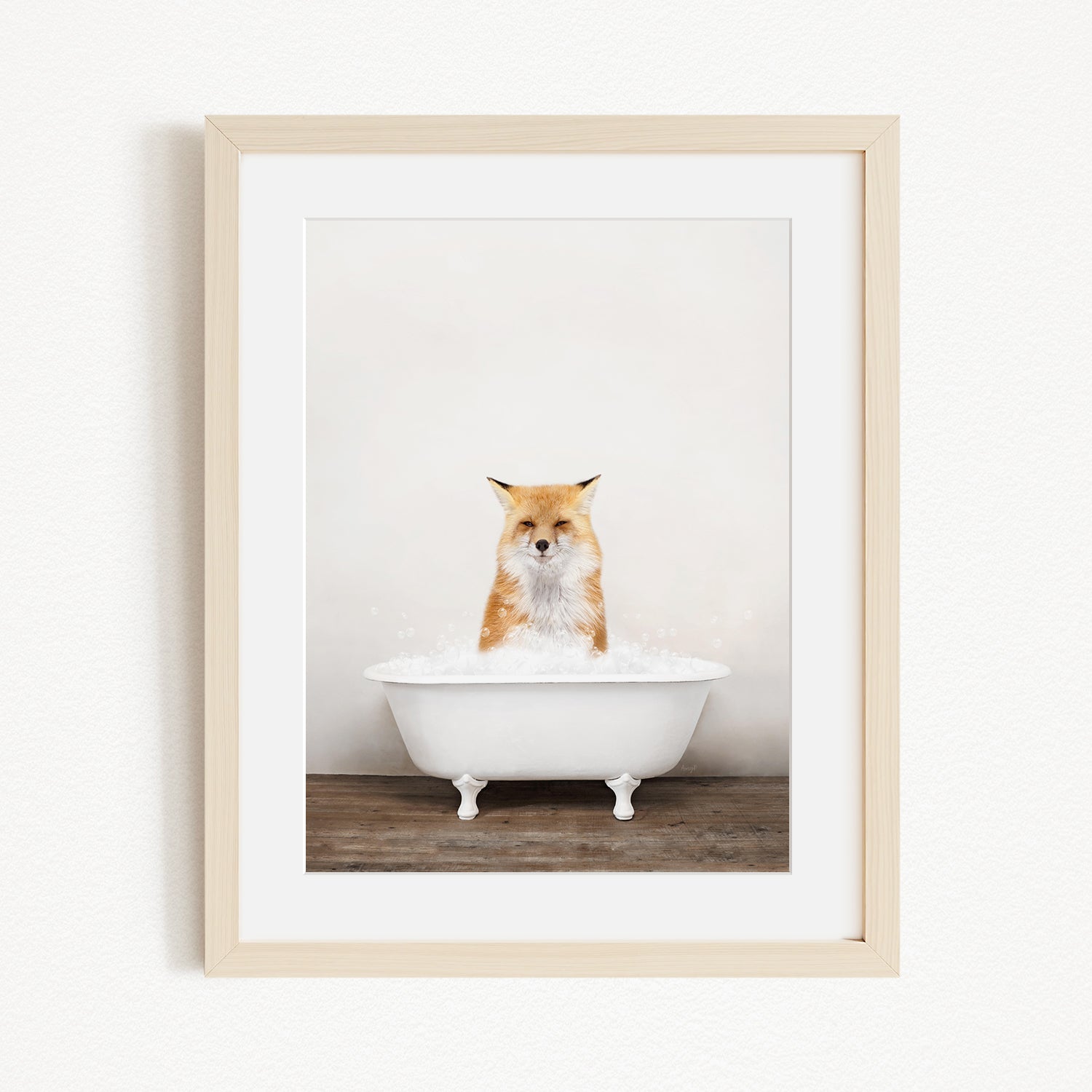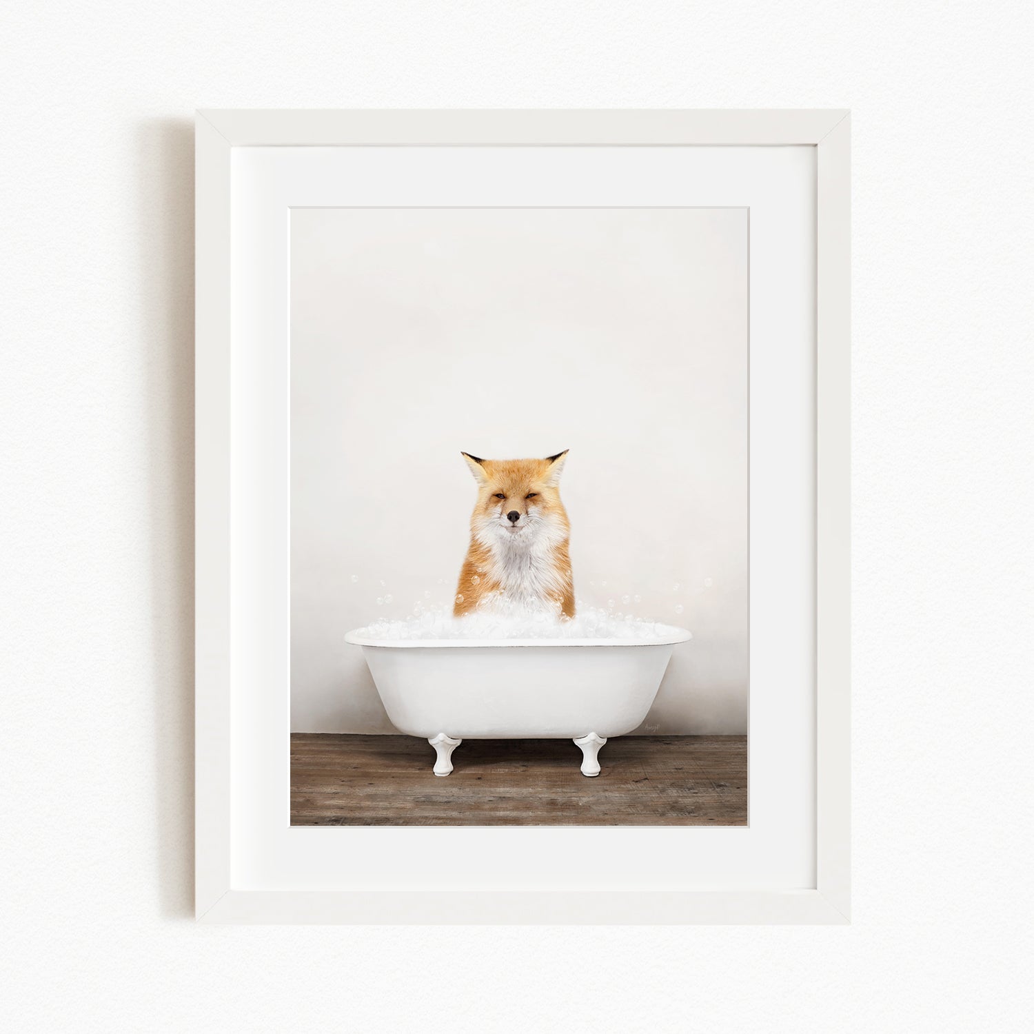 A framed image of a fox sitting in a white bathtub filled with bubbles.