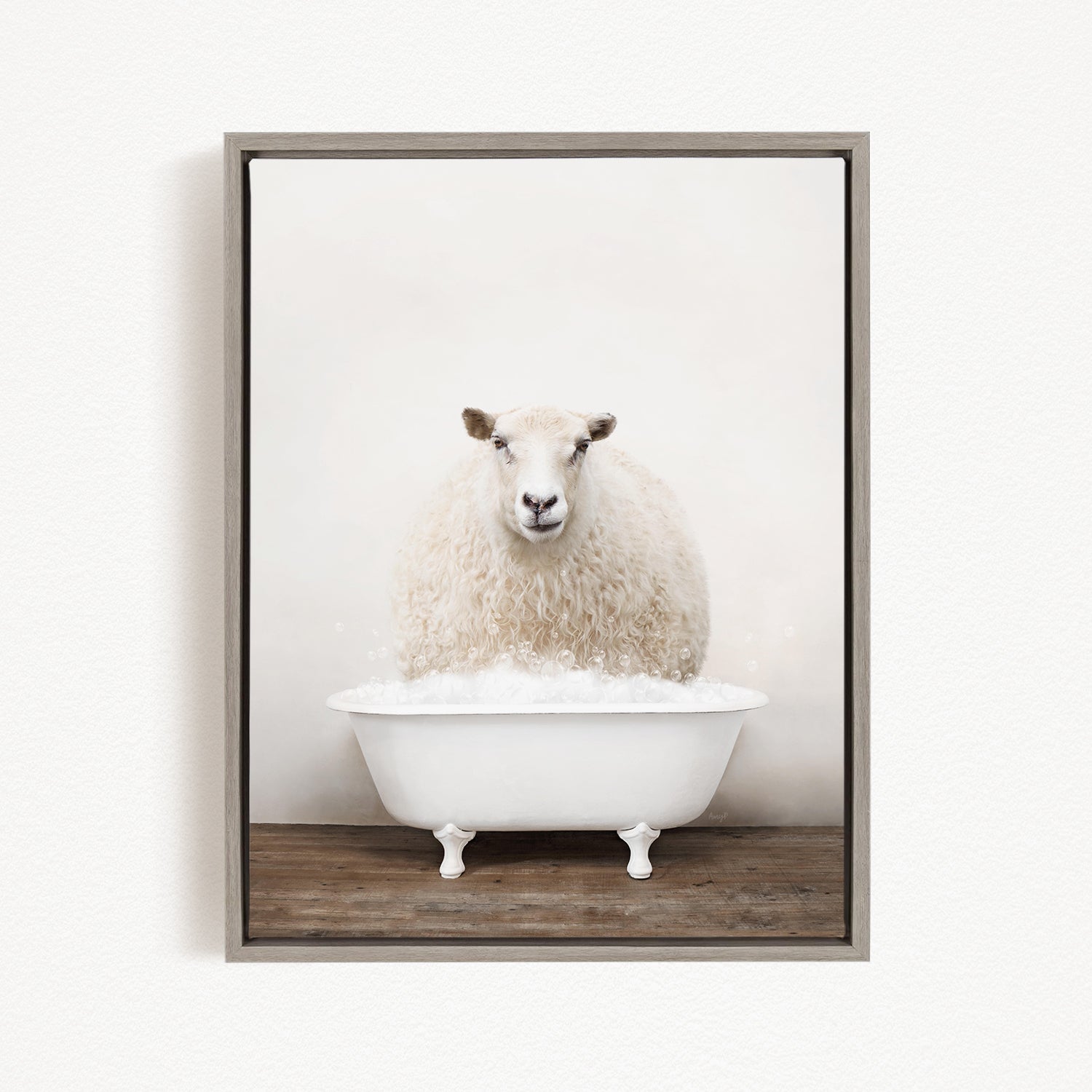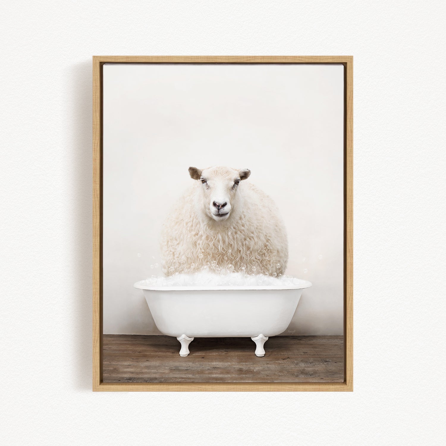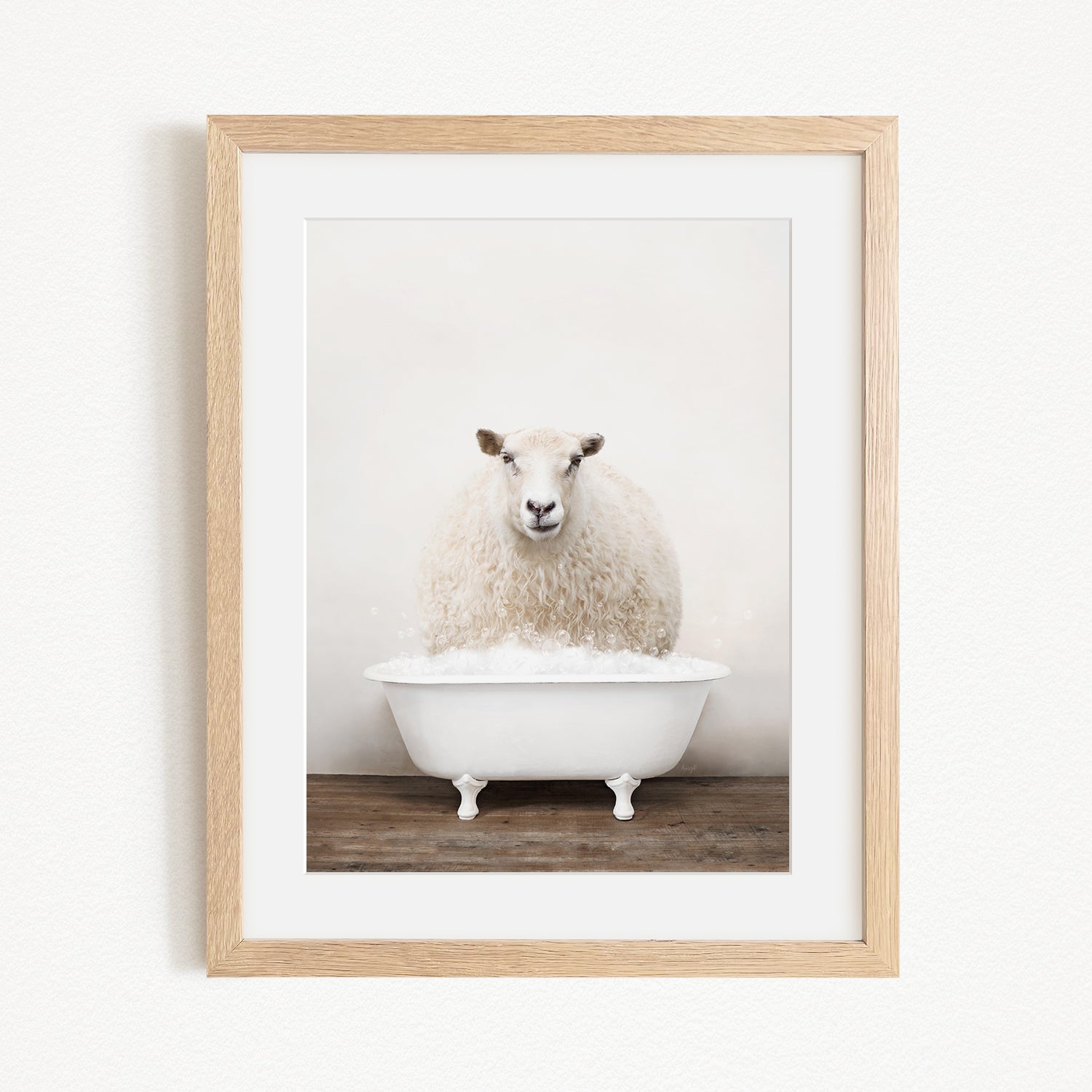 A fluffy white sheep sits in a white bathtub, surrounded by a wooden floor.