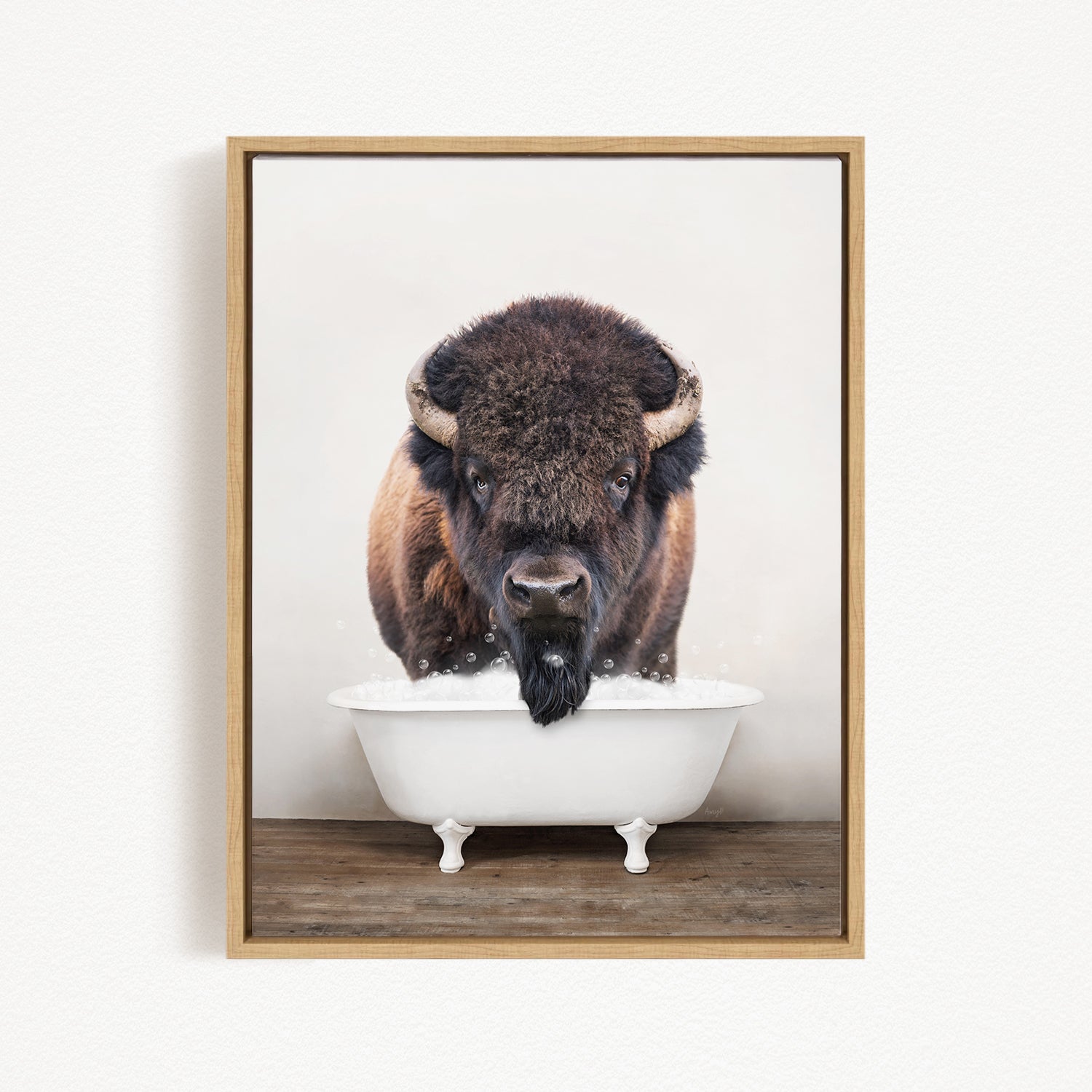 A bison with large horns is standing in a white bathtub filled with water, appearing to be enjoying a bath.
