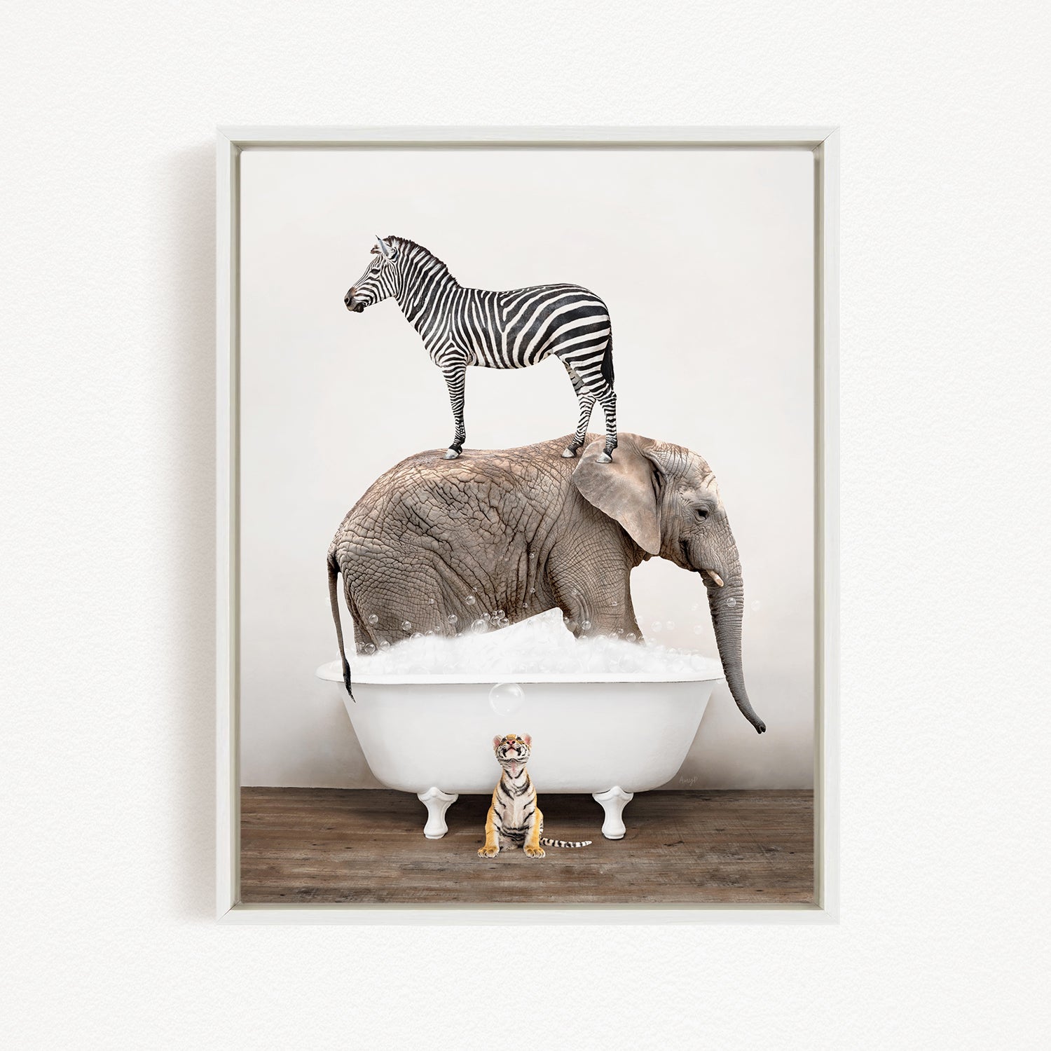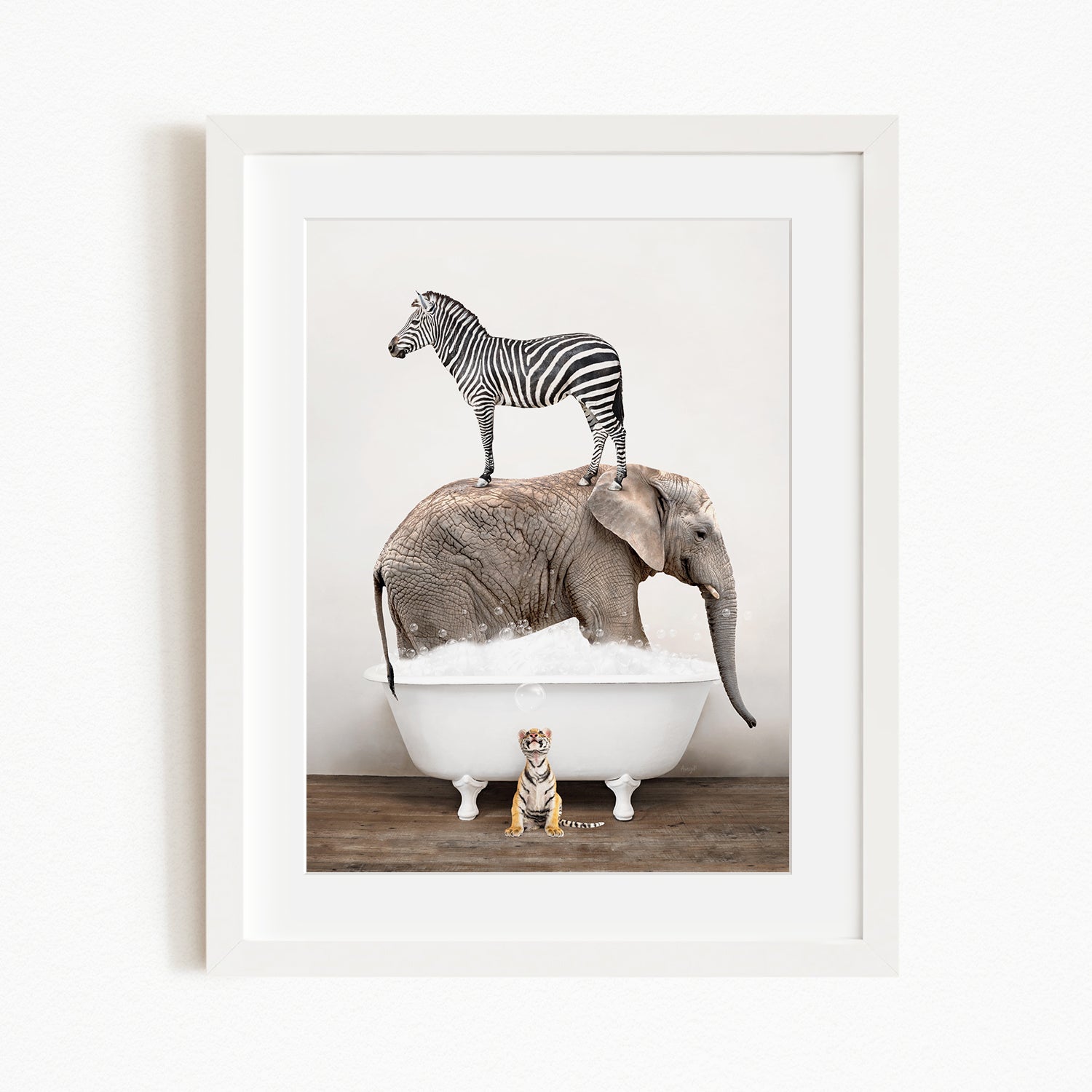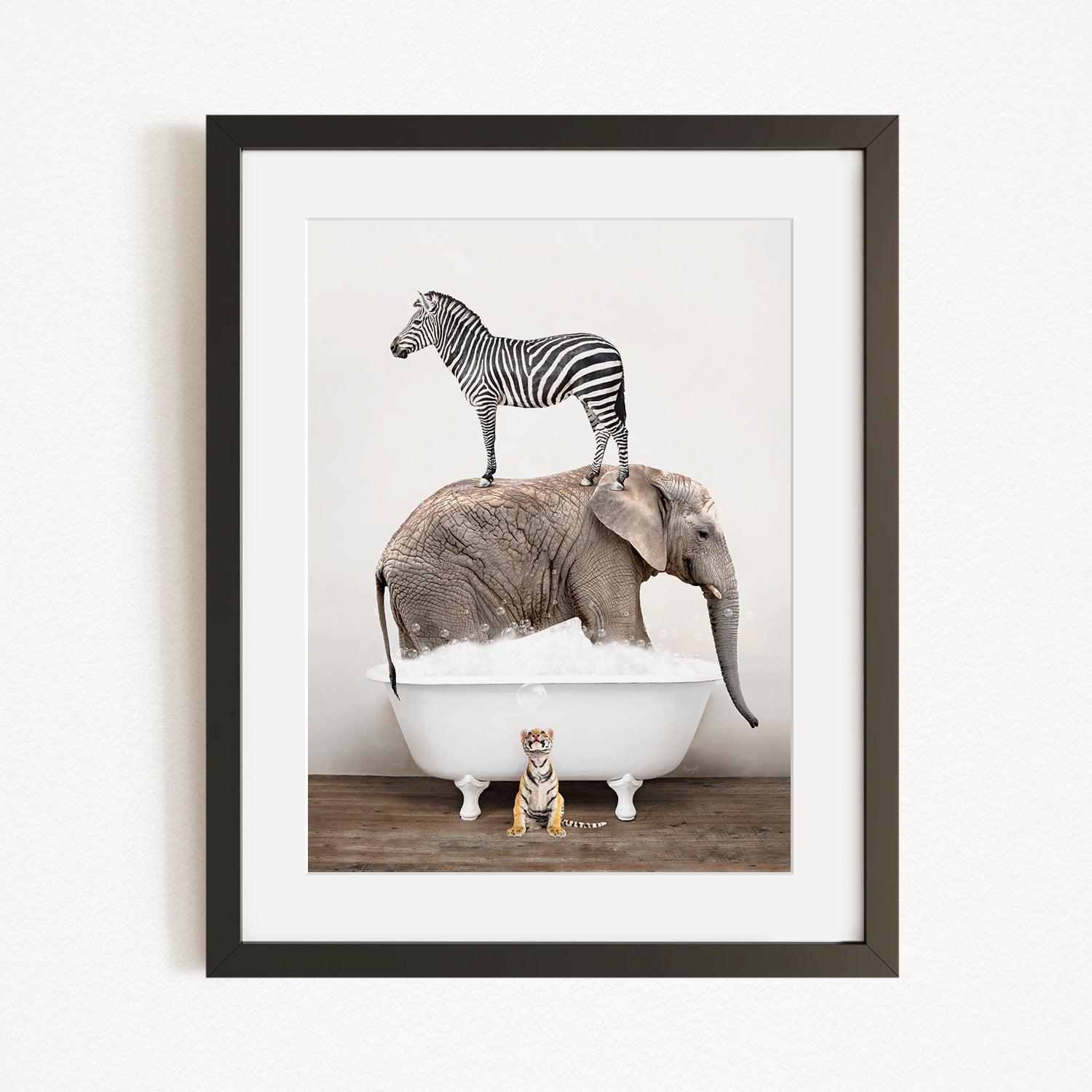 A zebra stands on the back of an elephant, which is partially submerged in a bathtub, with a small tiger figurine sitting in the tub below.