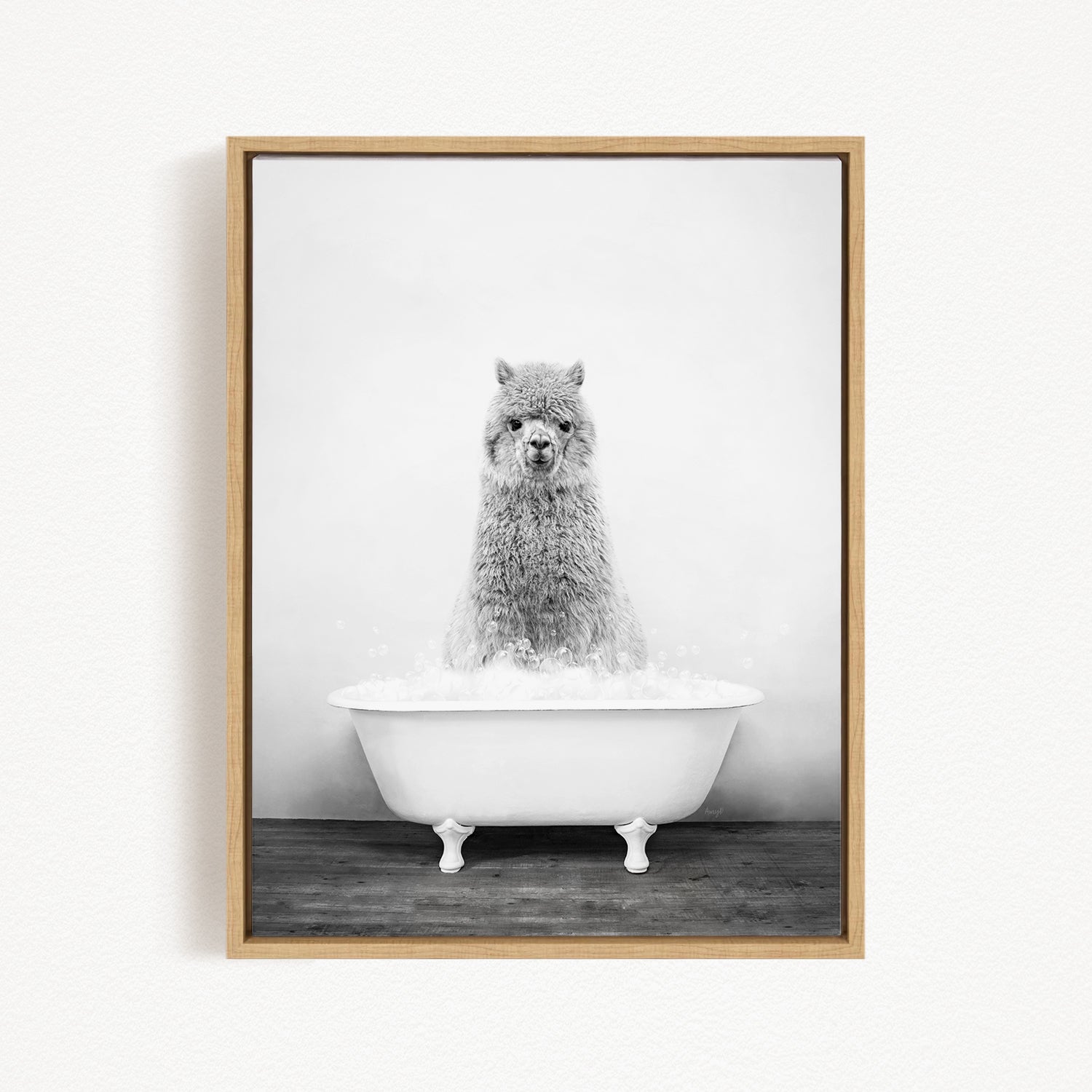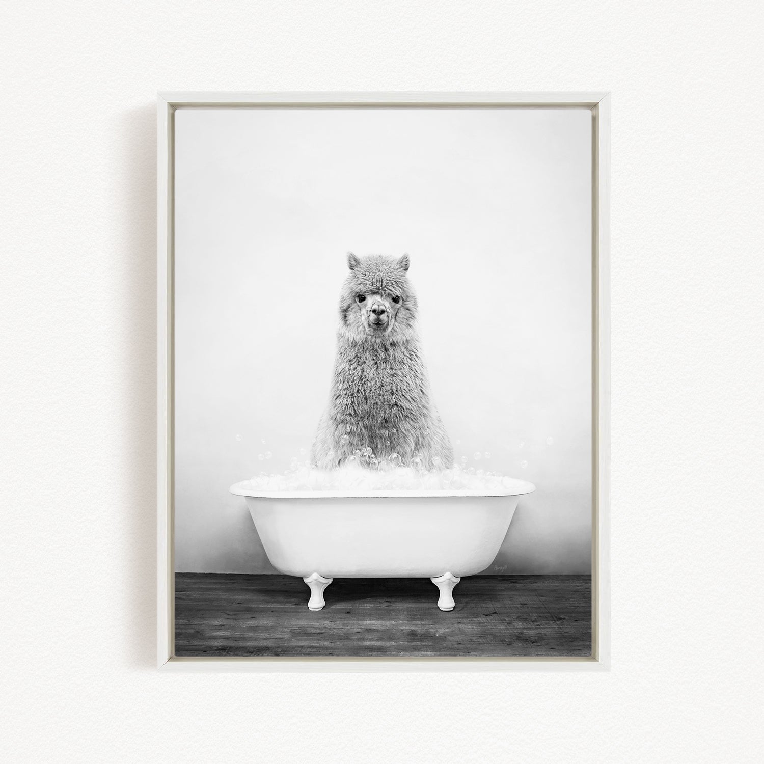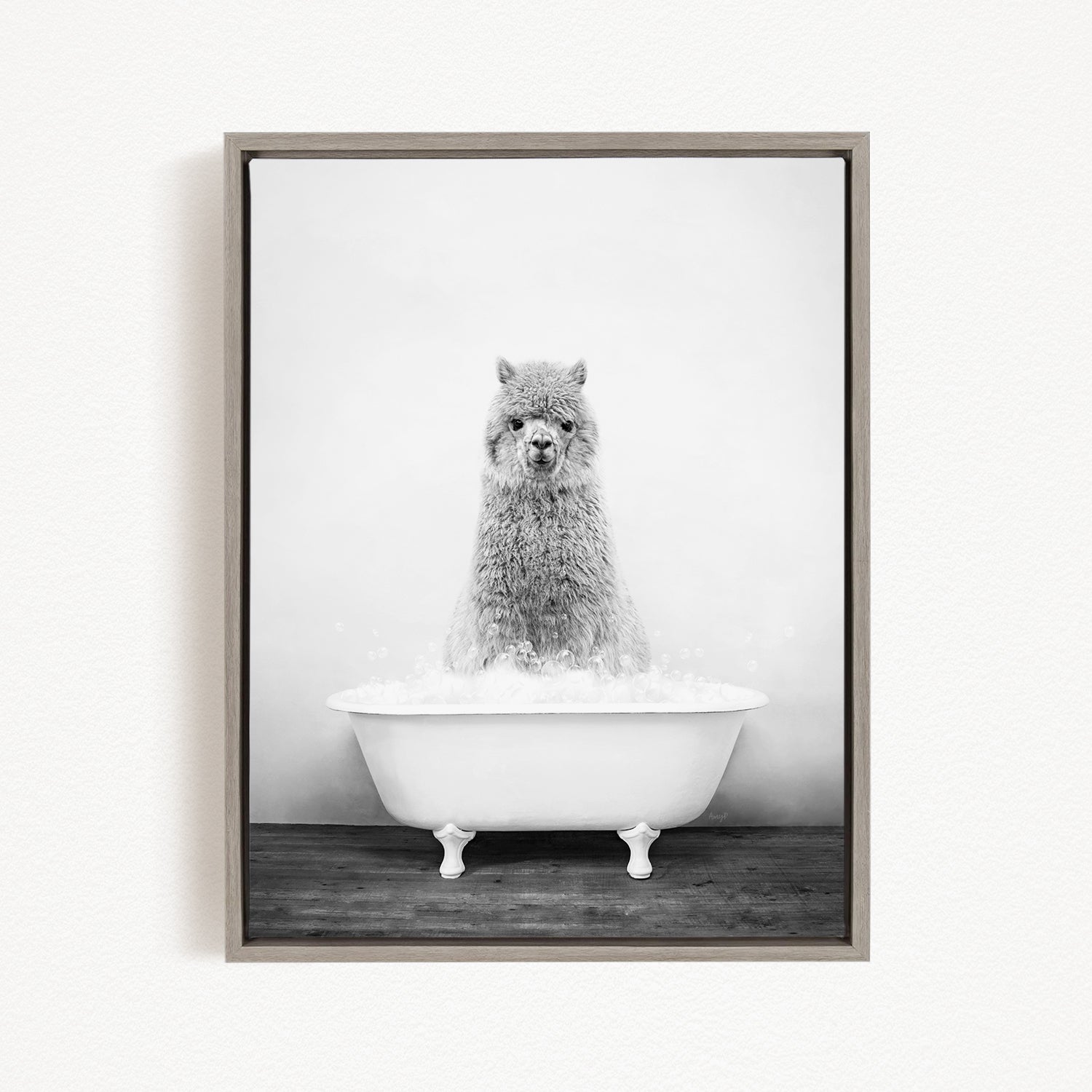 A fluffy gray alpaca sitting in a white bathtub filled with bubbles, looking directly at the camera.