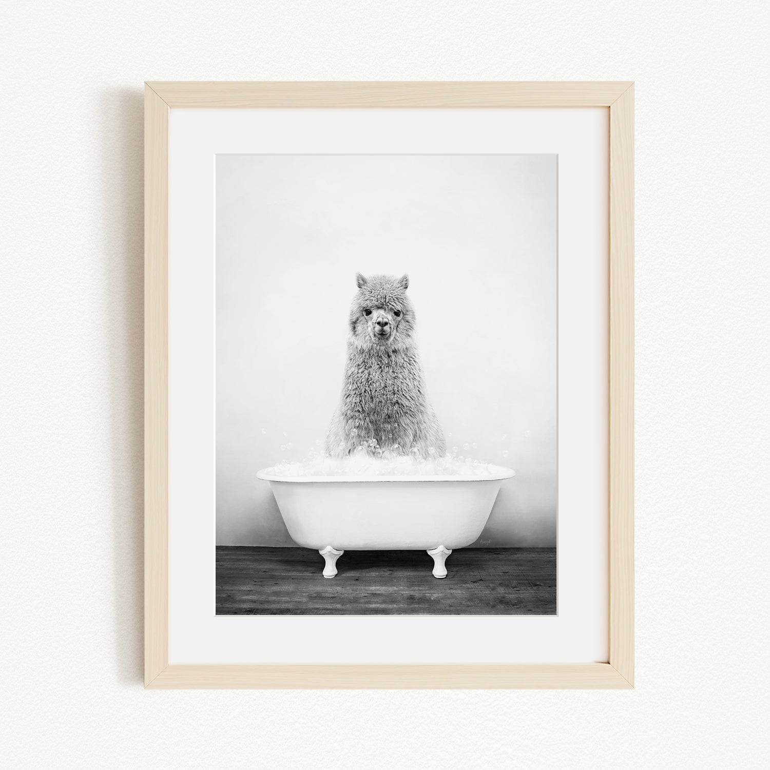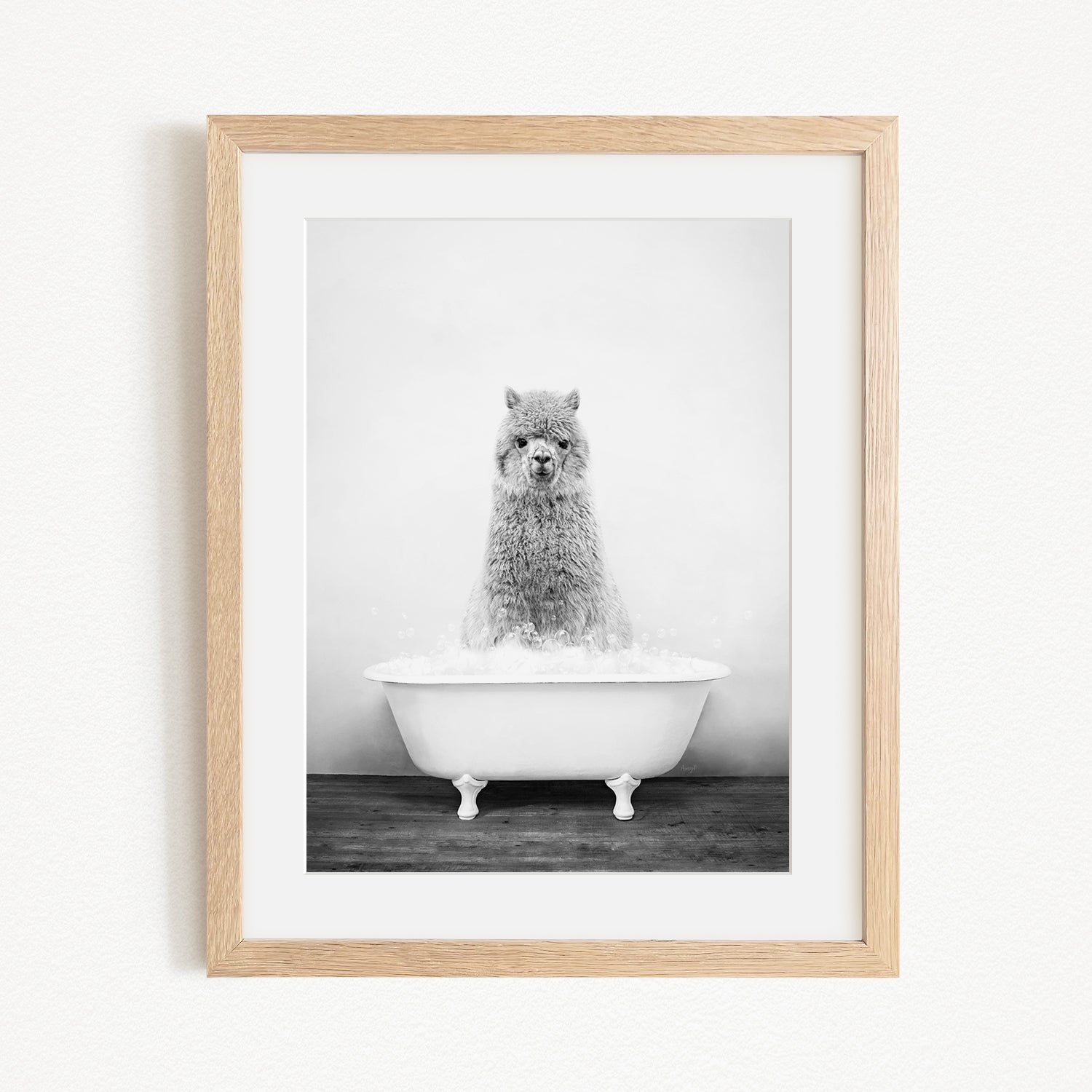 A fluffy alpaca sitting in a white bathtub filled with bubbles, looking directly at the camera.