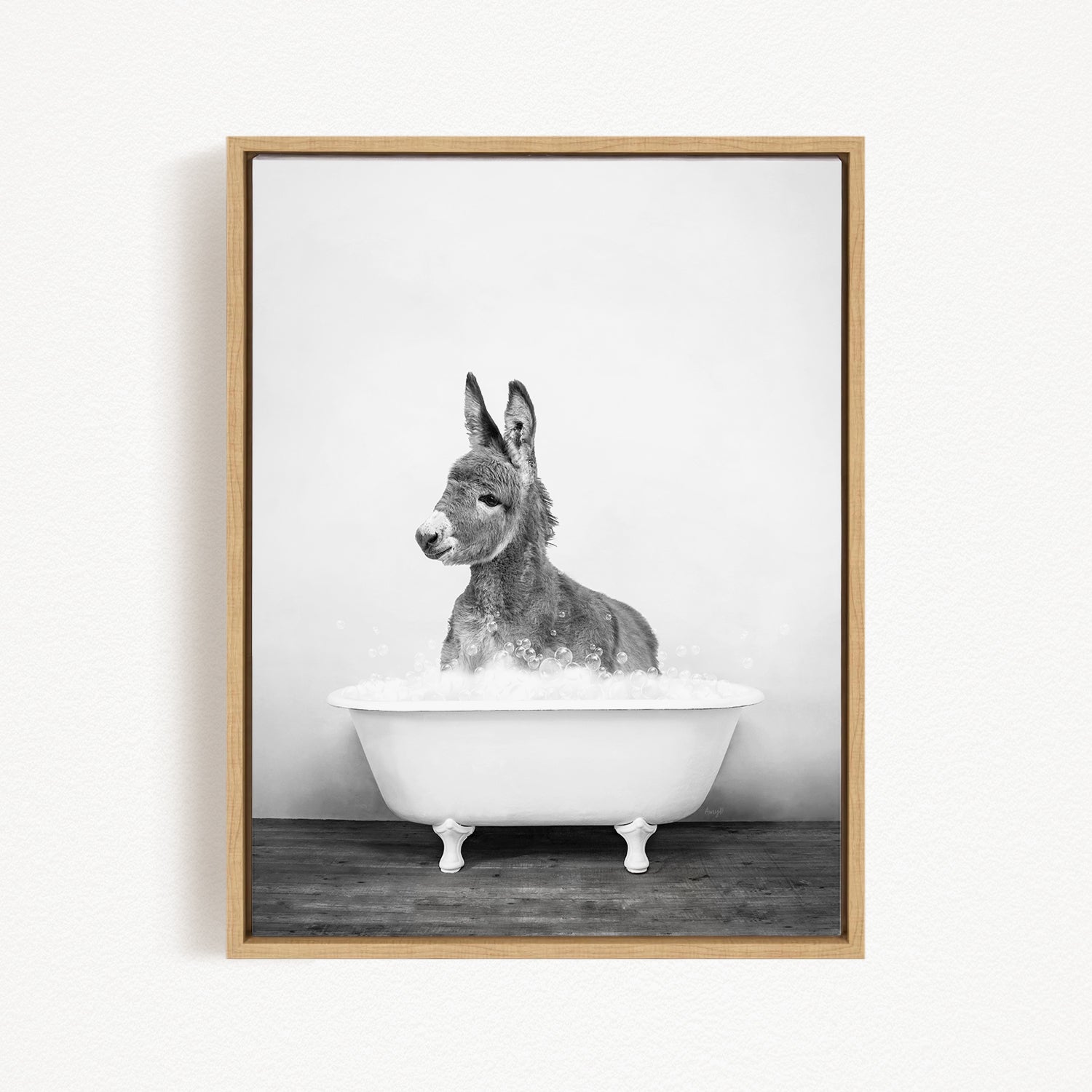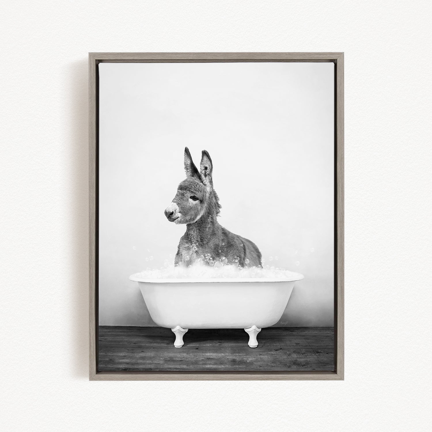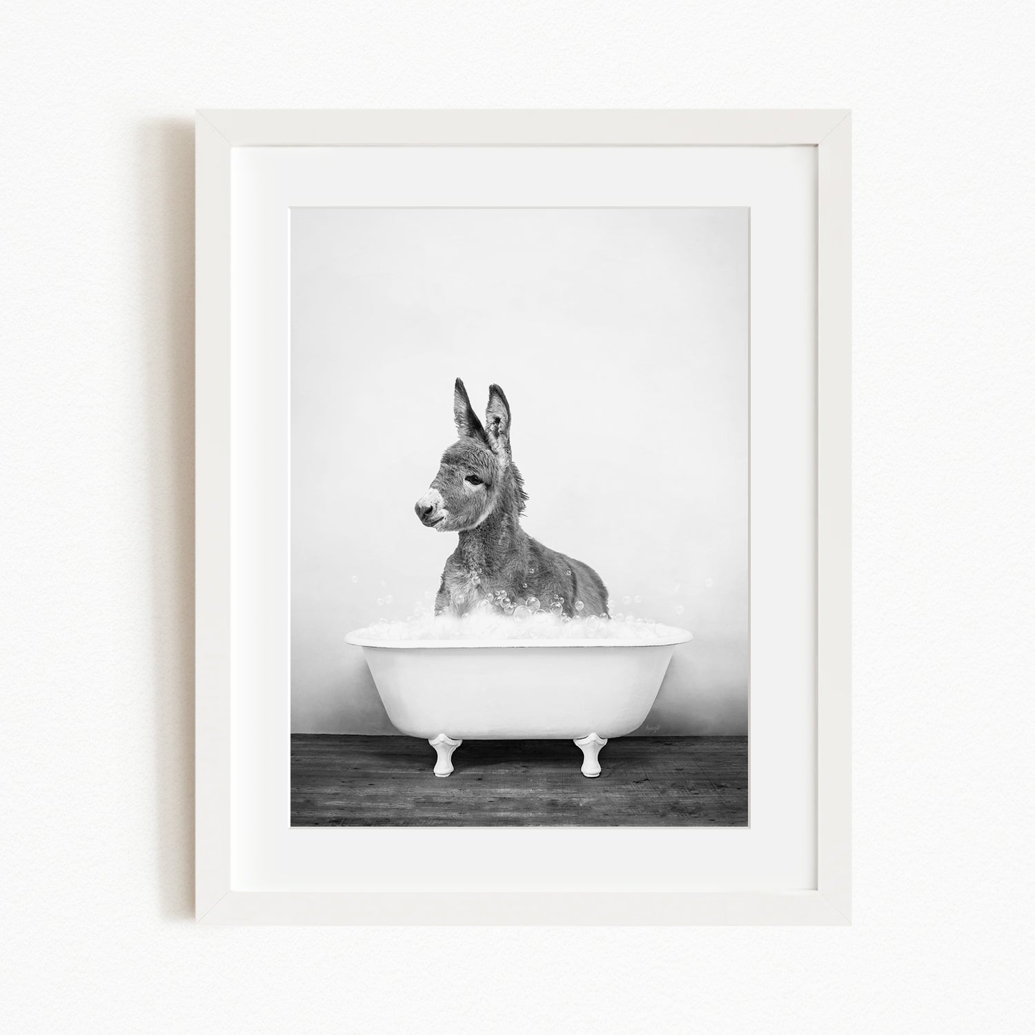 A donkey sitting in a white bathtub filled with bubbles, creating a whimsical and playful scene.