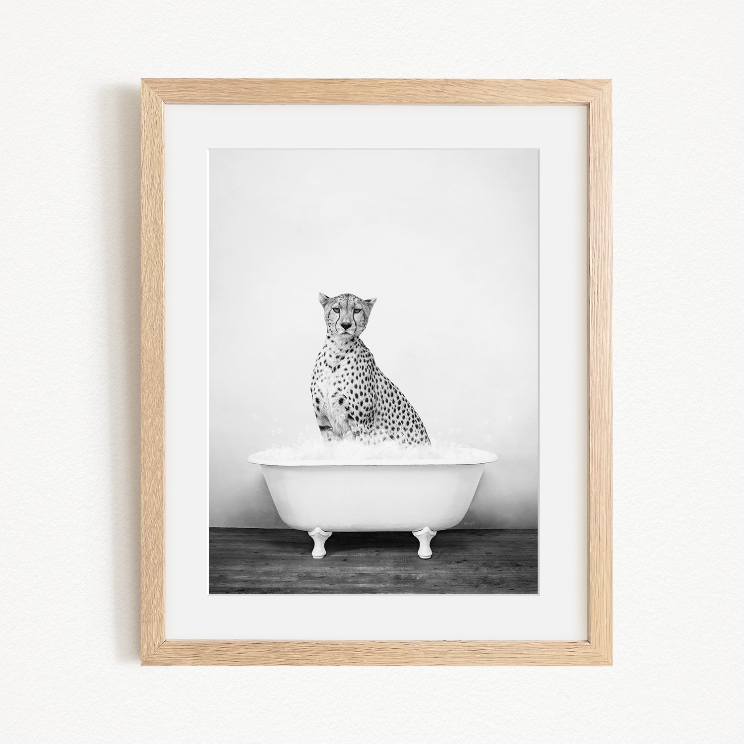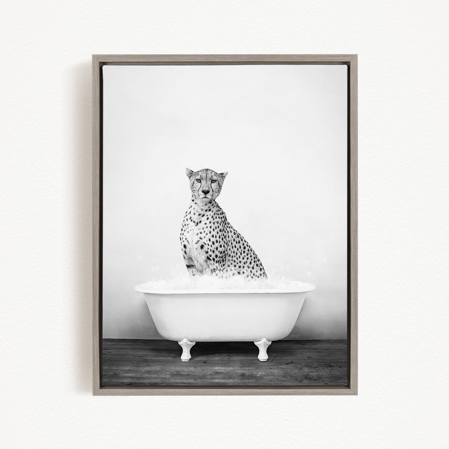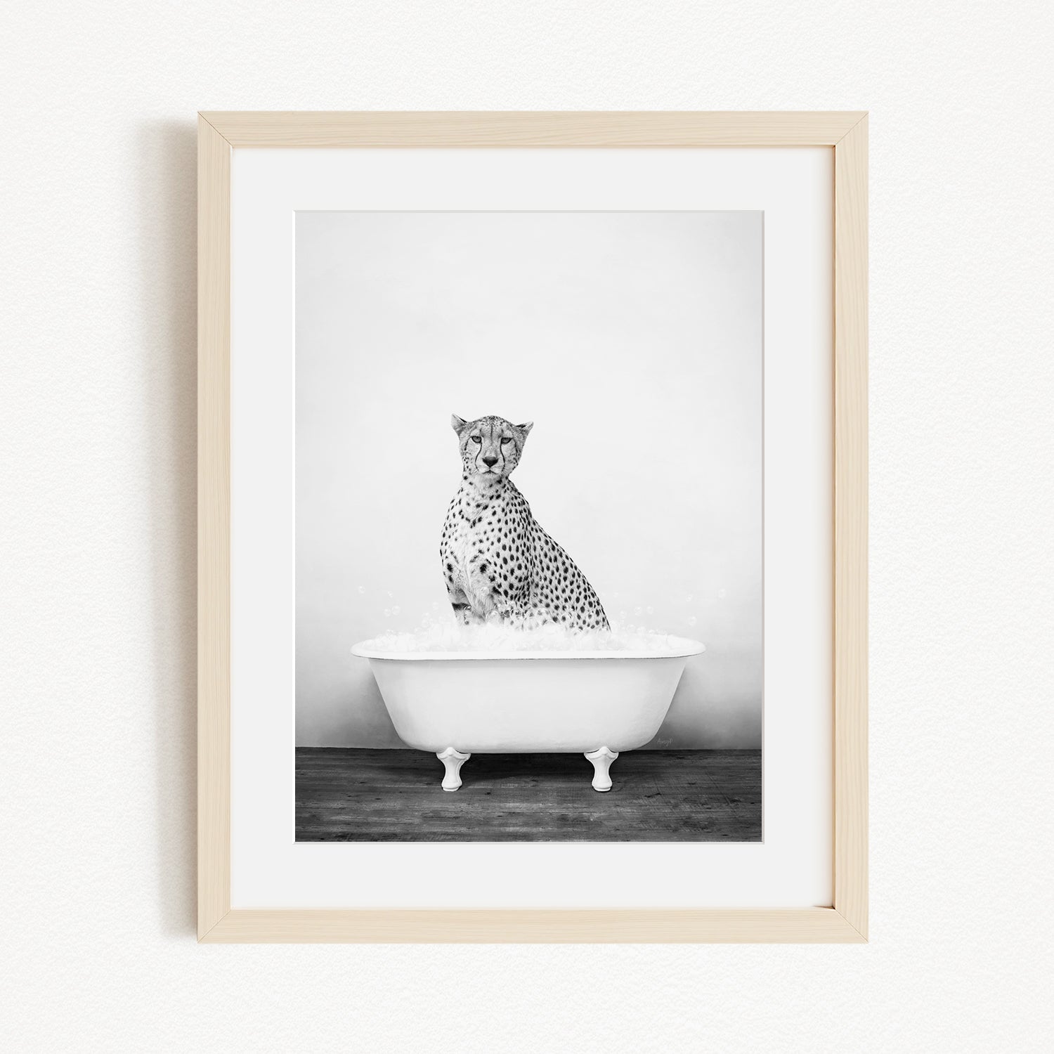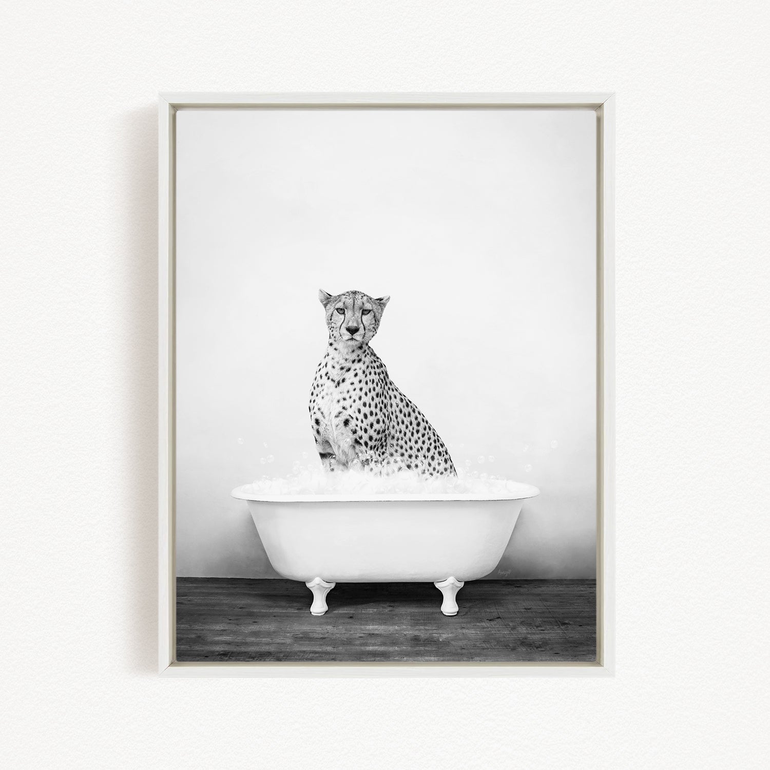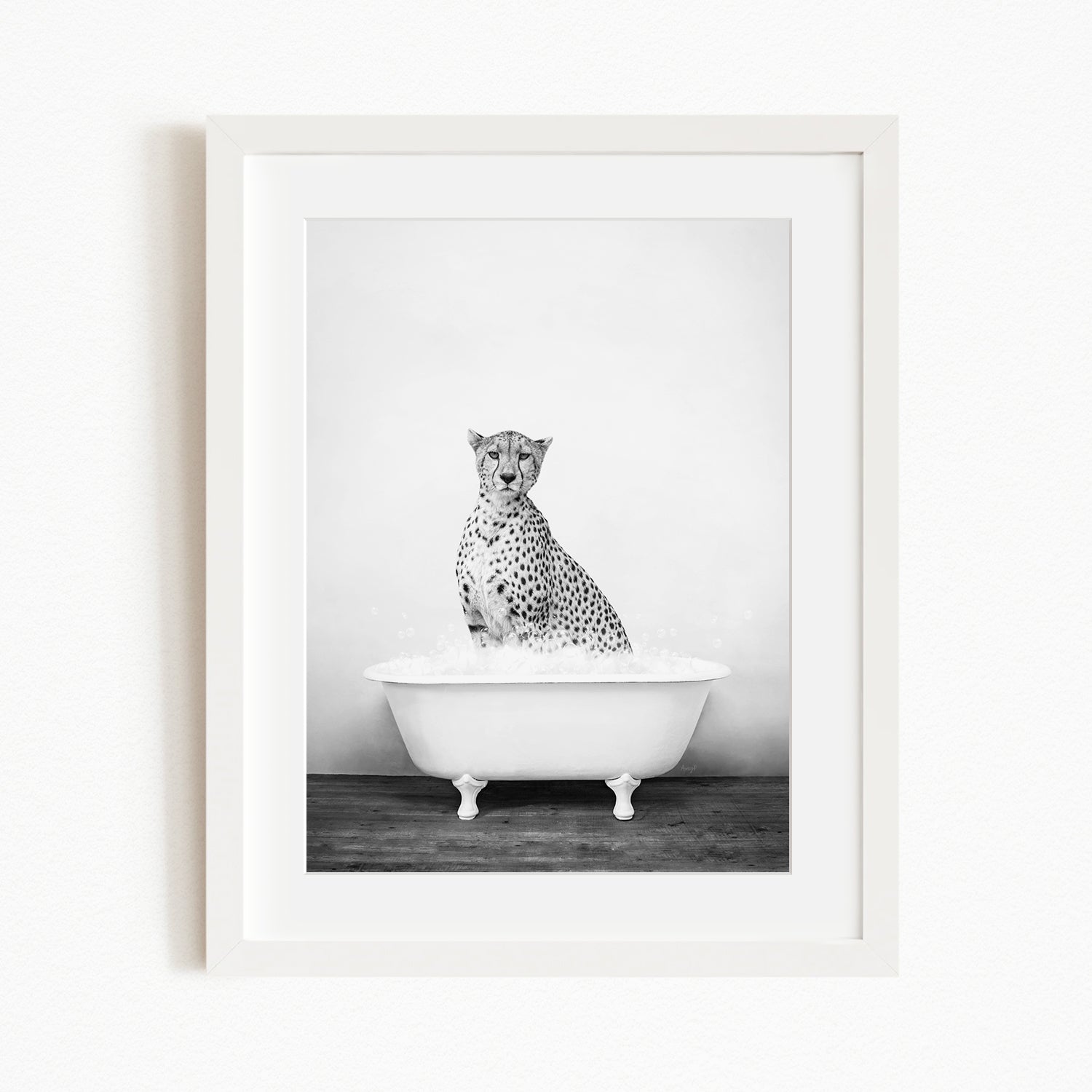 A cheetah sitting in a bathtub filled with water, as depicted in a framed black and white photograph.