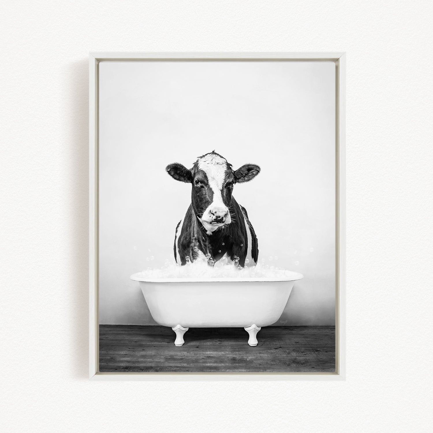 A black and white image of a cow standing in a bathtub filled with water.