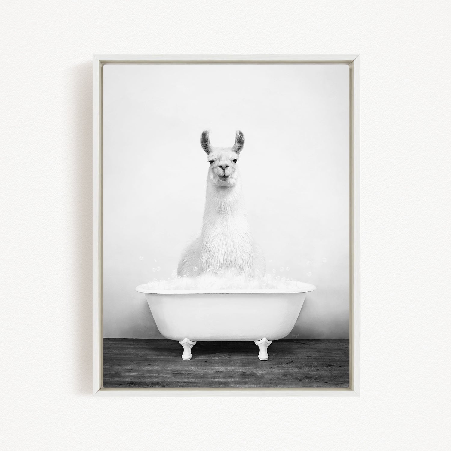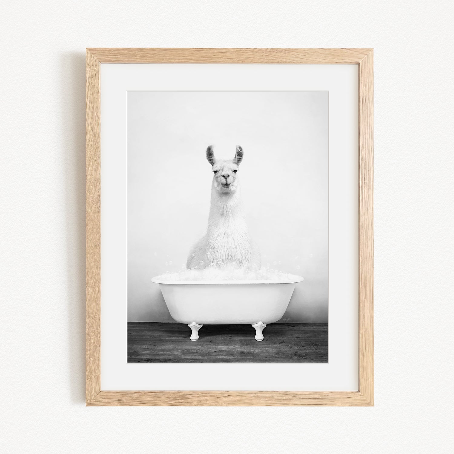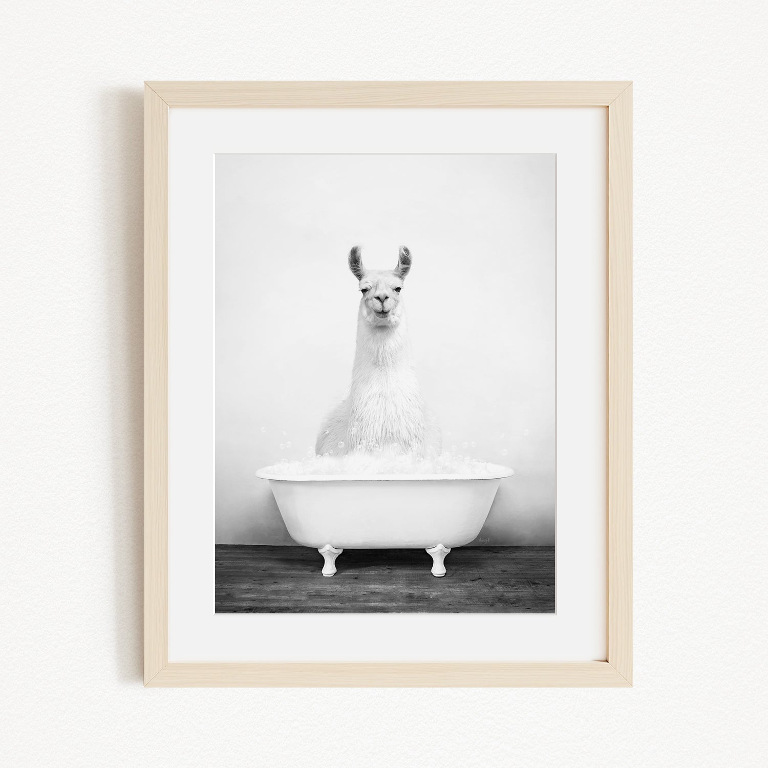 A black and white photograph of a llama sitting in a white bathtub filled with bubbles.