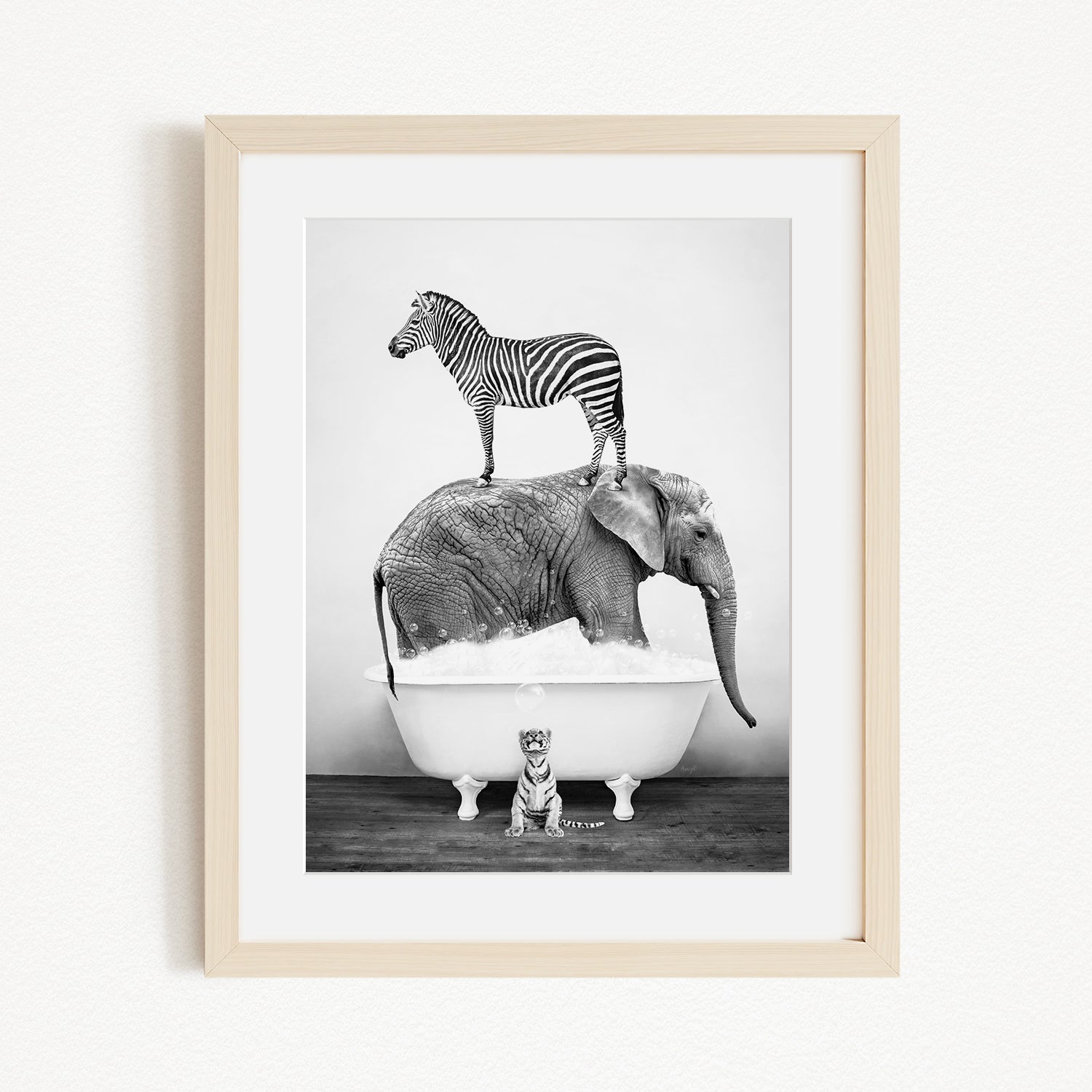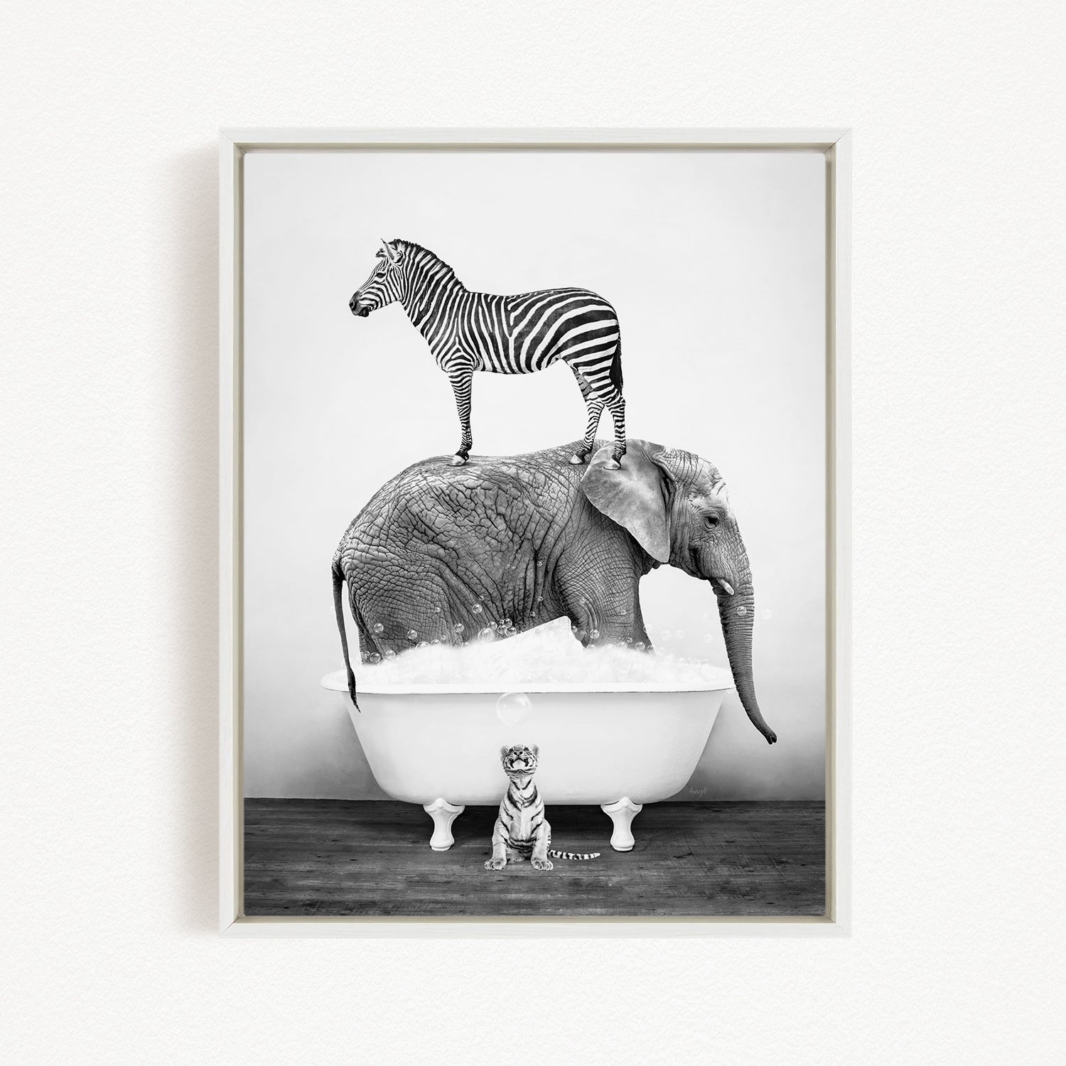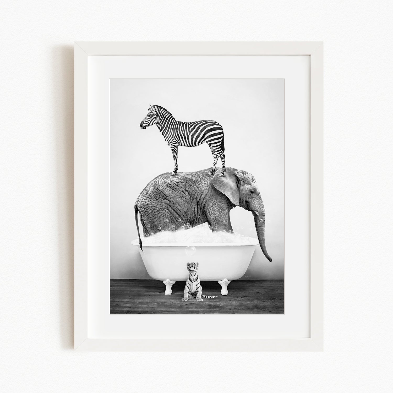A zebra stands atop an elephant in a bathtub, with a small tiger sitting in the tub below.