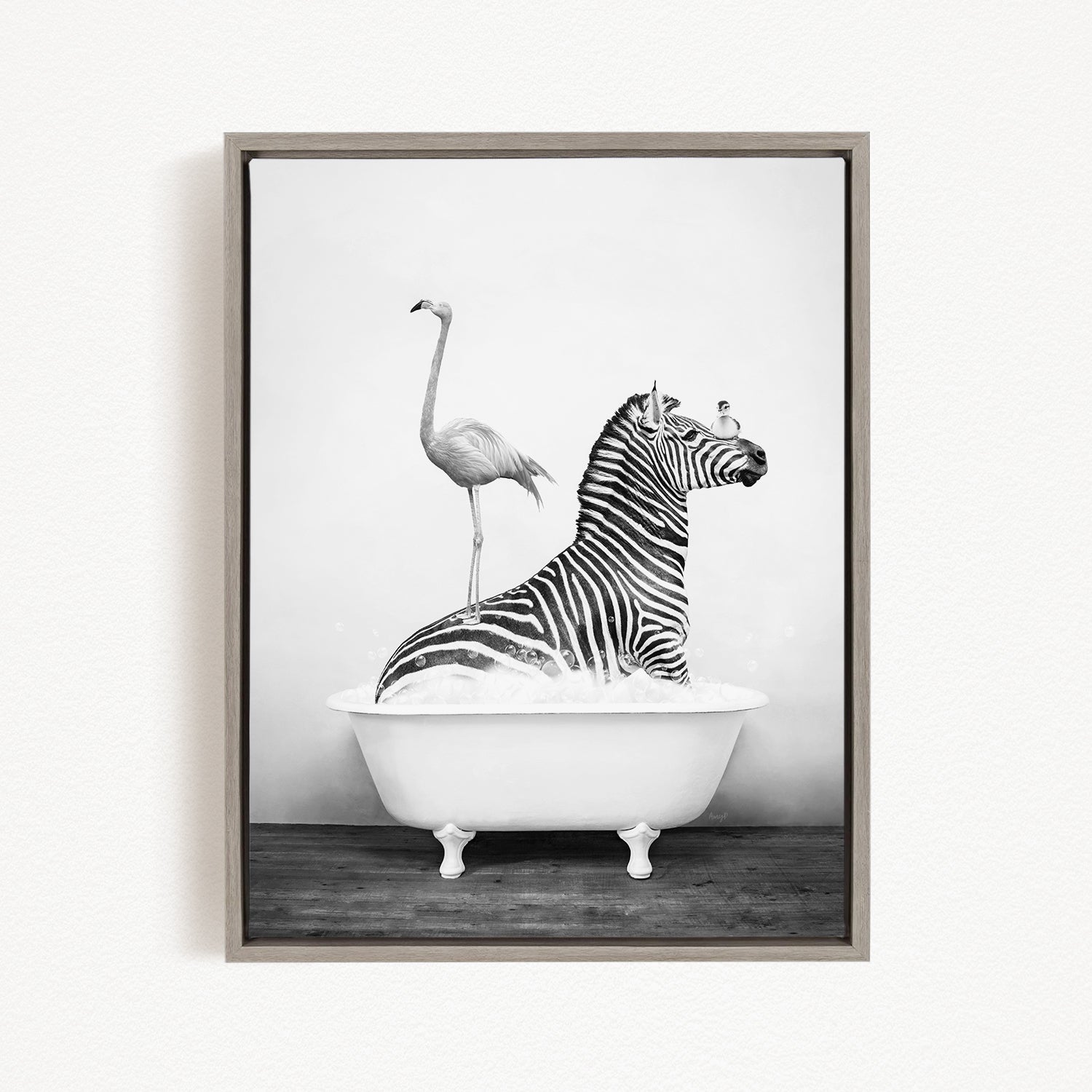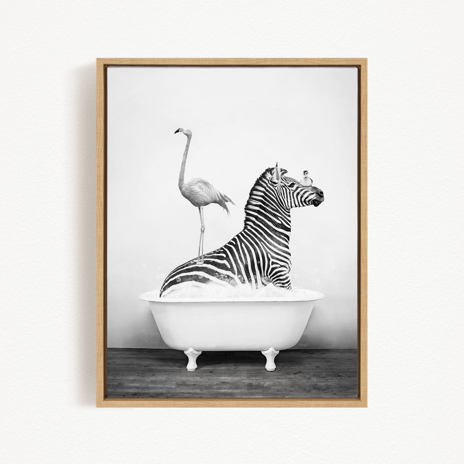 A zebra is sitting in a bathtub filled with water, with a flamingo standing on its back legs and a bird perched on its head.