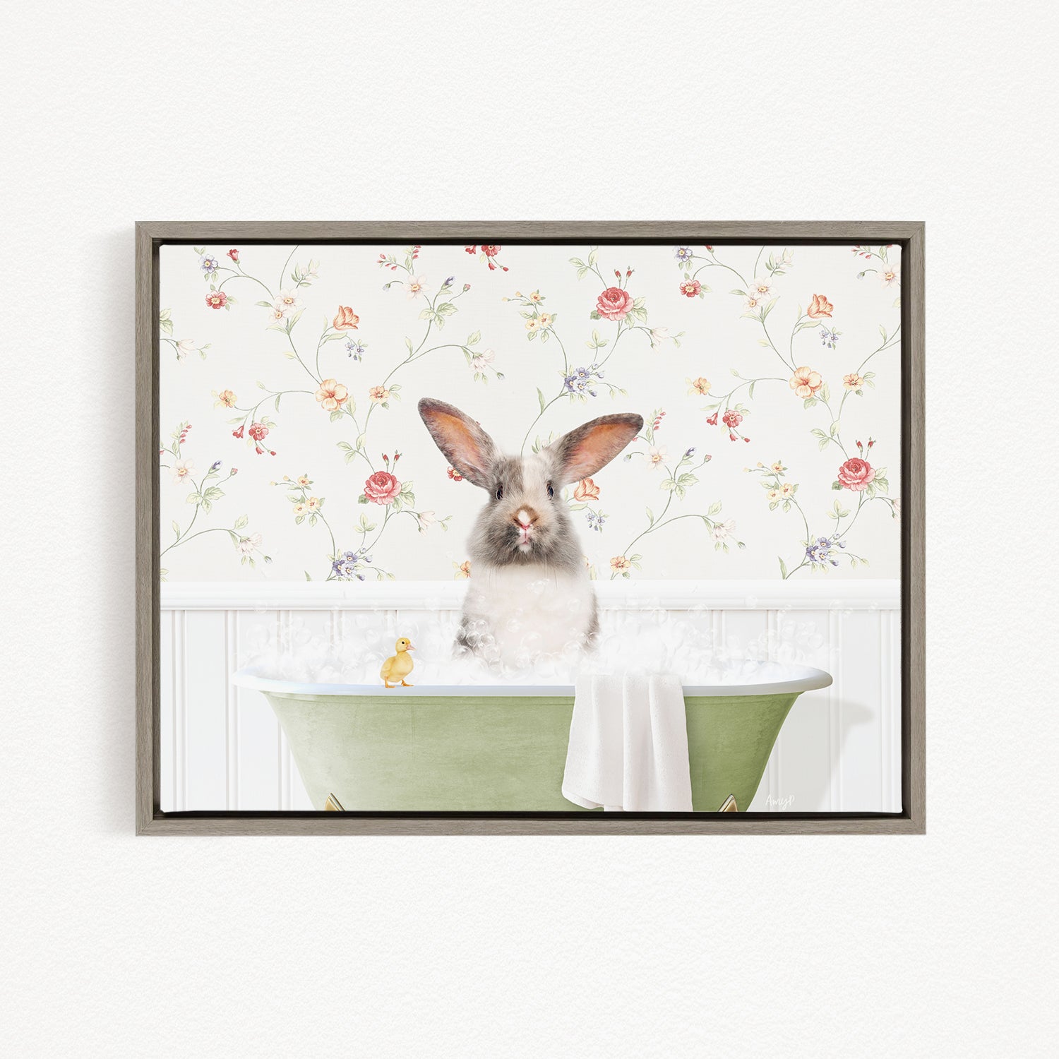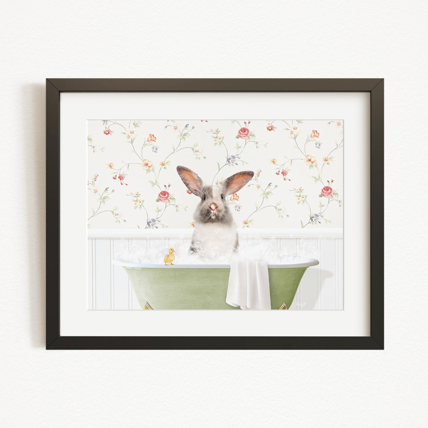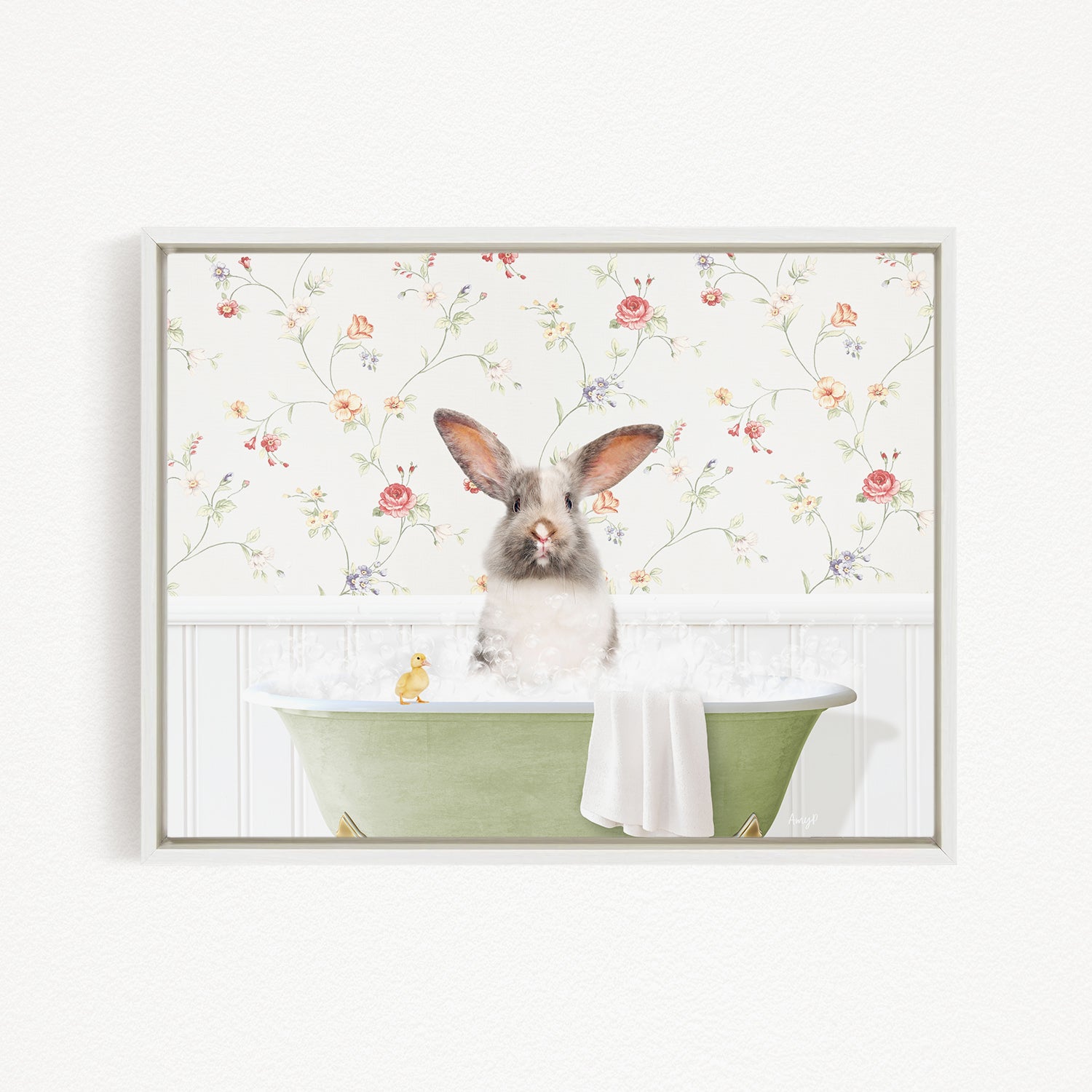 A fluffy white rabbit sits in a green bathtub, surrounded by a floral wallpaper and a yellow duck.