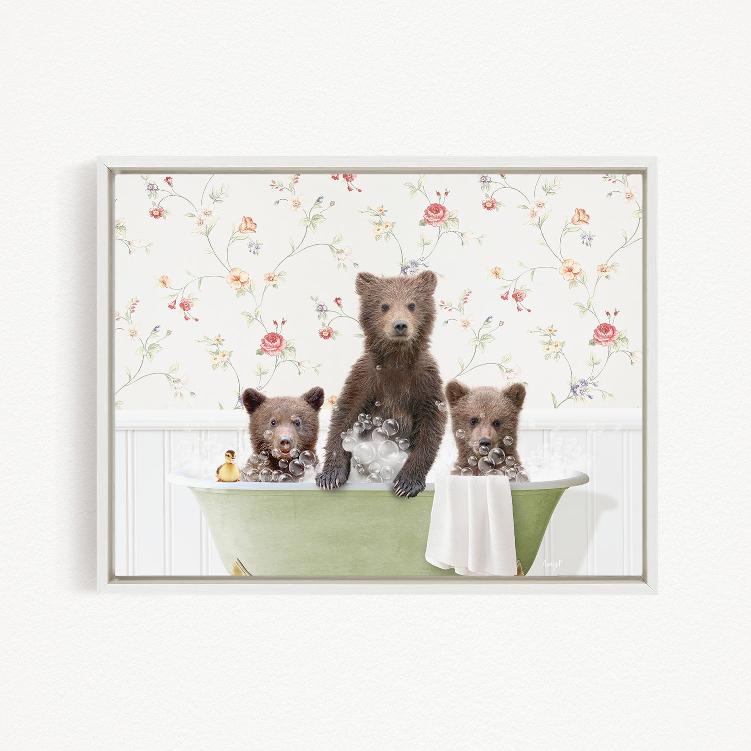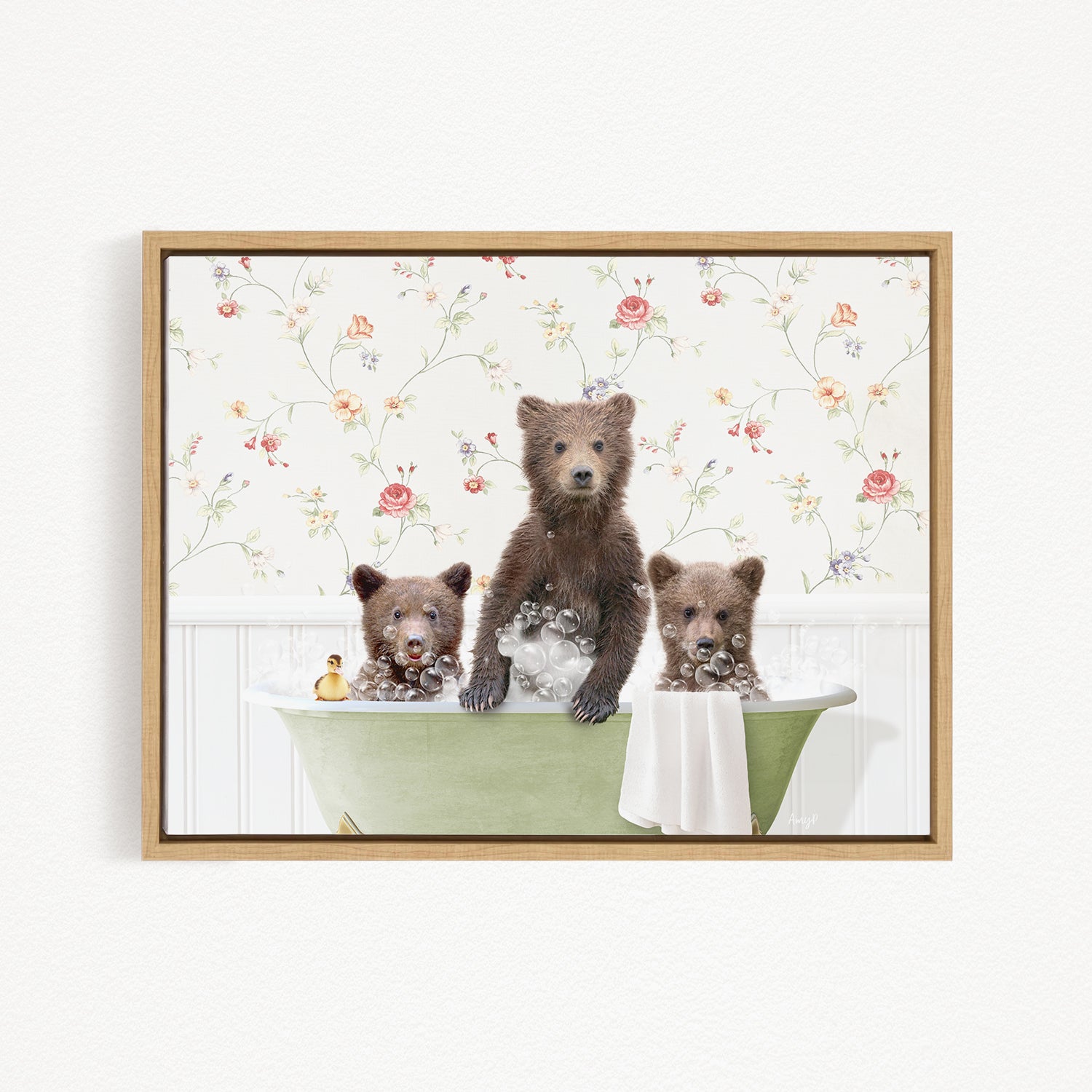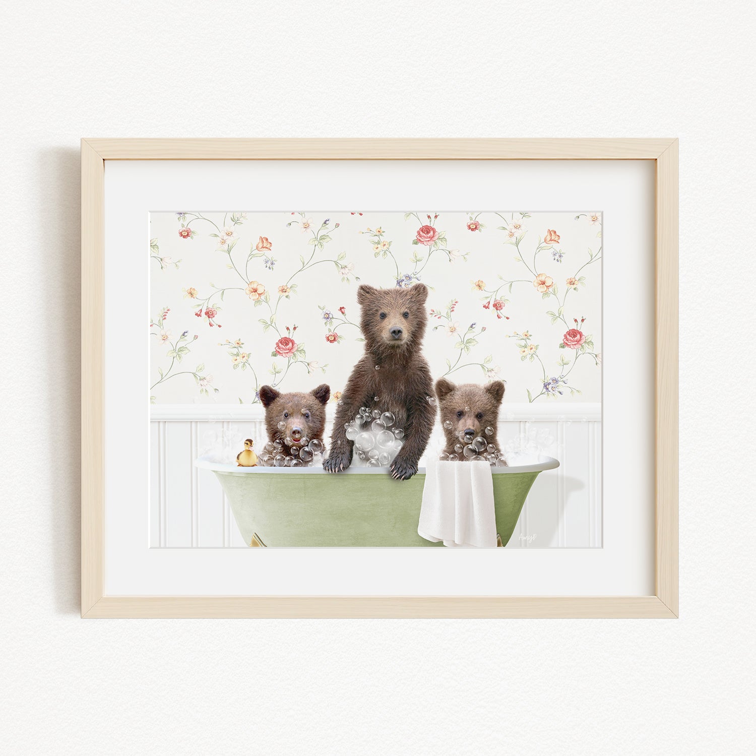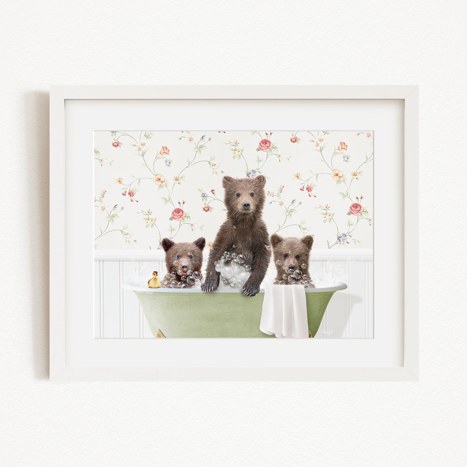 A framed image depicting three bears sitting in a green bathtub, with a floral pattern on the wall behind them.