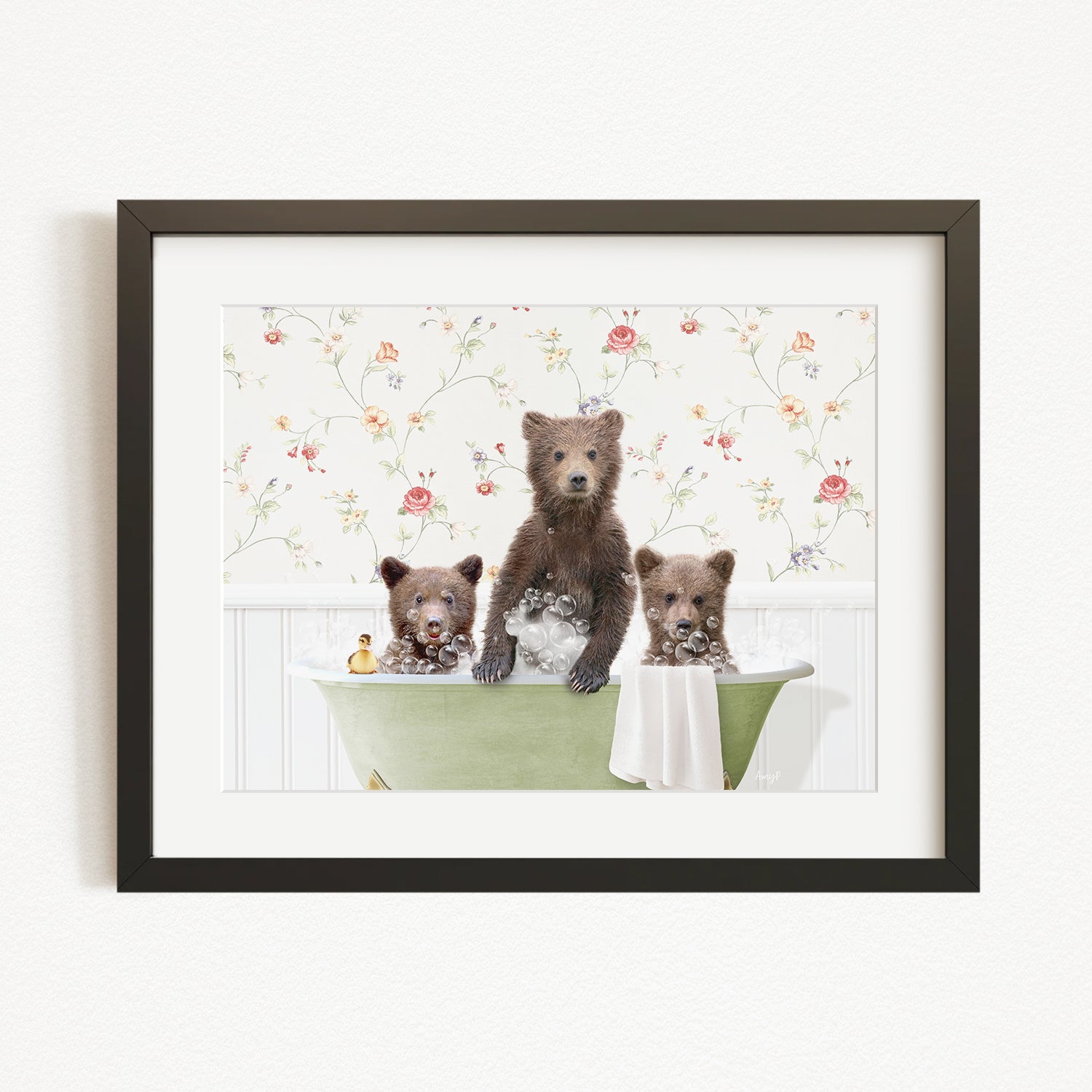 A framed image depicting three bears sitting in a green bathtub, with one bear standing and the other two sitting.