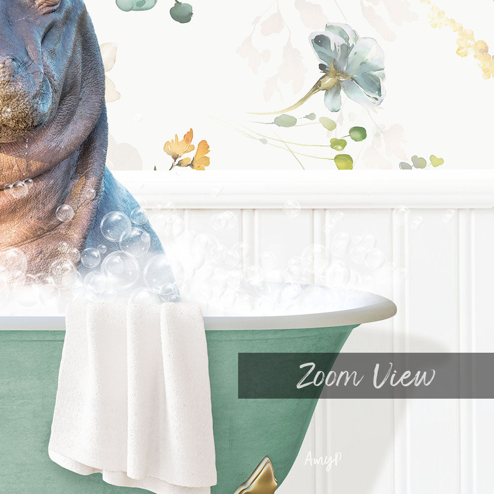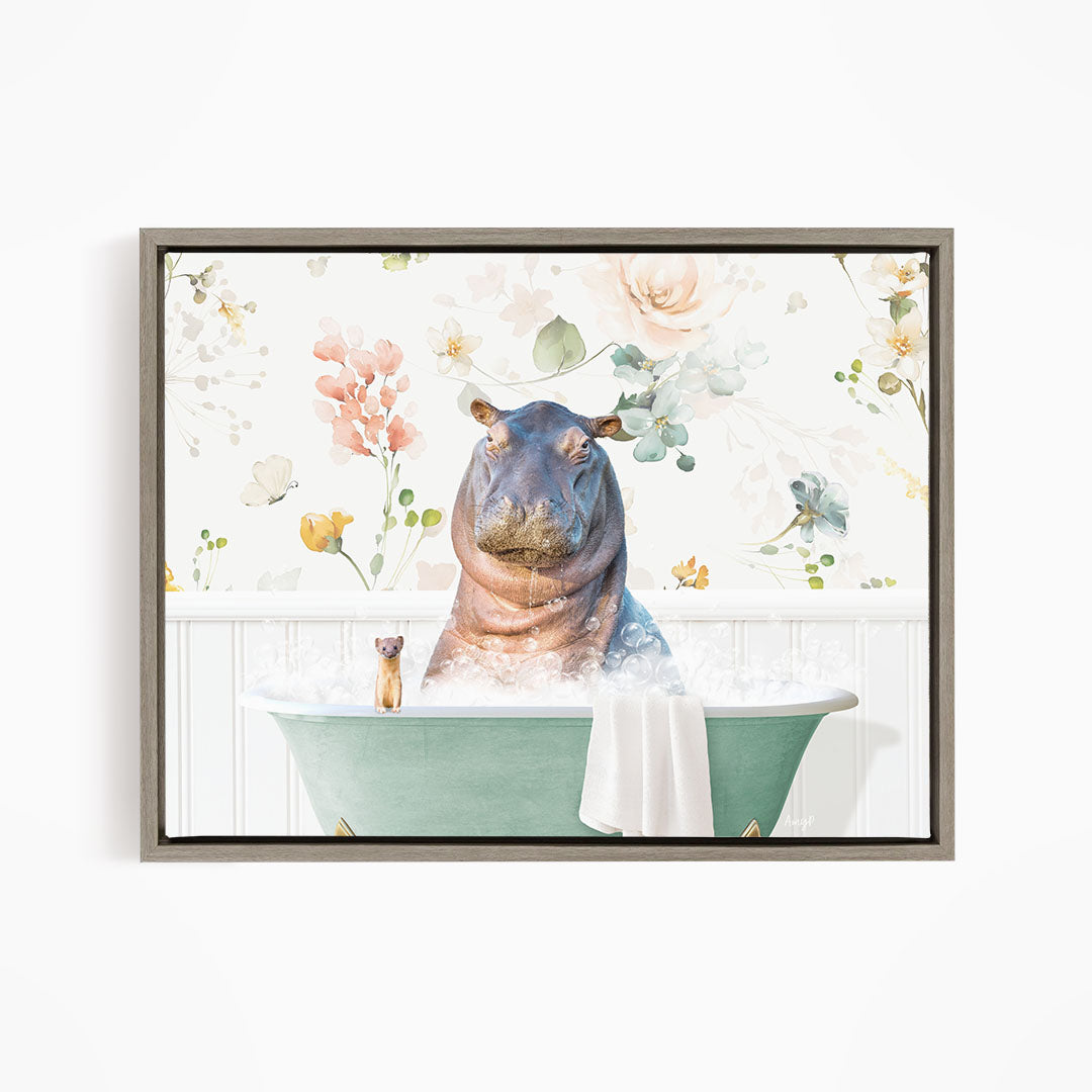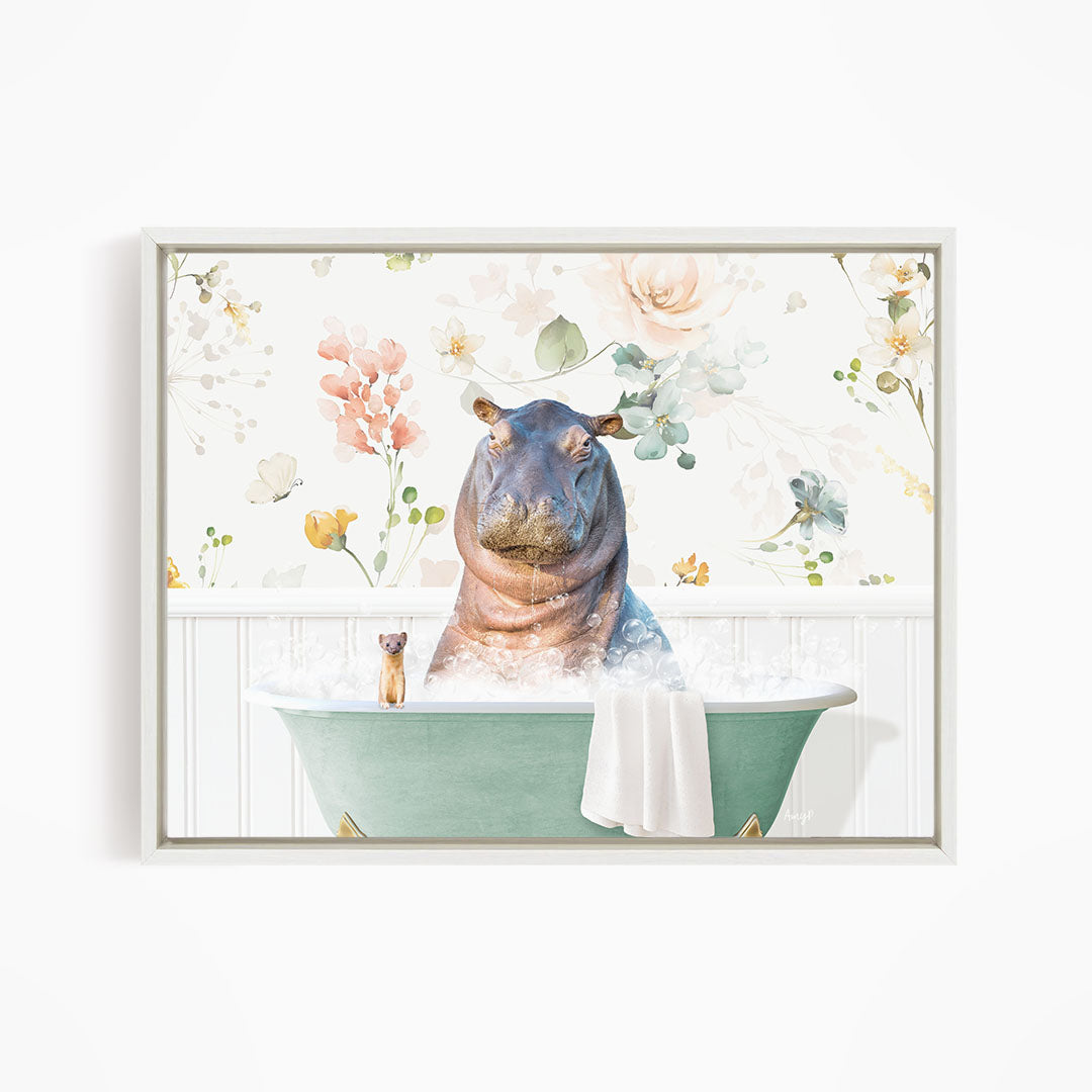 A framed print depicting a hippopotamus sitting in a bathtub filled with water, surrounded by flowers and other decorative elements.