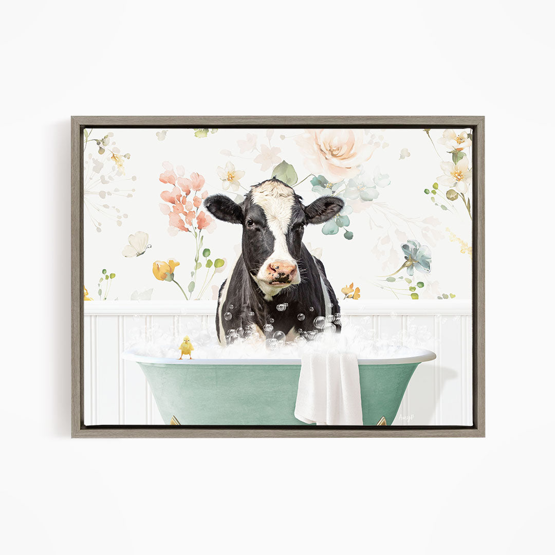 A black and white cow is sitting in a green bathtub filled with bubbles, surrounded by a floral pattern.