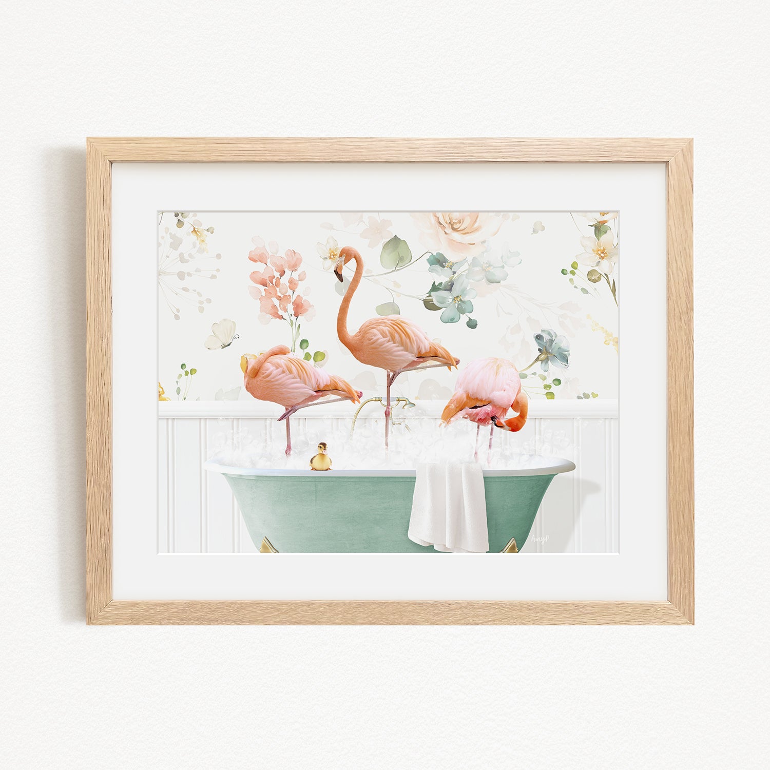 A framed print depicting three pink flamingos standing in a green bathtub filled with water, surrounded by a floral background.
