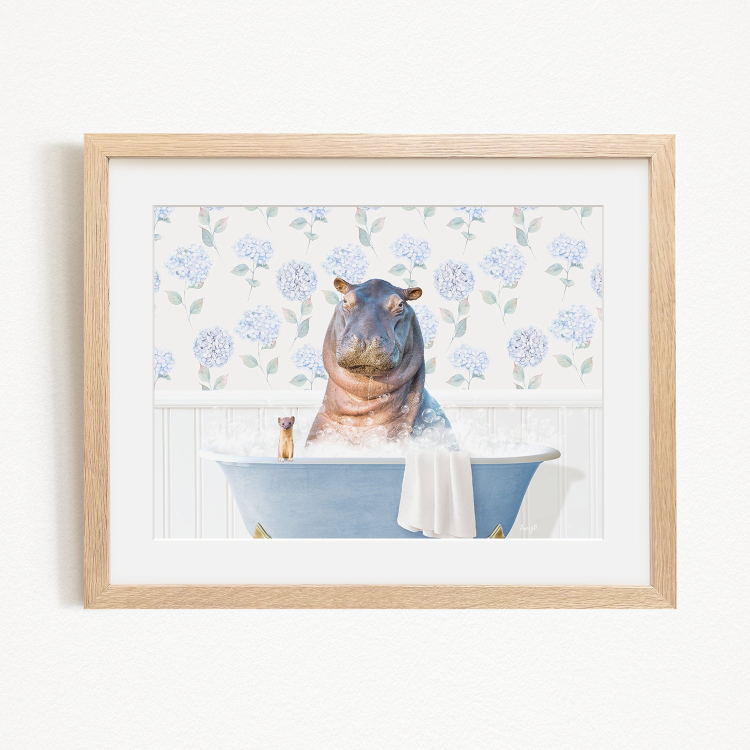 A framed image depicting a hippopotamus sitting in a bathtub filled with water, surrounded by blue hydrangea flowers.