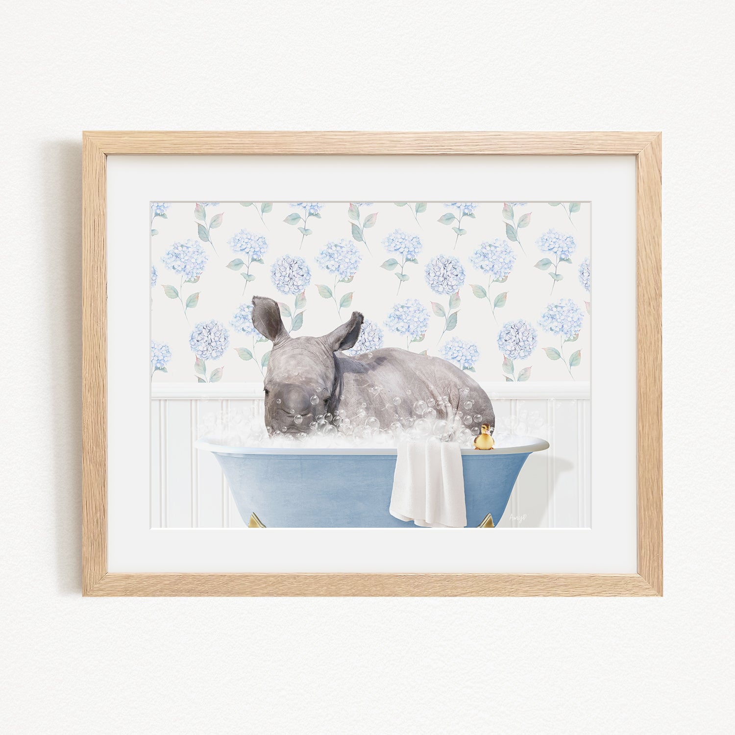A rhinoceros is sitting in a blue bathtub filled with water, surrounded by a floral pattern on the wall behind it.