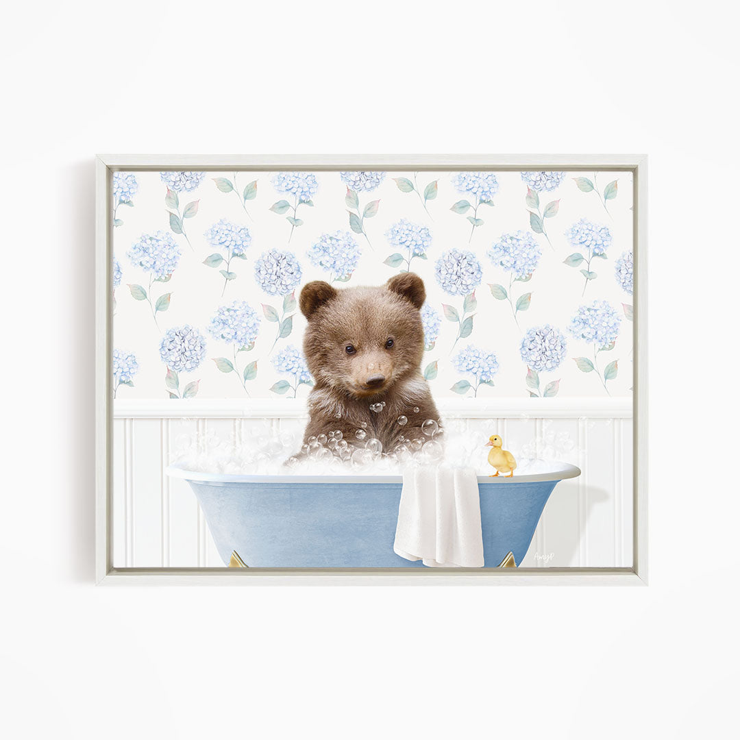 A hand holding a framed image of a brown bear sitting in a blue bathtub, surrounded by blue hydrangea flowers.