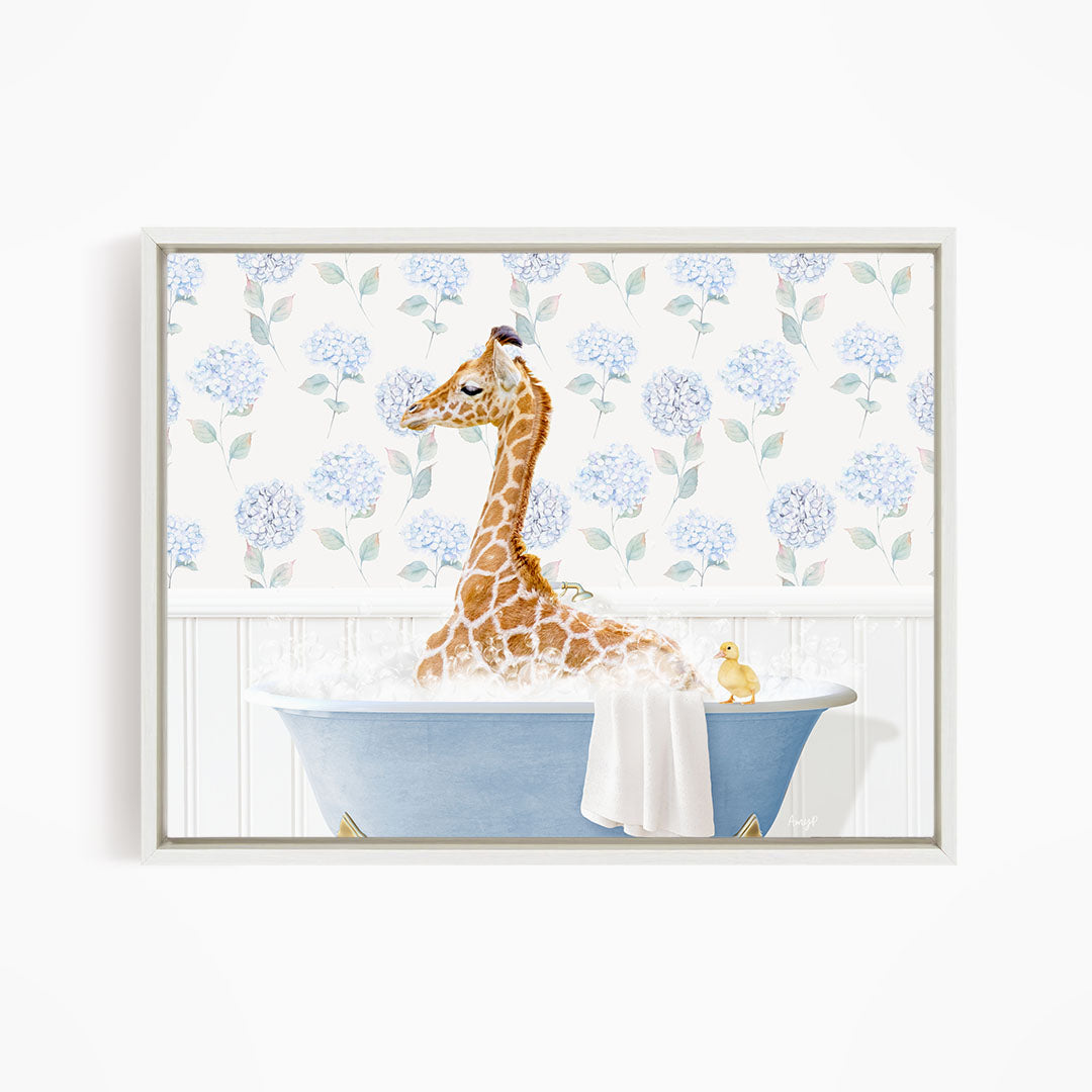 A giraffe is taking a bath in a blue bathtub, with a yellow duck sitting on the edge of the tub. The background features a floral pattern.