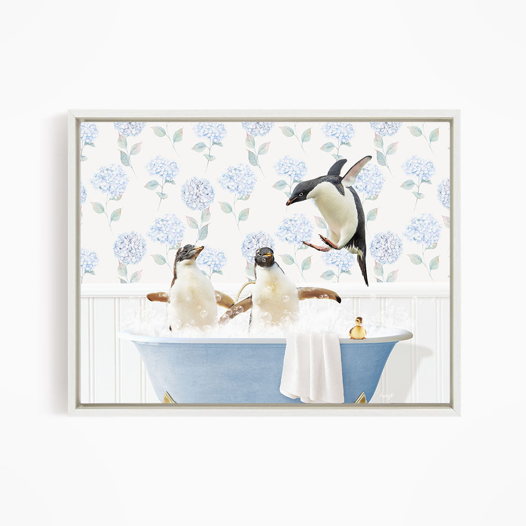 A framed image depicting three penguins sitting in a blue bathtub, with one penguin flying towards the tub.