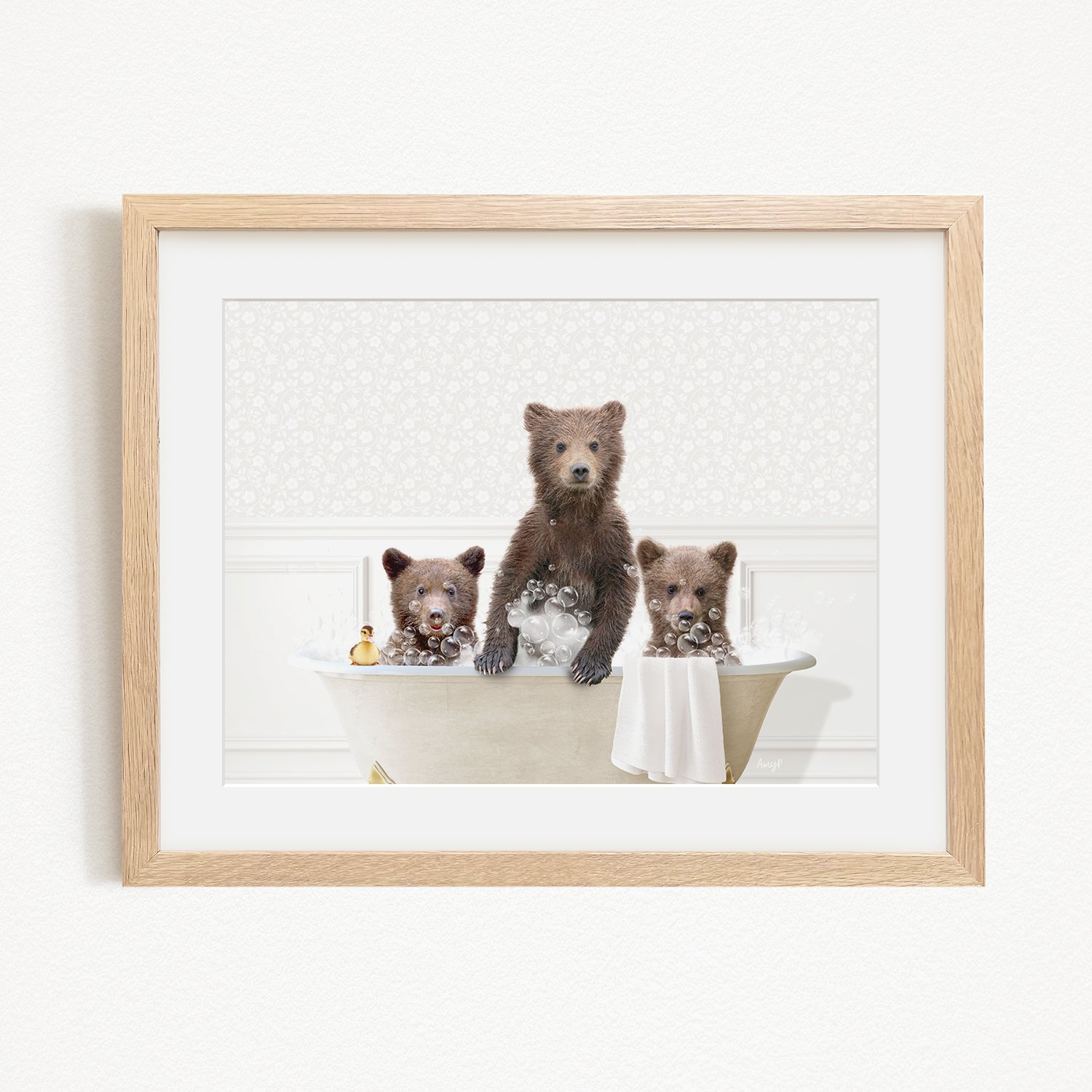 A framed image depicting three adorable brown bears sitting in a bathtub filled with bubbles, enjoying a relaxing bath together.