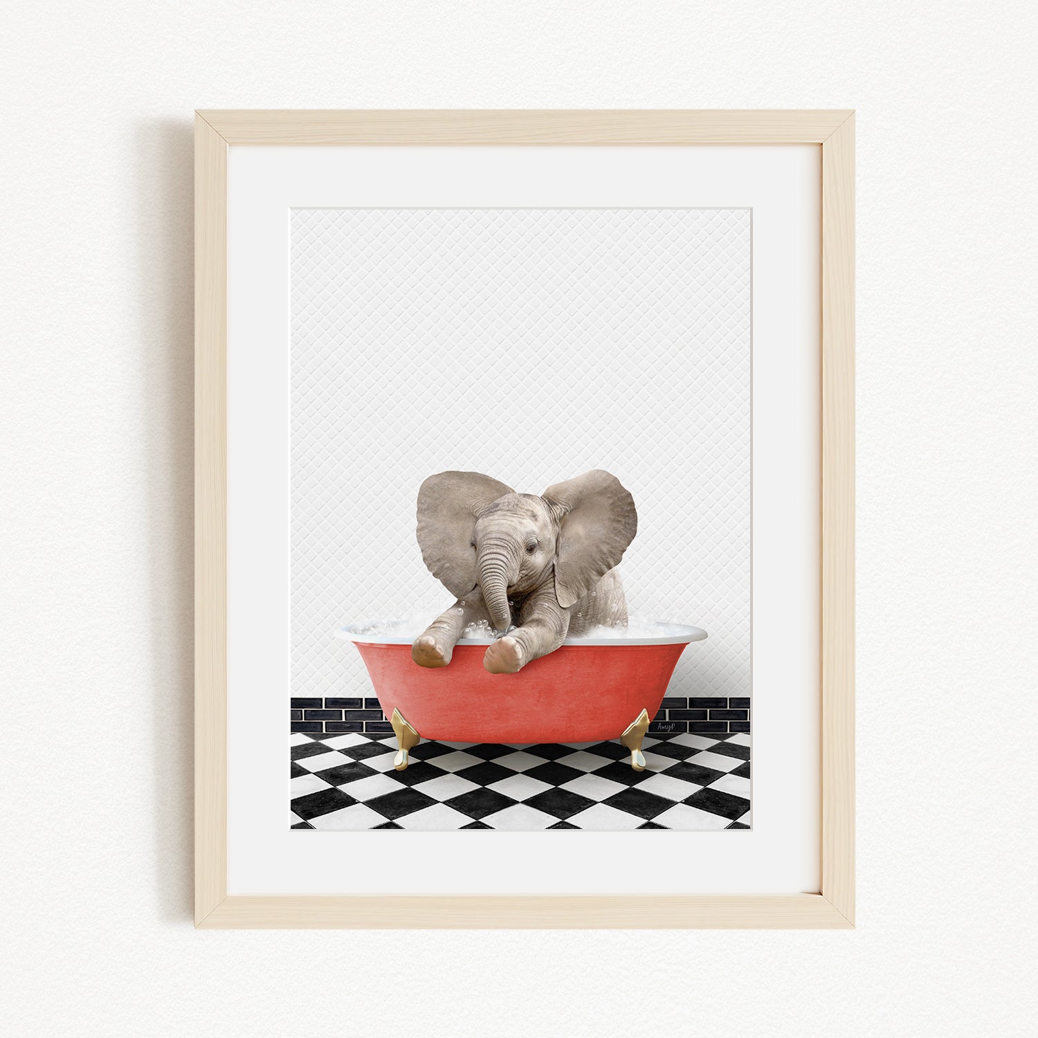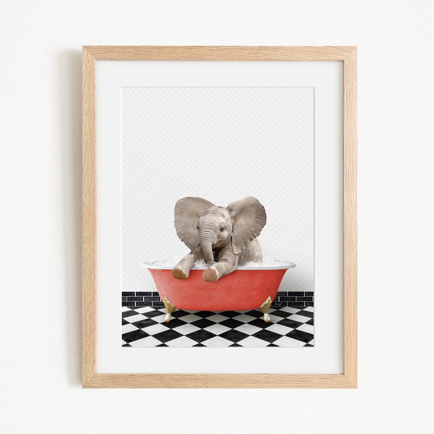 A baby elephant sitting in a red bathtub, surrounded by a black and white checkered floor.