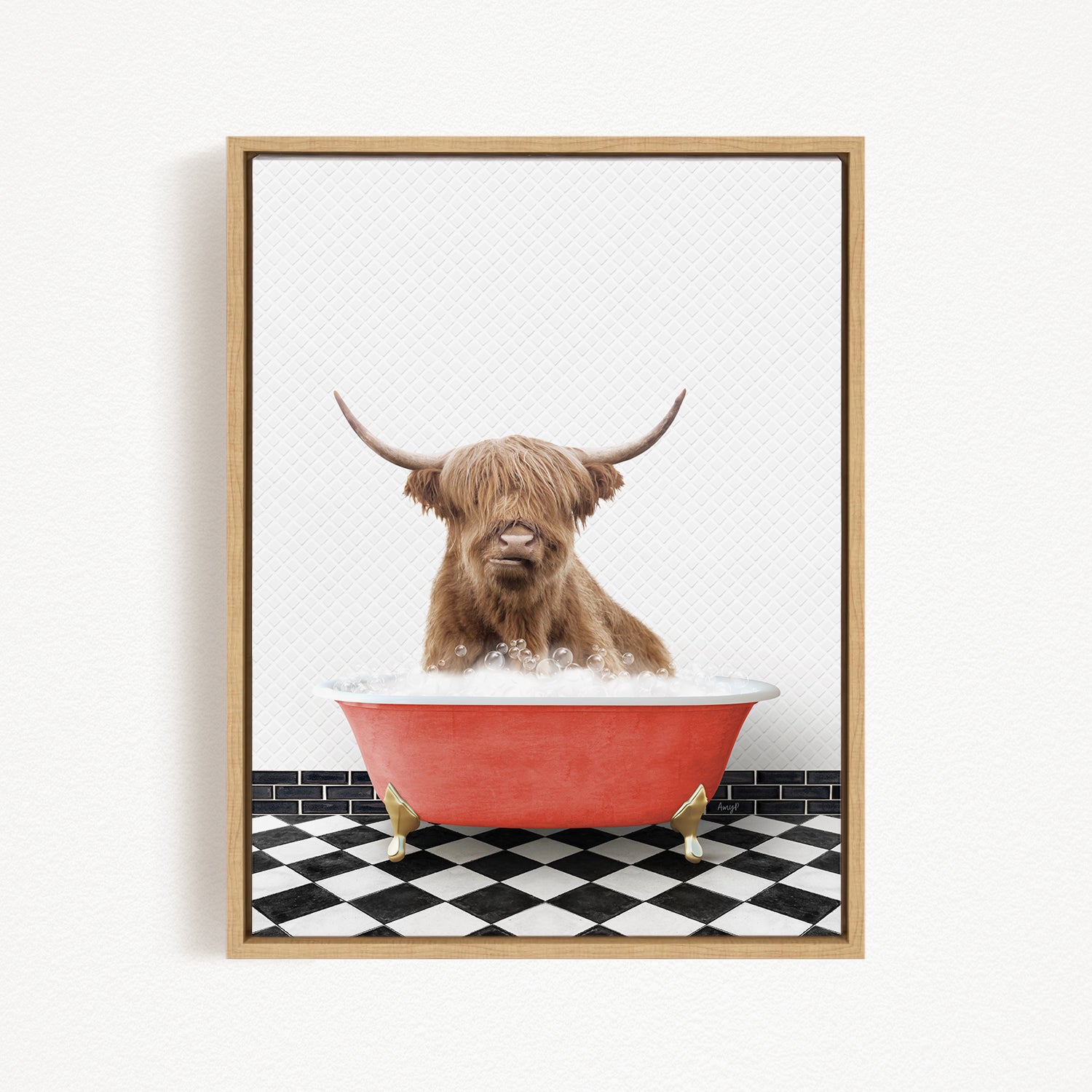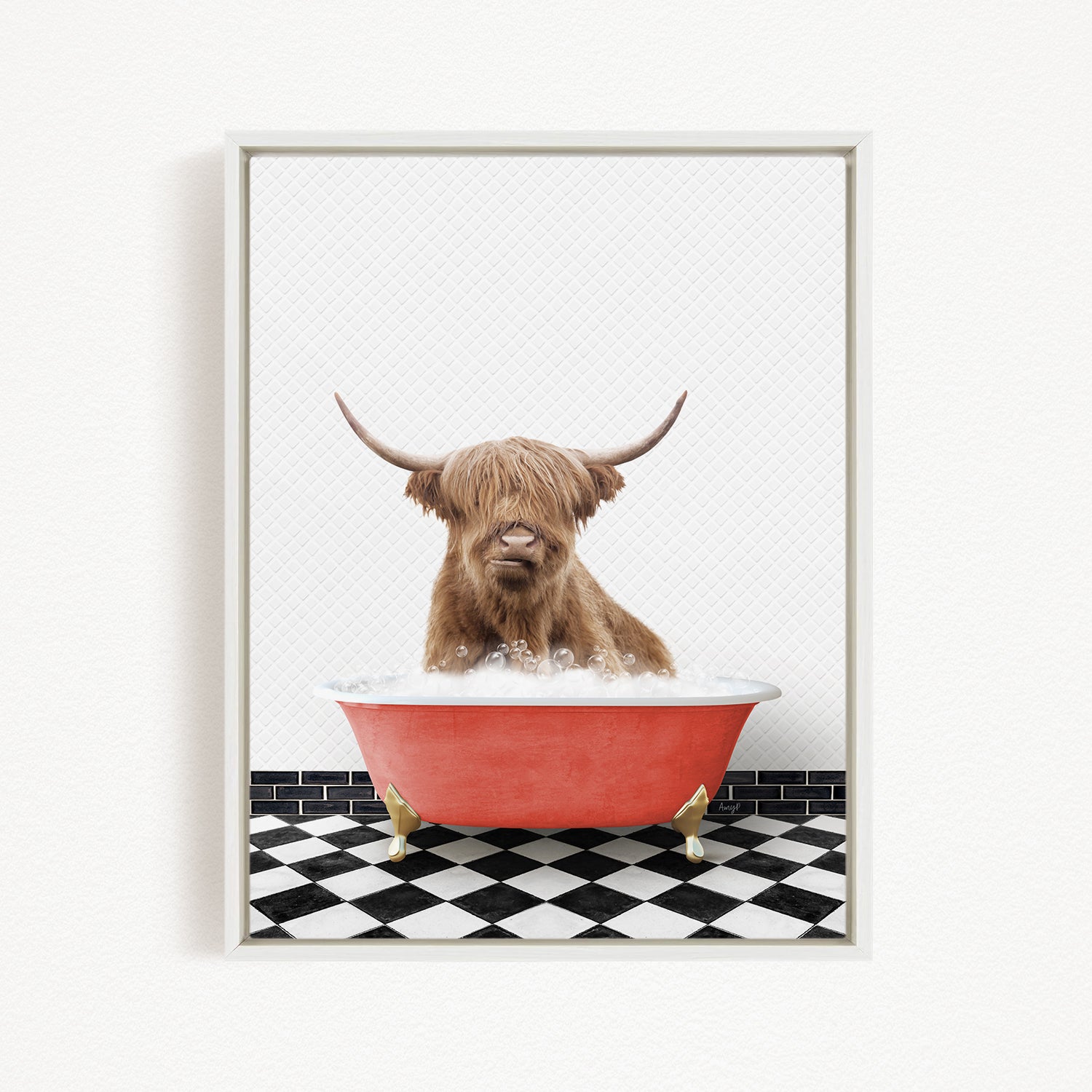 A Highland cow with shaggy brown hair is sitting in a red bathtub filled with bubbles, with a black and white checkered floor beneath it.