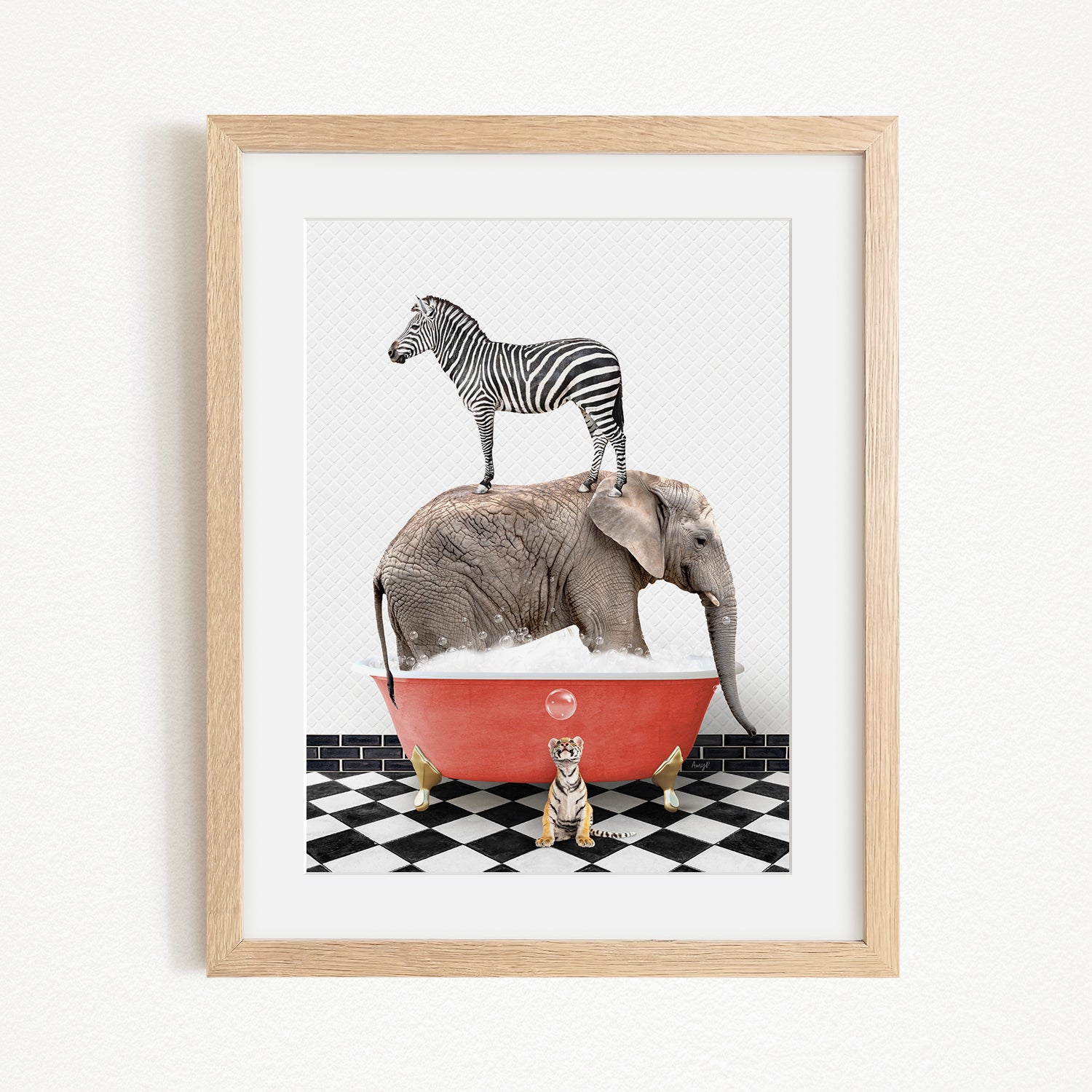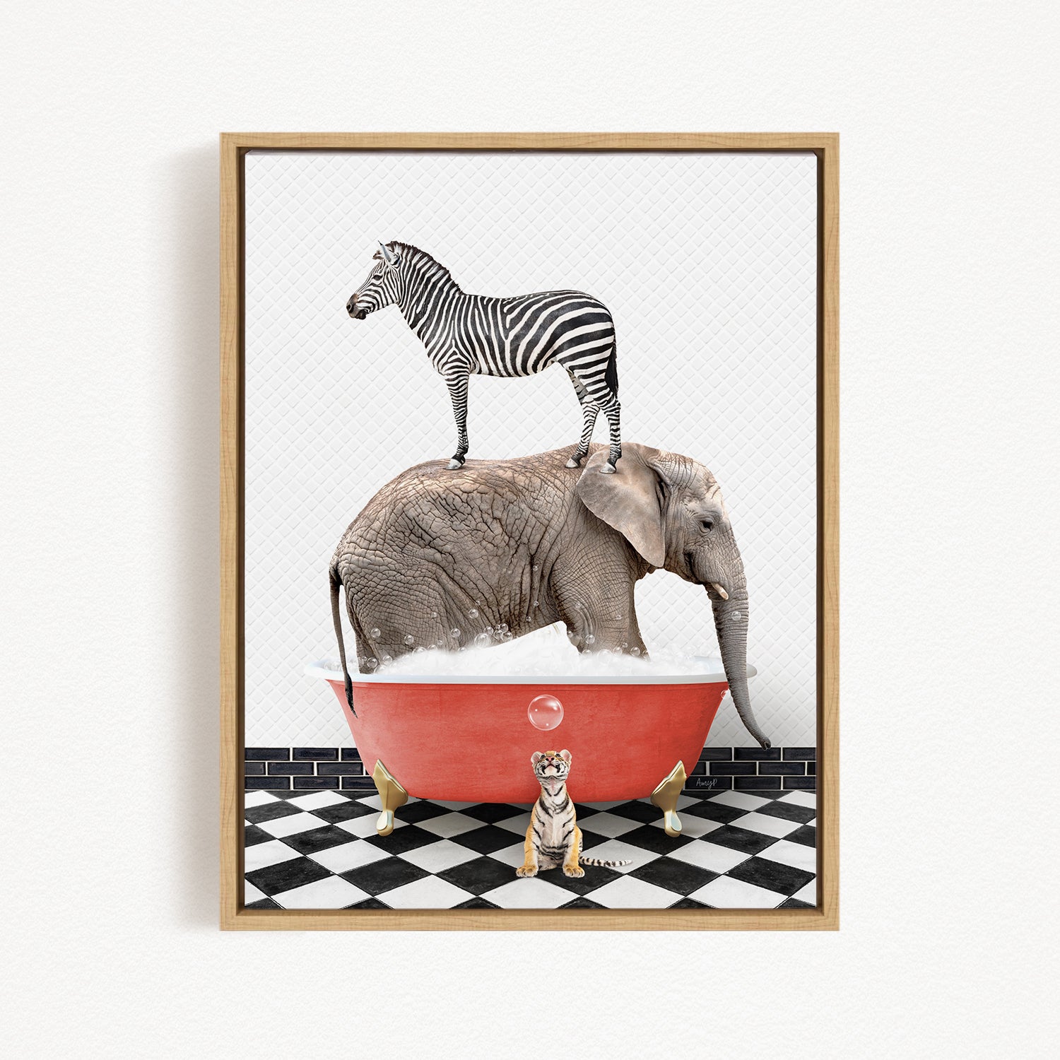 A zebra stands on top of an elephant in a red bathtub, with a small tiger sitting nearby on a black and white checkered floor.