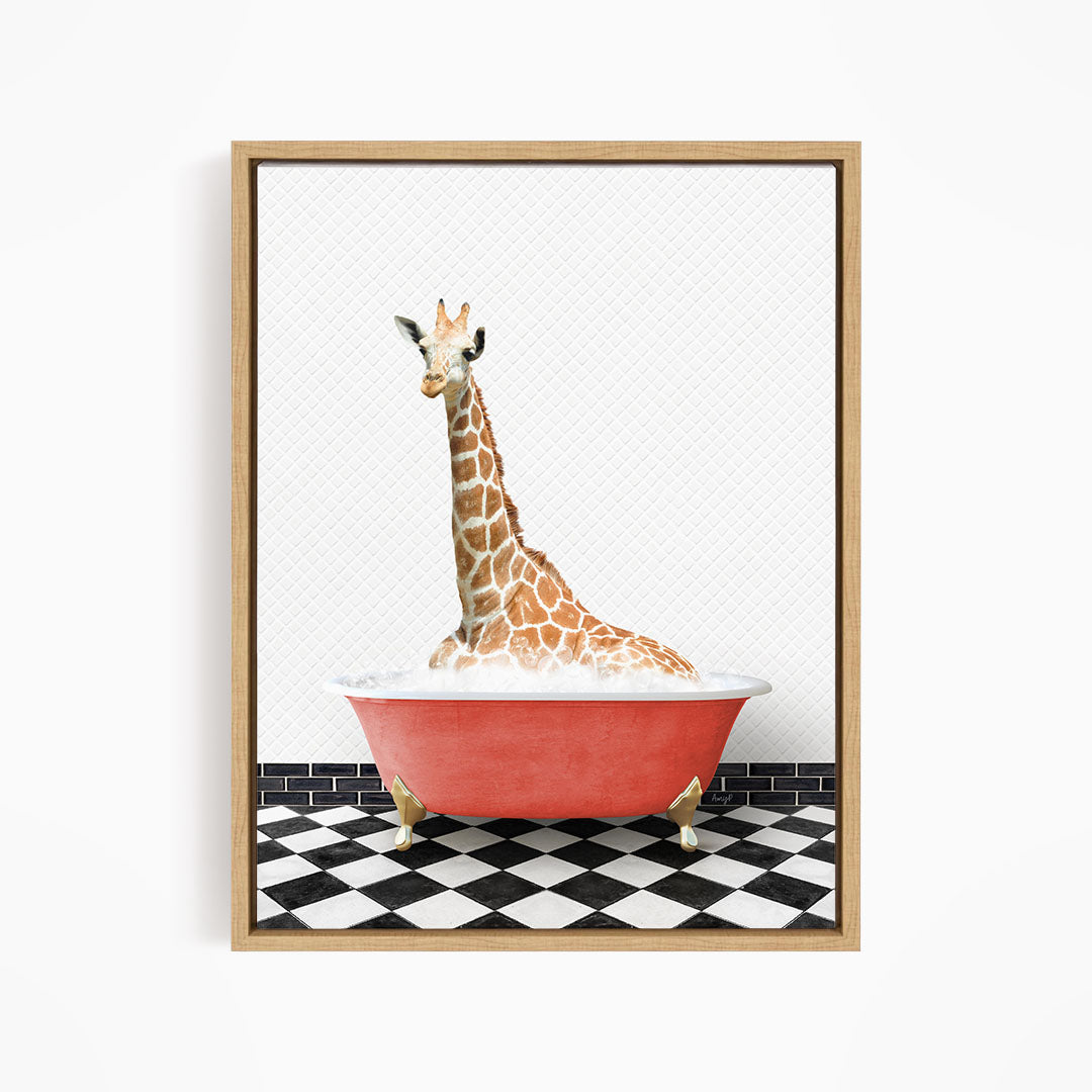 A giraffe sitting in a red bathtub on a black and white checkered floor.