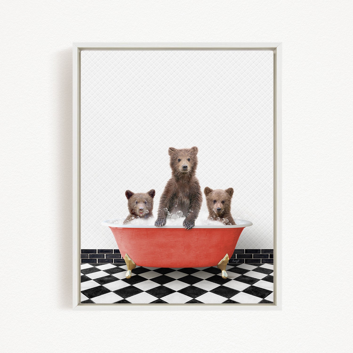 A framed image depicting three bears sitting in a red bathtub on a black and white checkered floor.