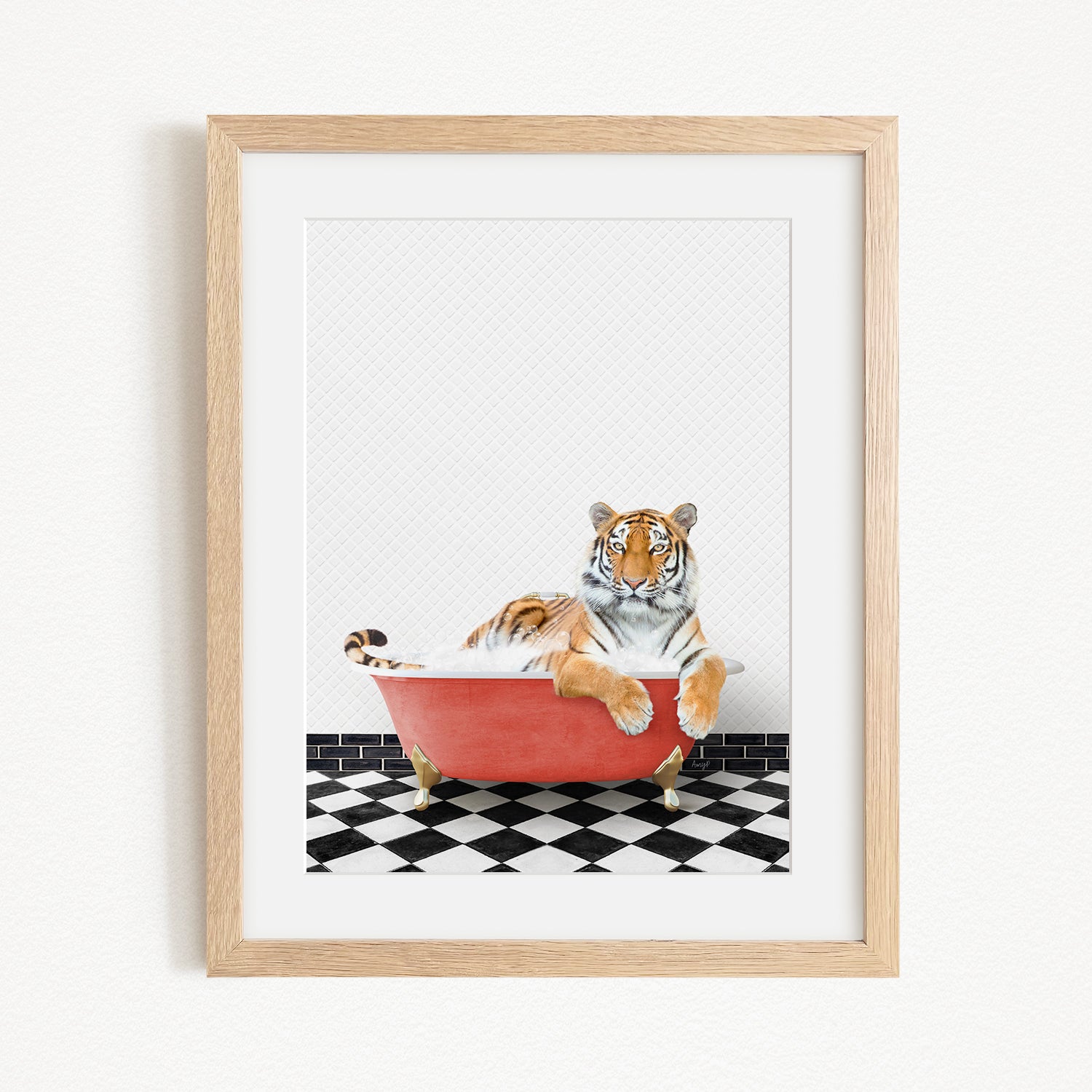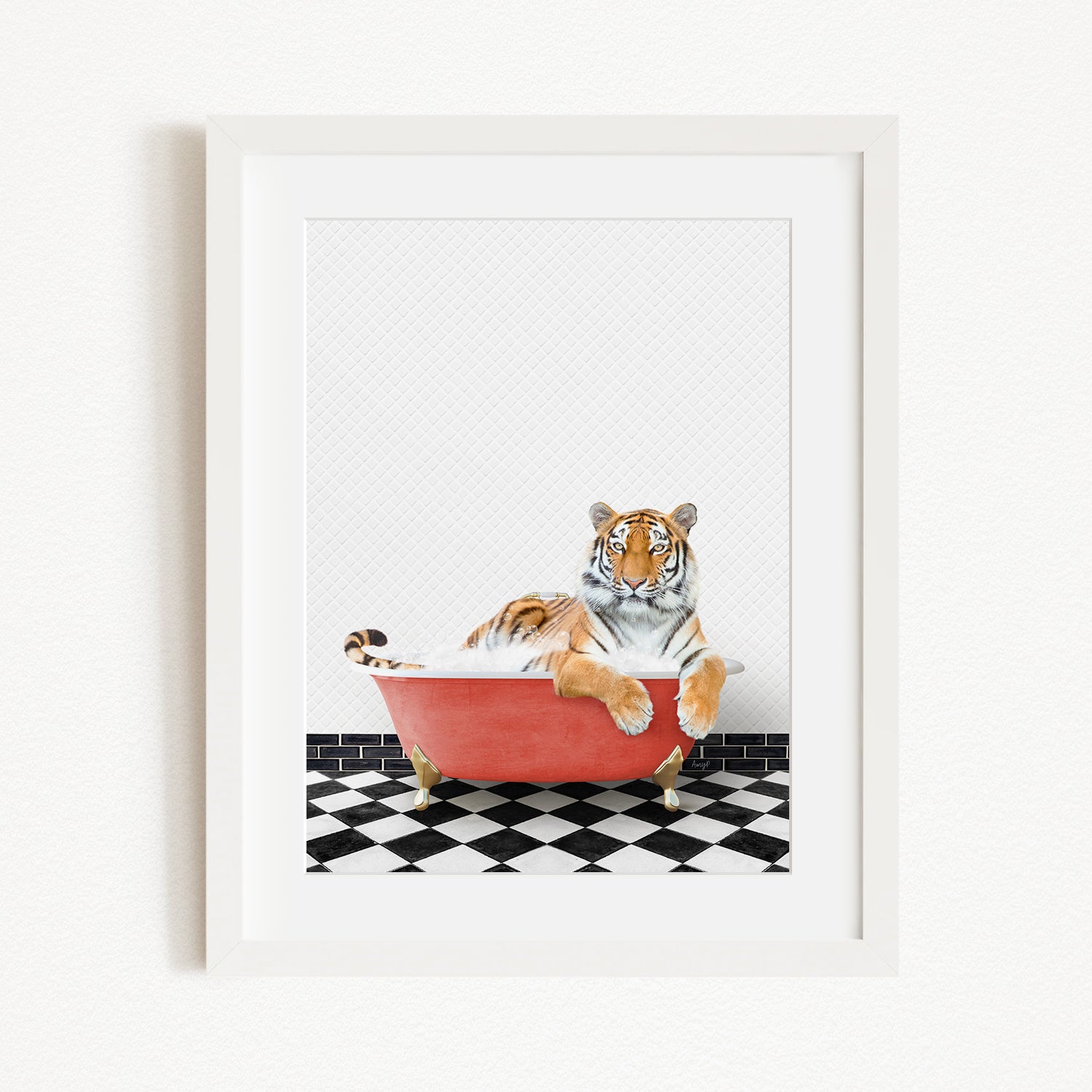 A tiger is sitting in a red bathtub, surrounded by a black and white checkered floor.
