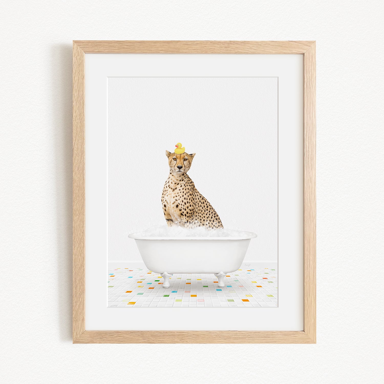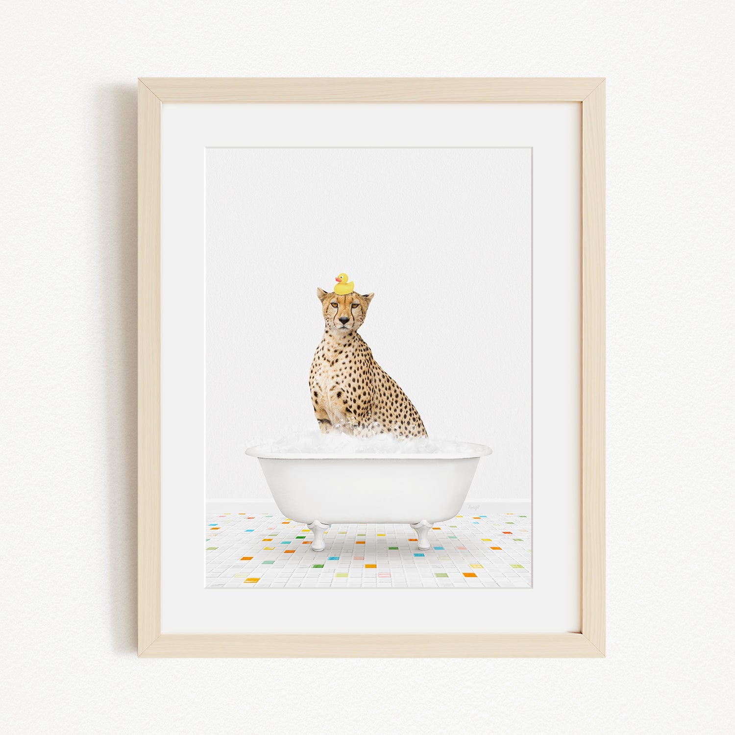 A cheetah wearing a yellow rubber duck hat is sitting in a white bathtub filled with bubbles, with a colorful tiled floor in the background.