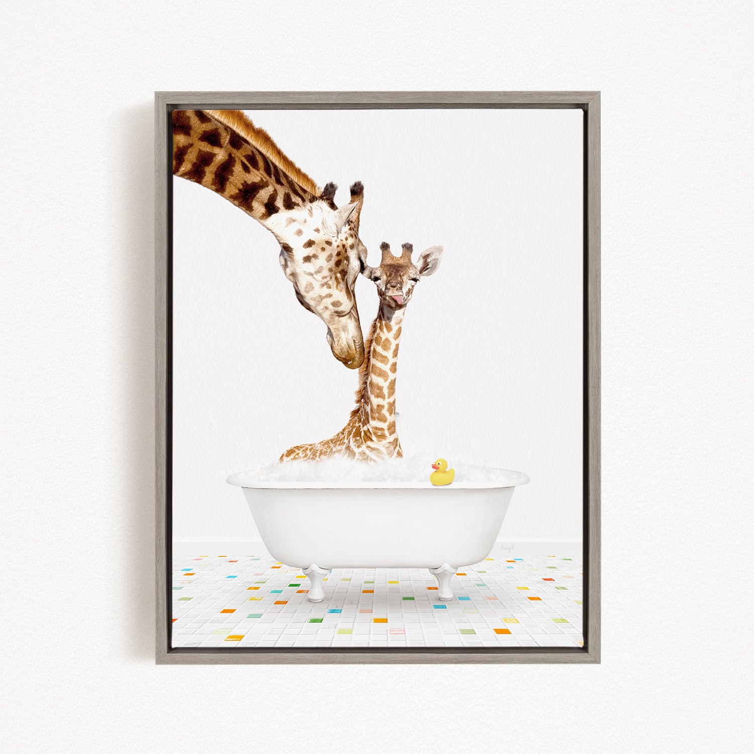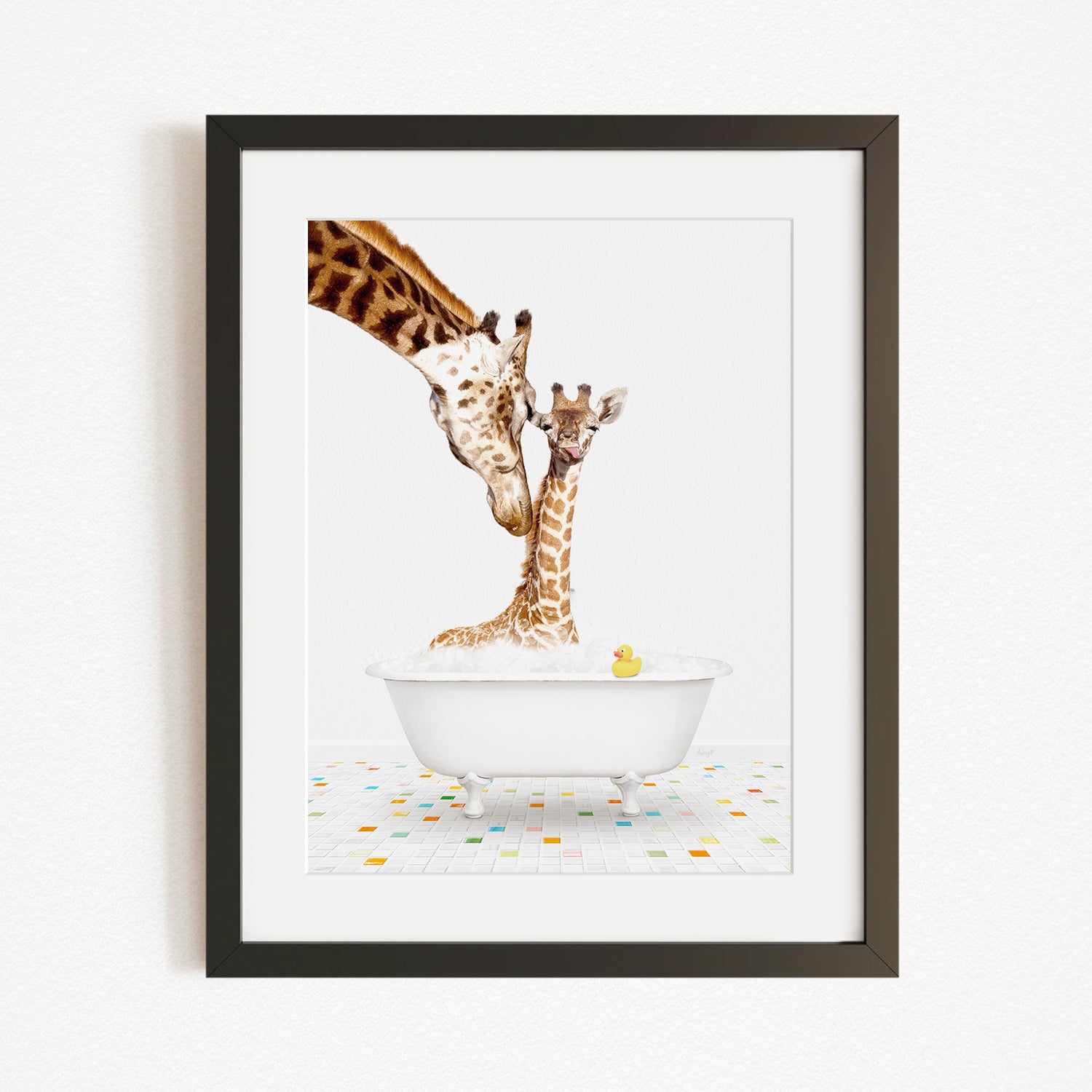 A mother giraffe and her baby giraffe are enjoying a bath together in a white bathtub, with a rubber duck floating in the water.