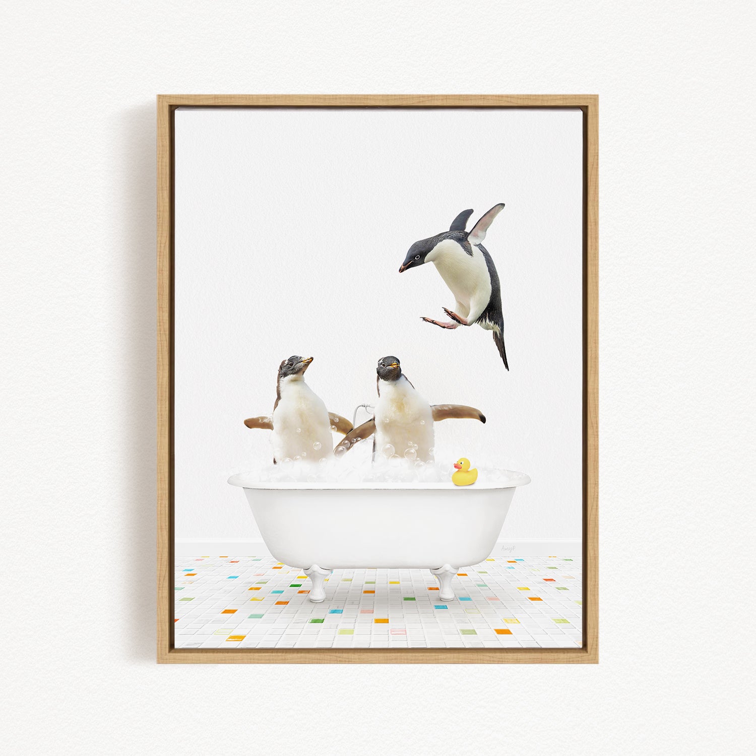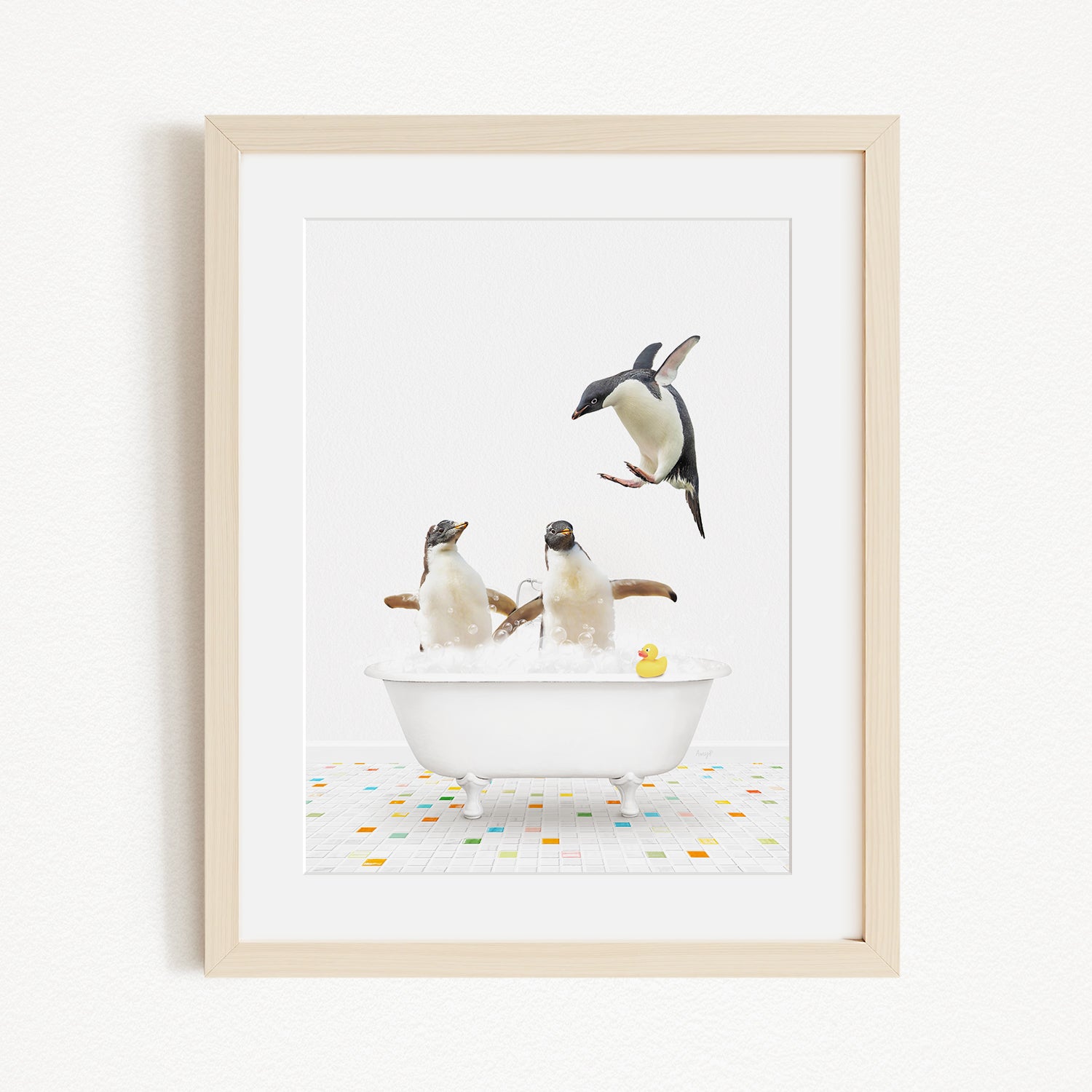A framed image depicting two penguins sitting in a bathtub, with one penguin jumping out of the tub and another penguin sitting in the tub.