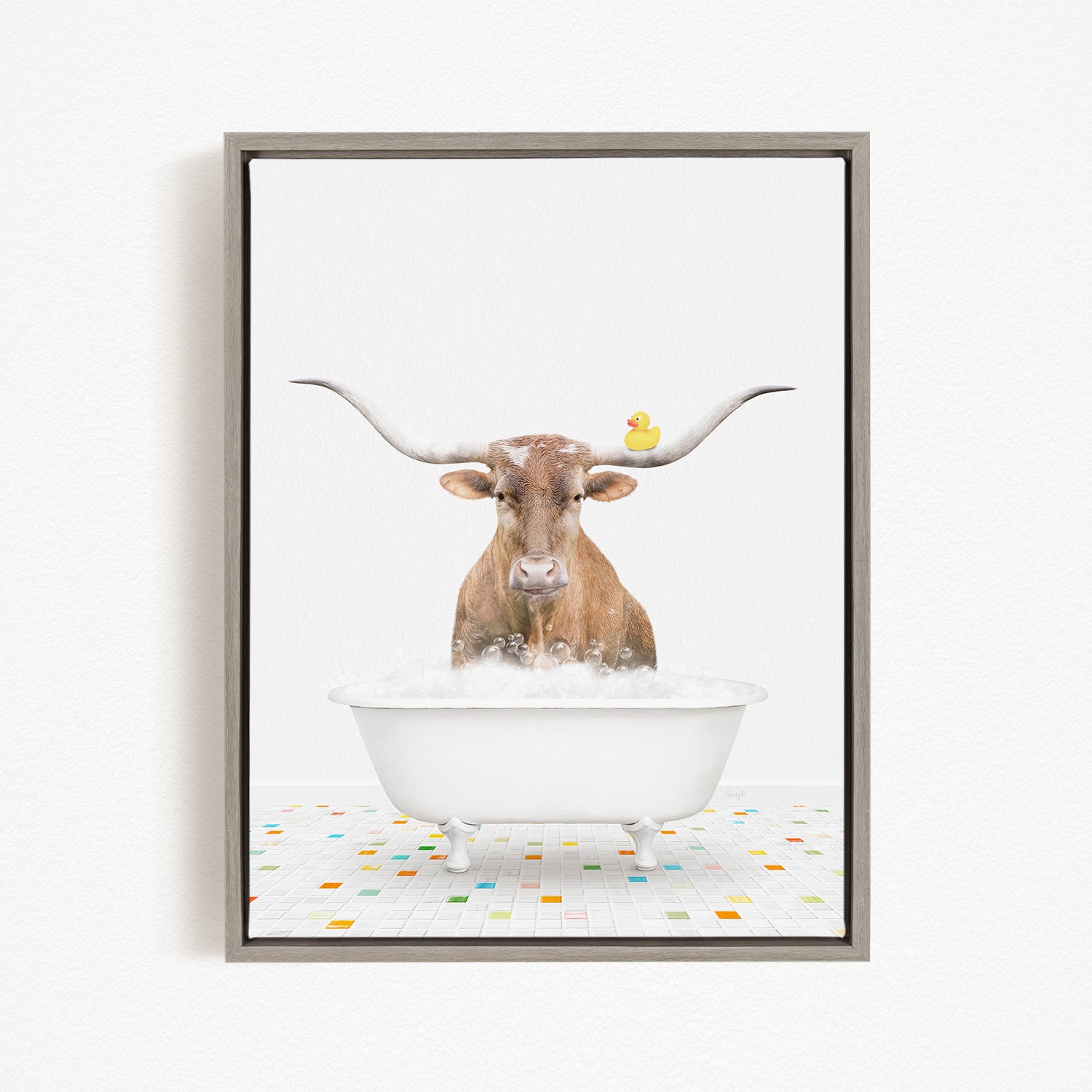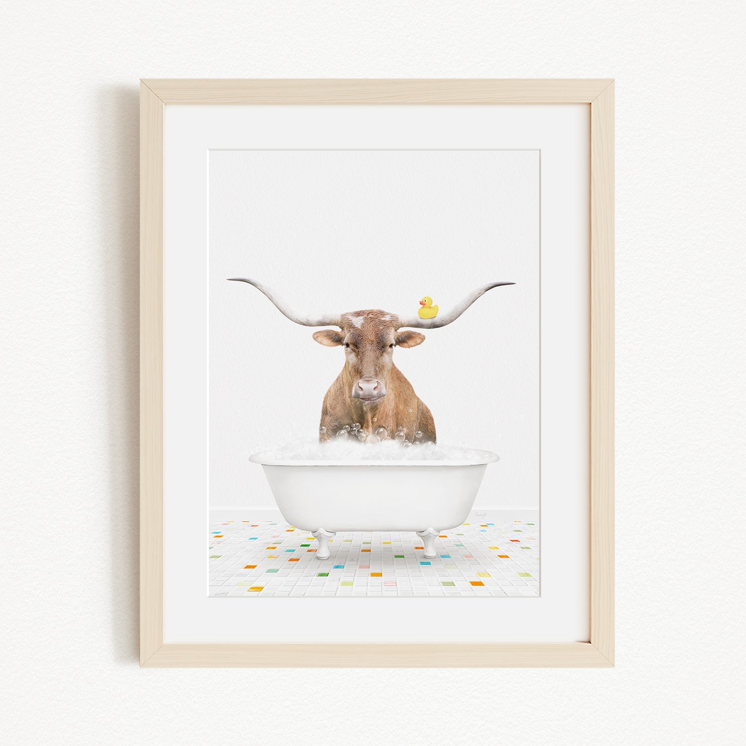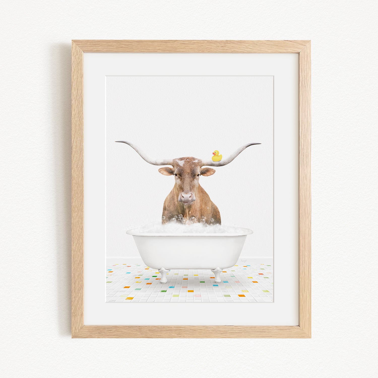 A framed image depicting a brown cow with large horns sitting in a white bathtub, with a yellow duck perched on its head.