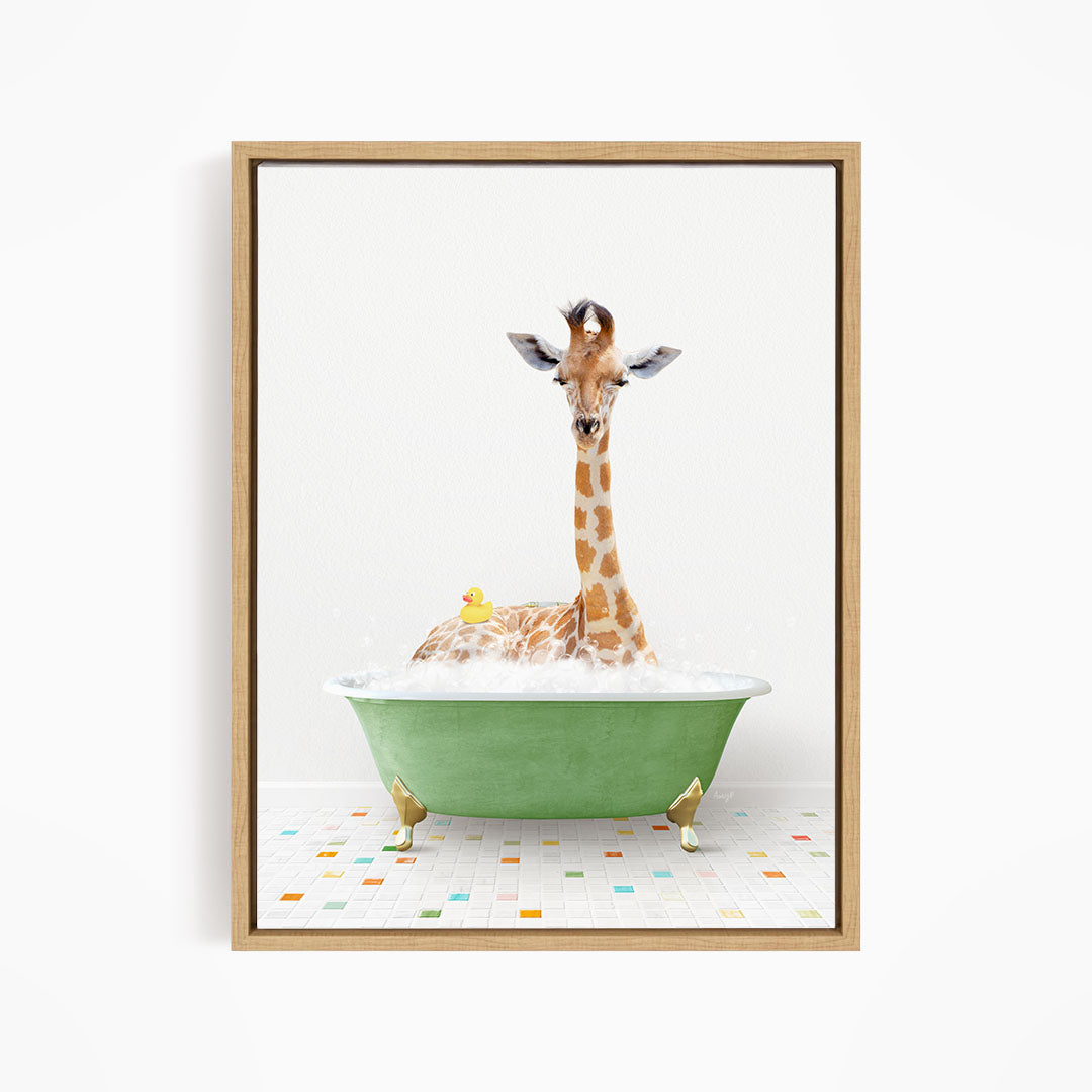 A giraffe is sitting in a green bathtub filled with bubbles, surrounded by a yellow rubber duck.
