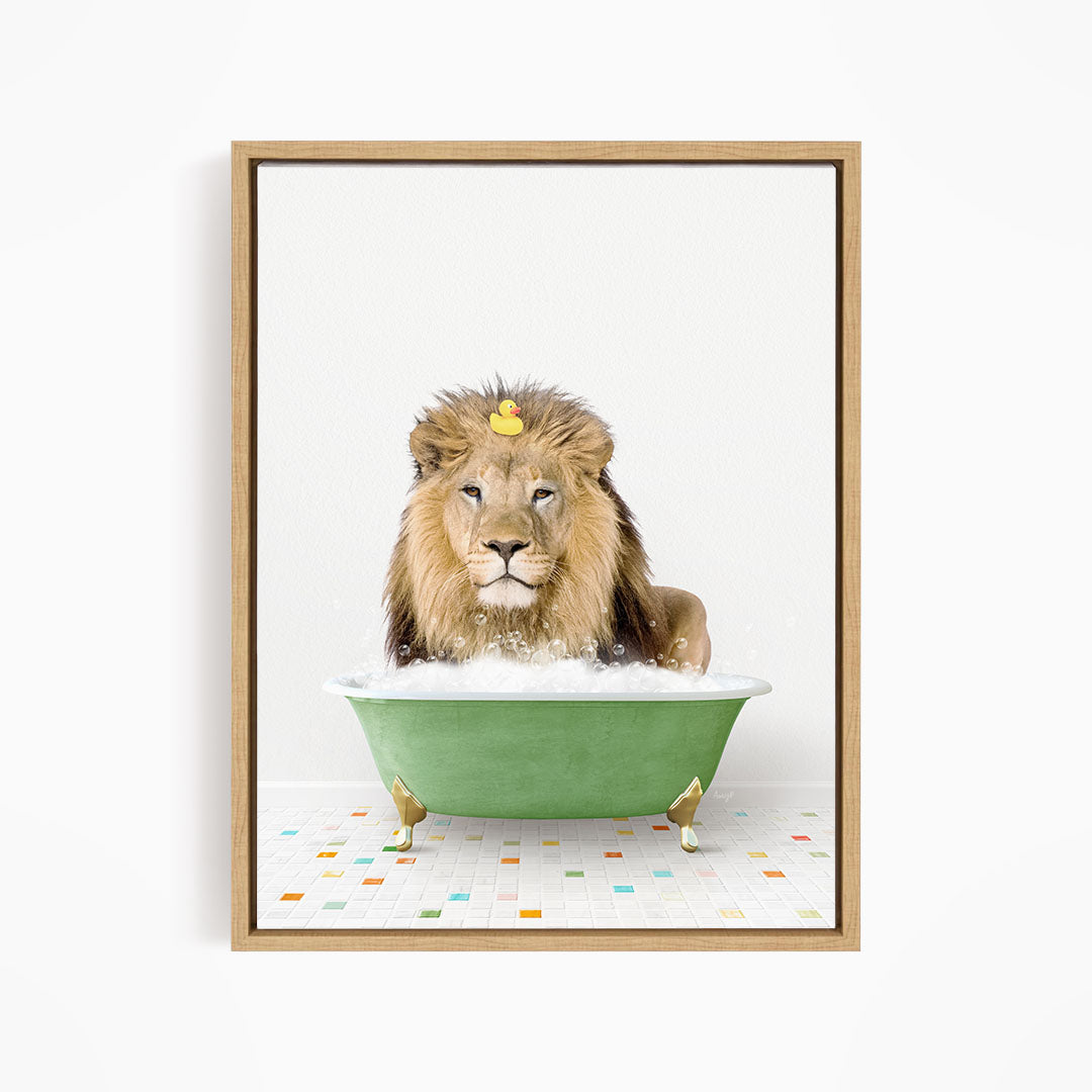 A lion is sitting in a green bathtub filled with bubbles, with a rubber duck floating on top.