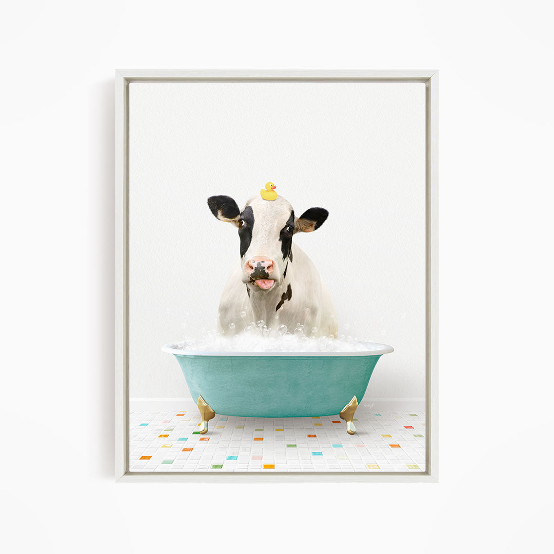 A cow is sitting in a bathtub filled with bubbles, with a rubber duck perched on its head.