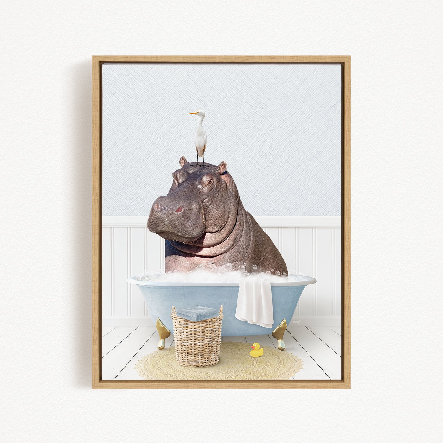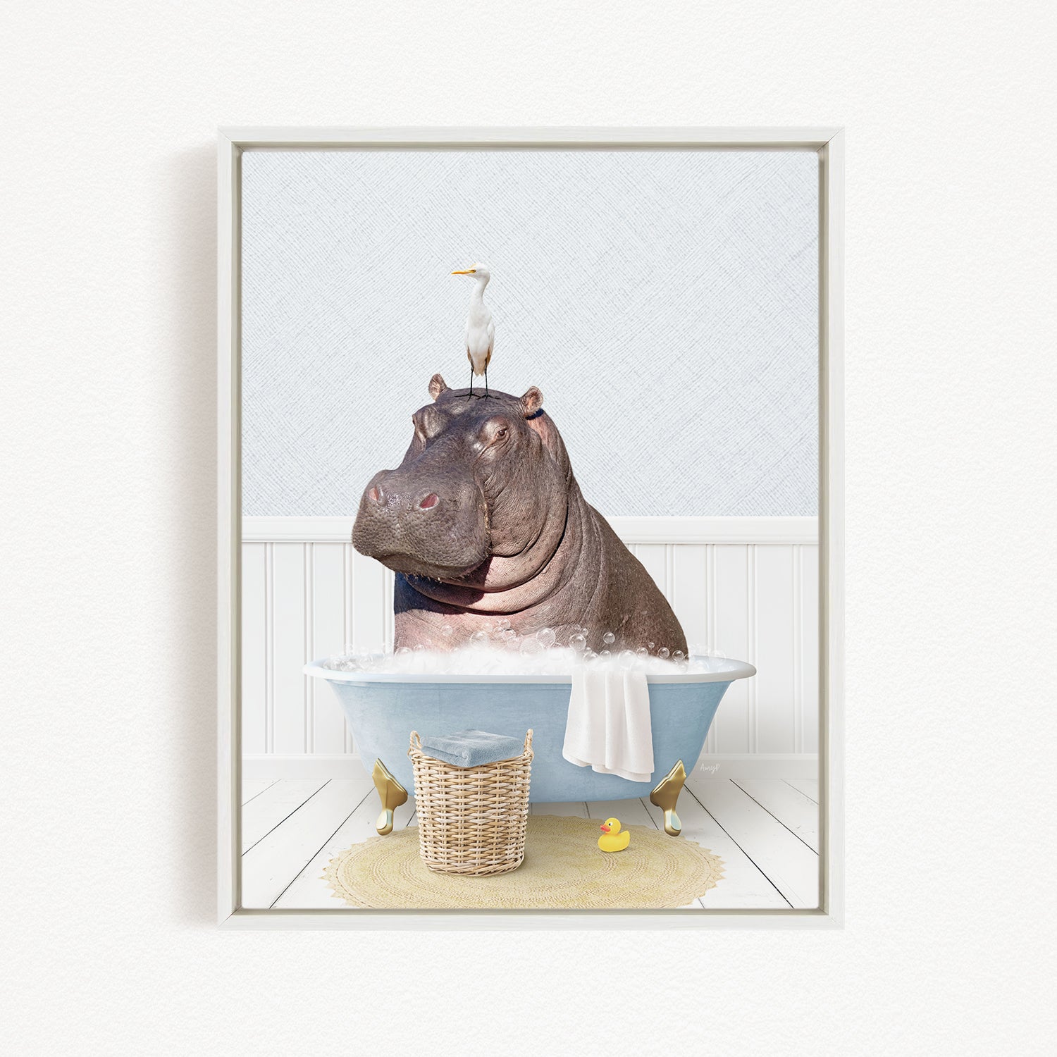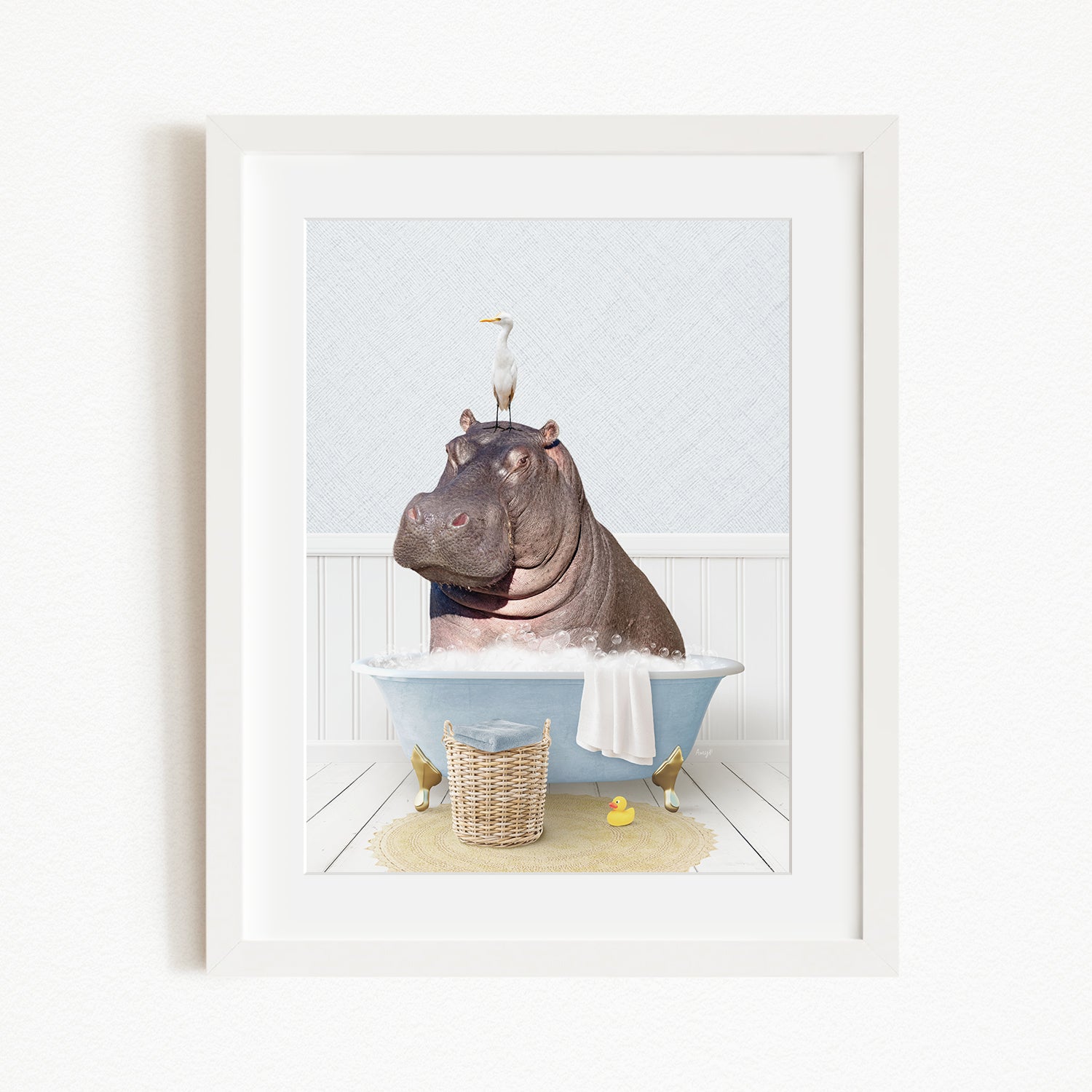 A framed image depicting a large hippopotamus sitting in a bathtub, with a bird perched on its head.