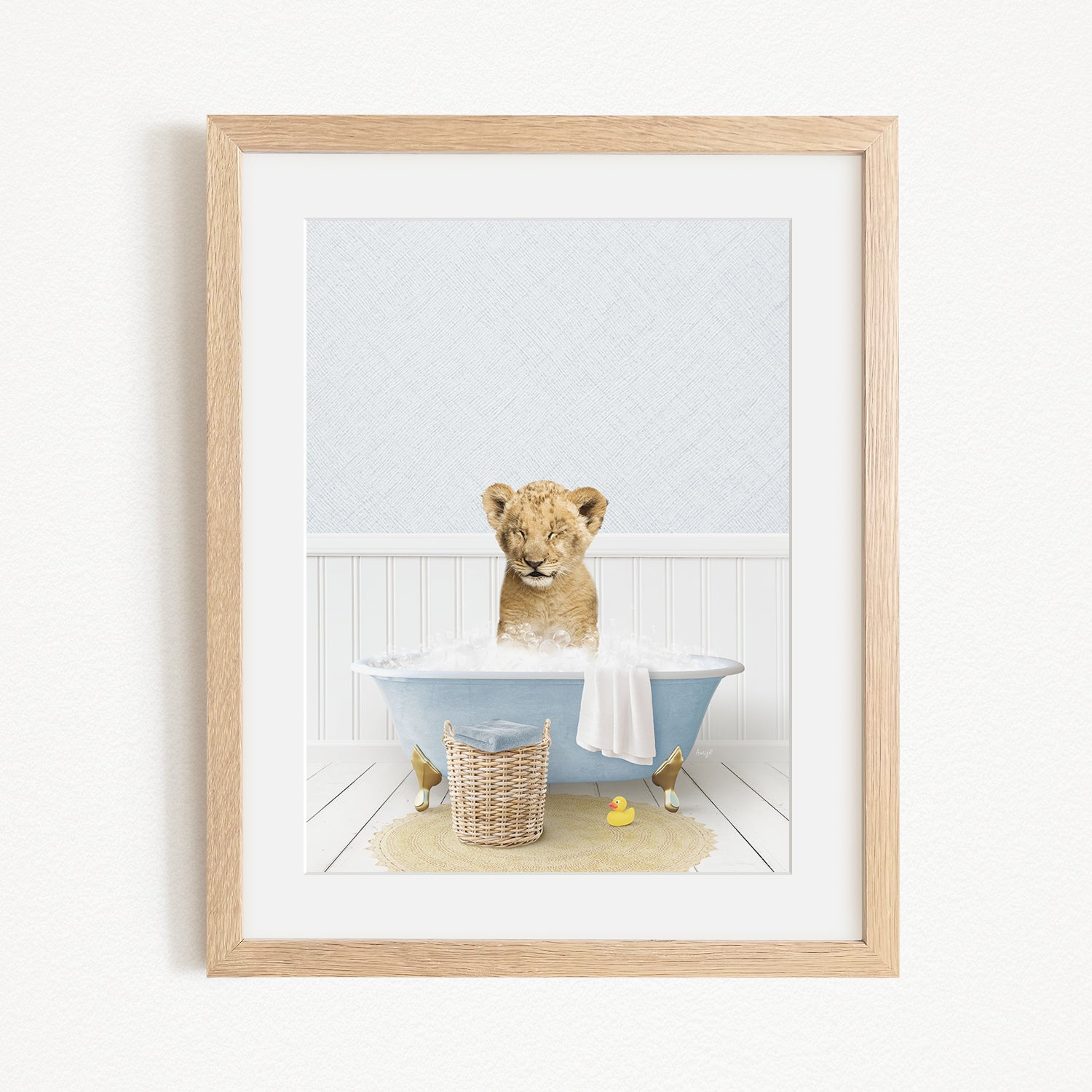 A young lion cub sitting in a blue bathtub filled with water, surrounded by a yellow rubber duck and a basket.