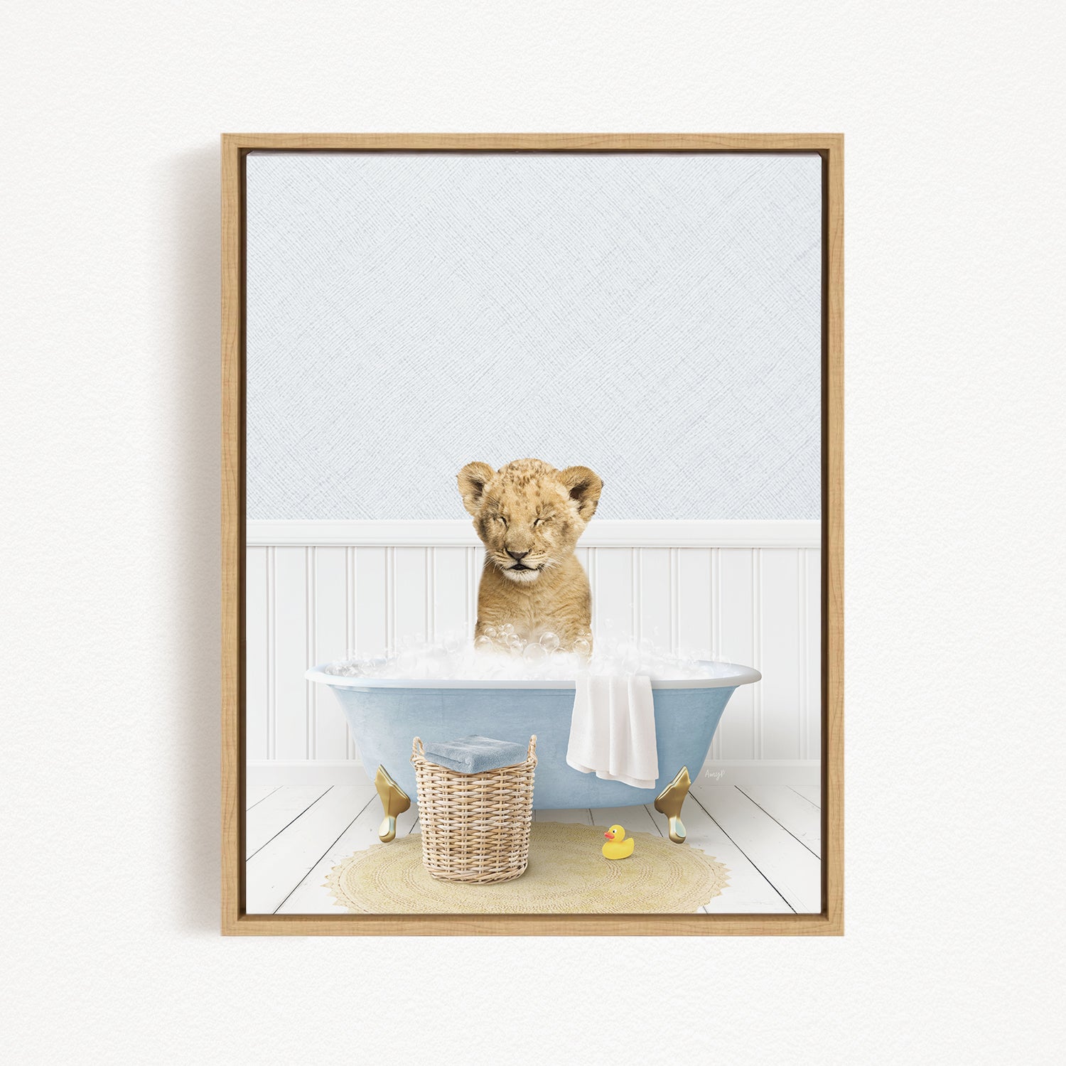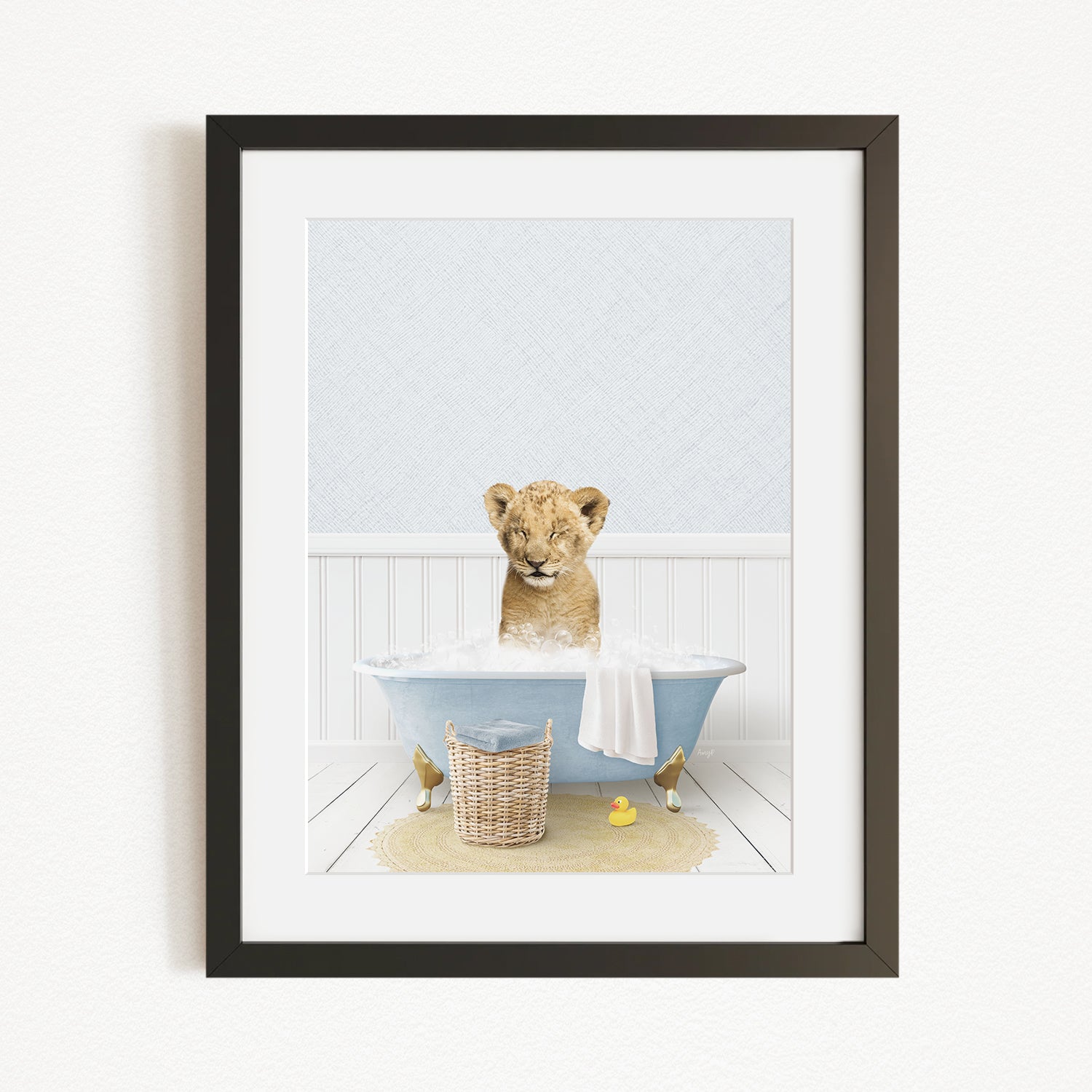 A young lion cub sitting in a blue bathtub filled with water, surrounded by a basket of toys and a yellow rubber duck.