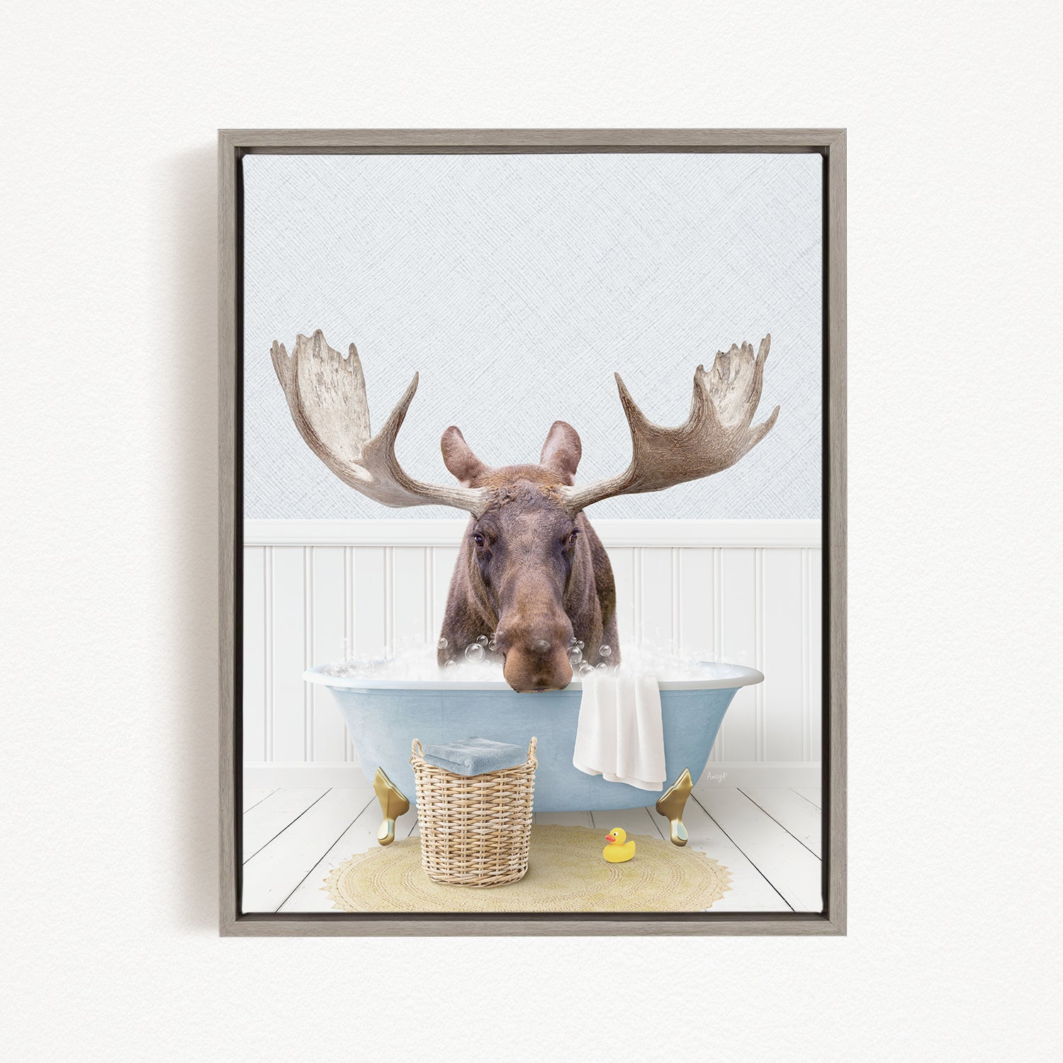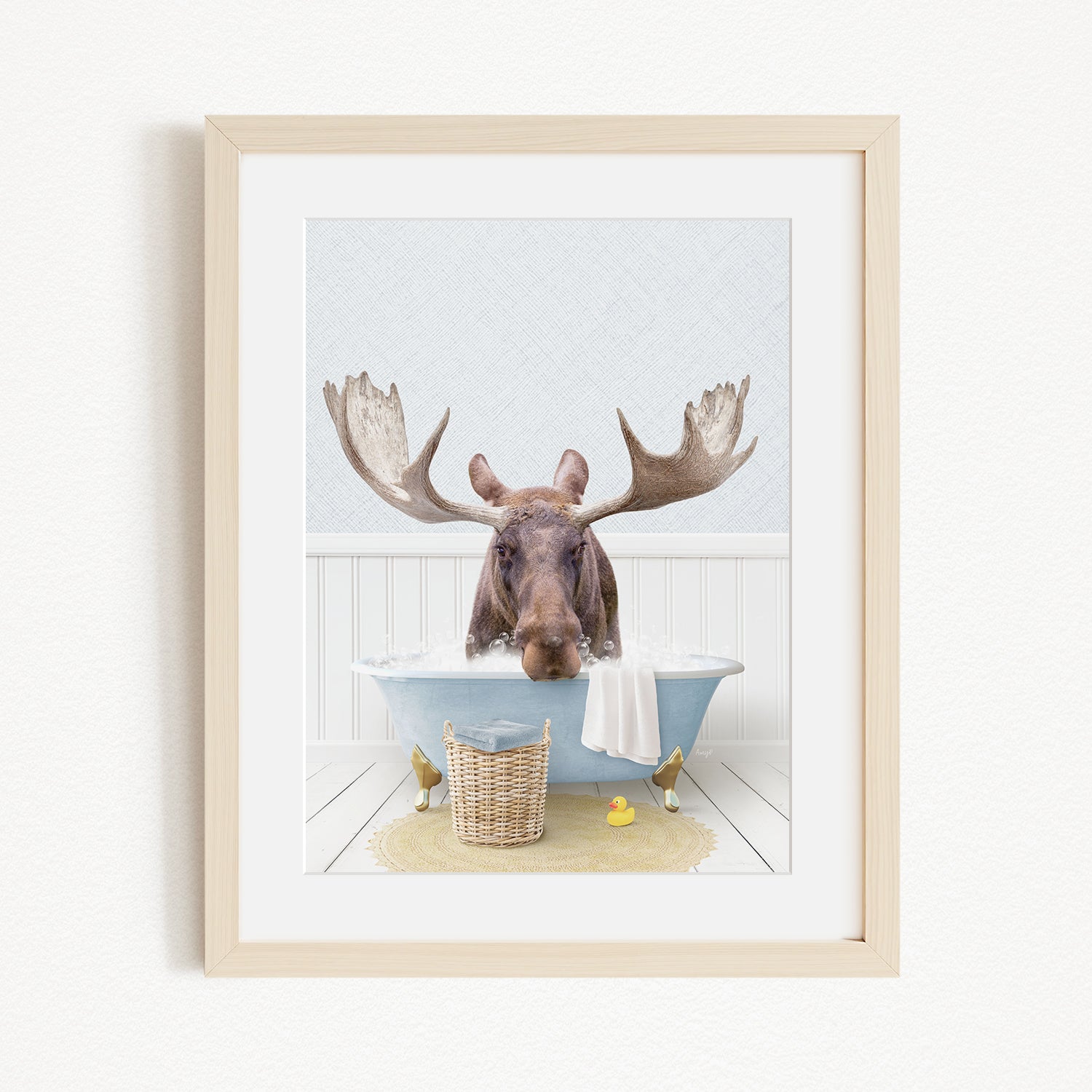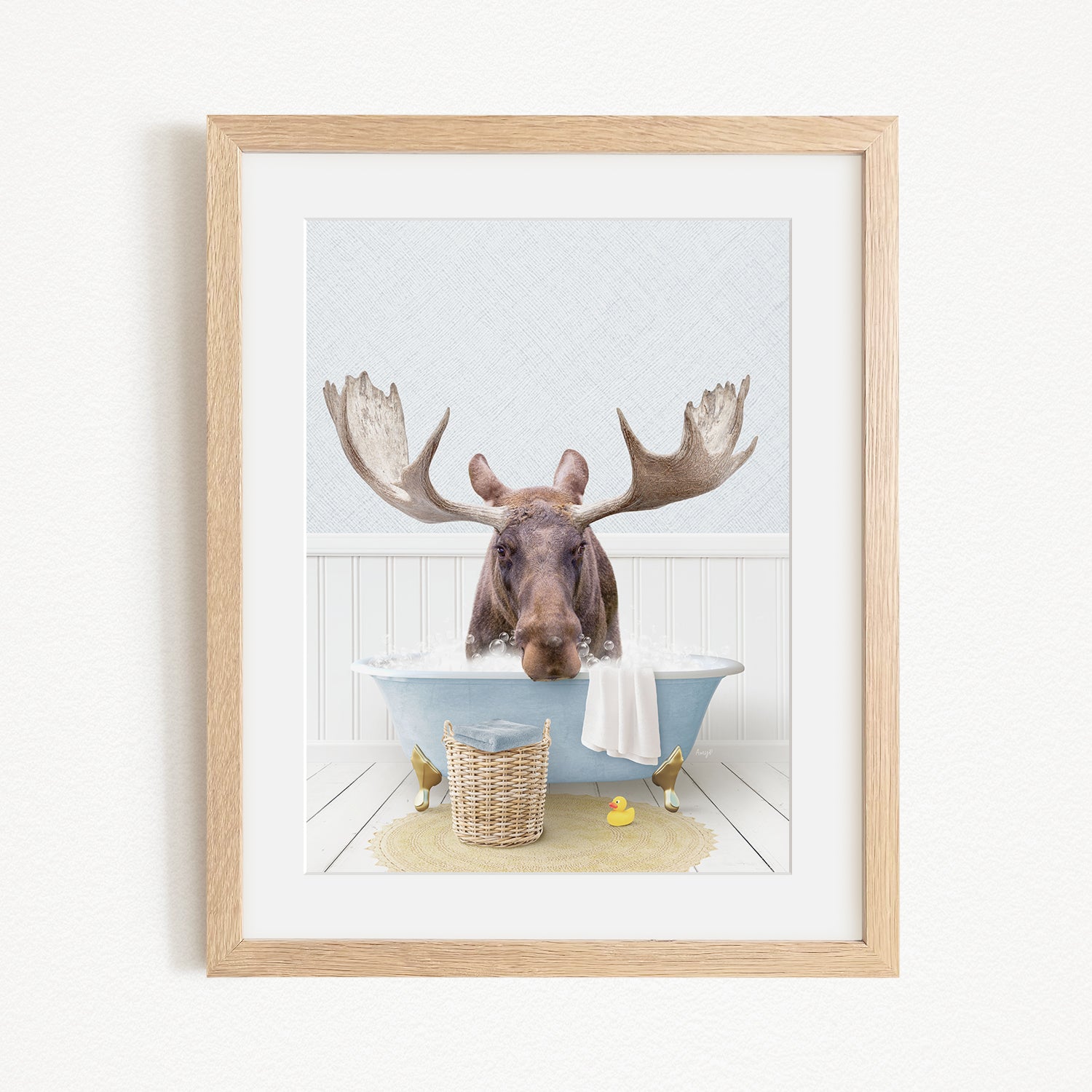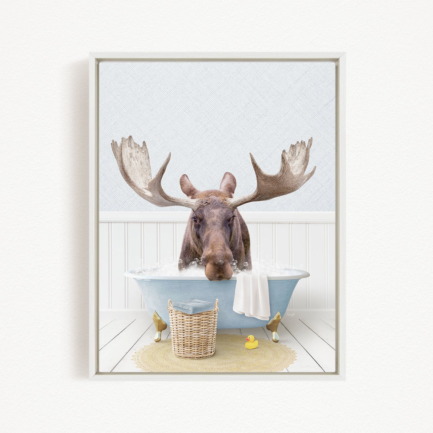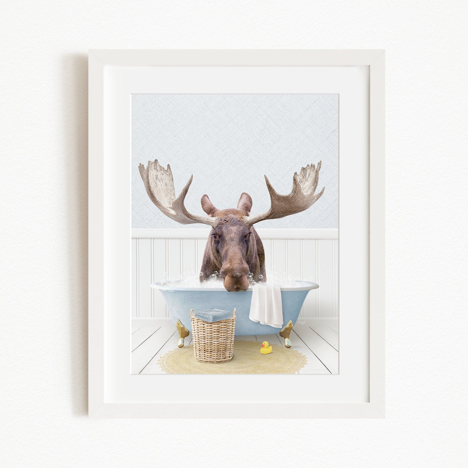 A framed image depicting a moose sitting in a bathtub, with a basket of rubber ducks nearby.