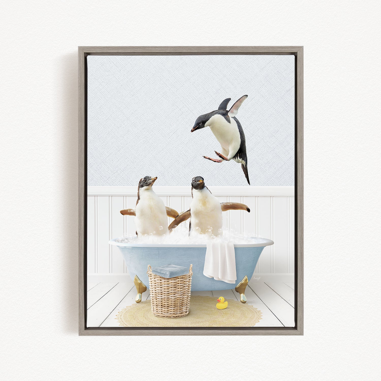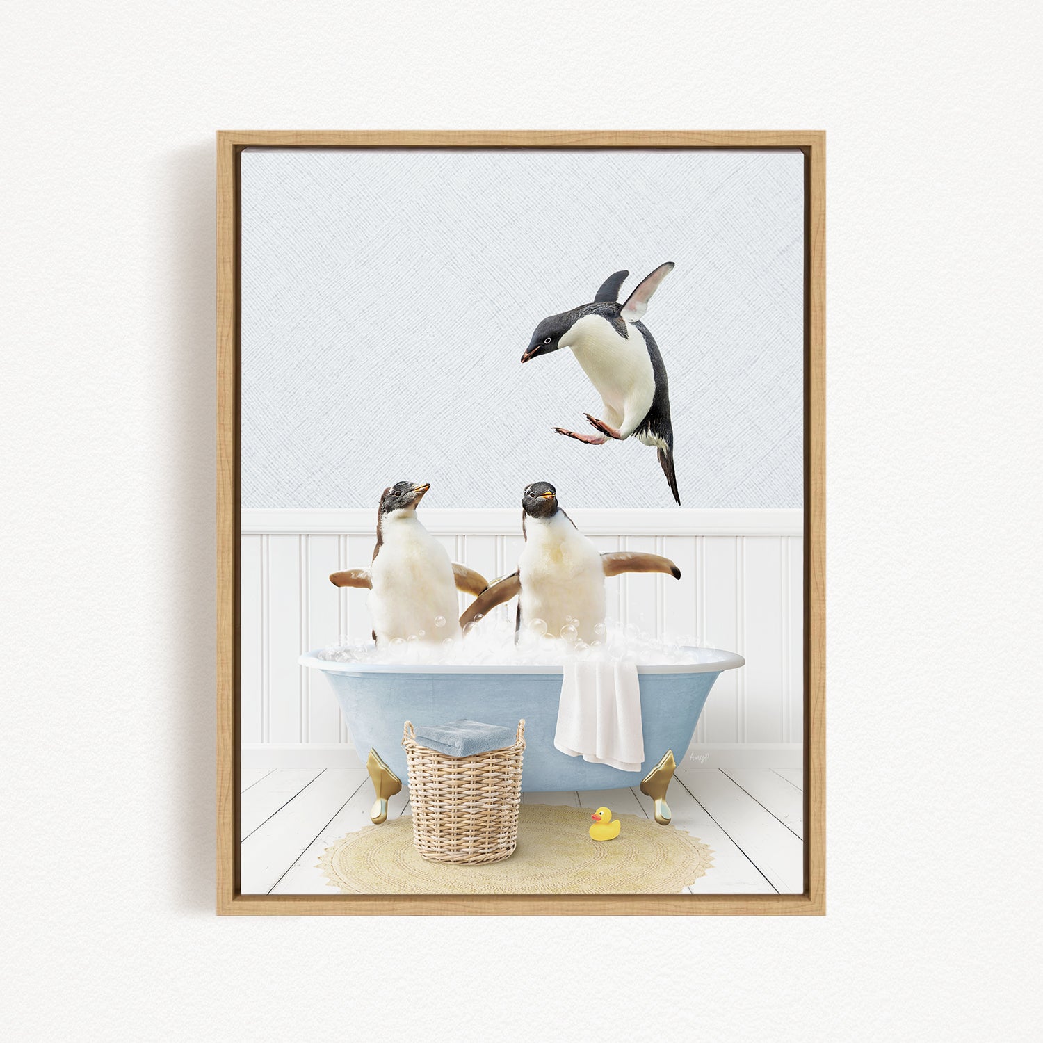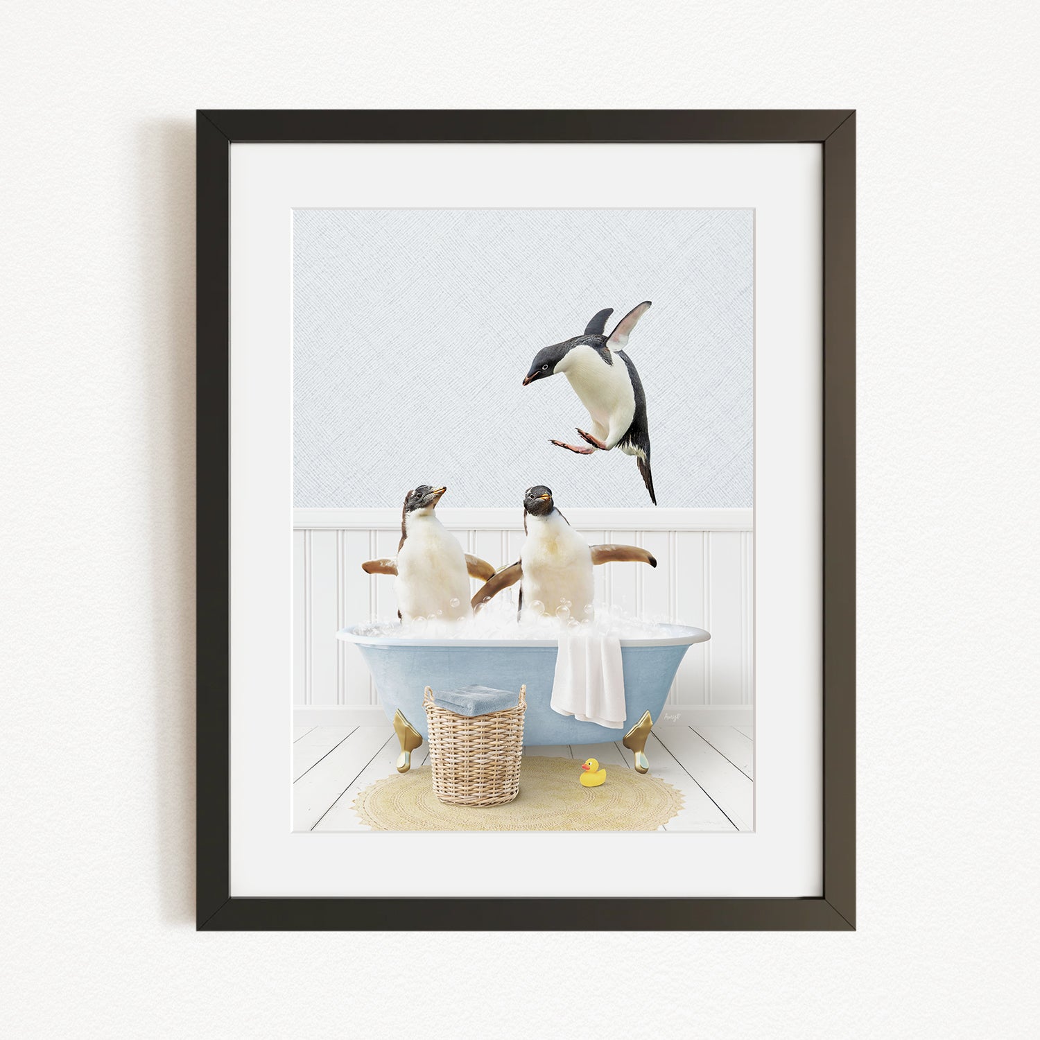 A framed image depicting two penguins sitting in a bathtub, with one penguin flying towards the other penguin.