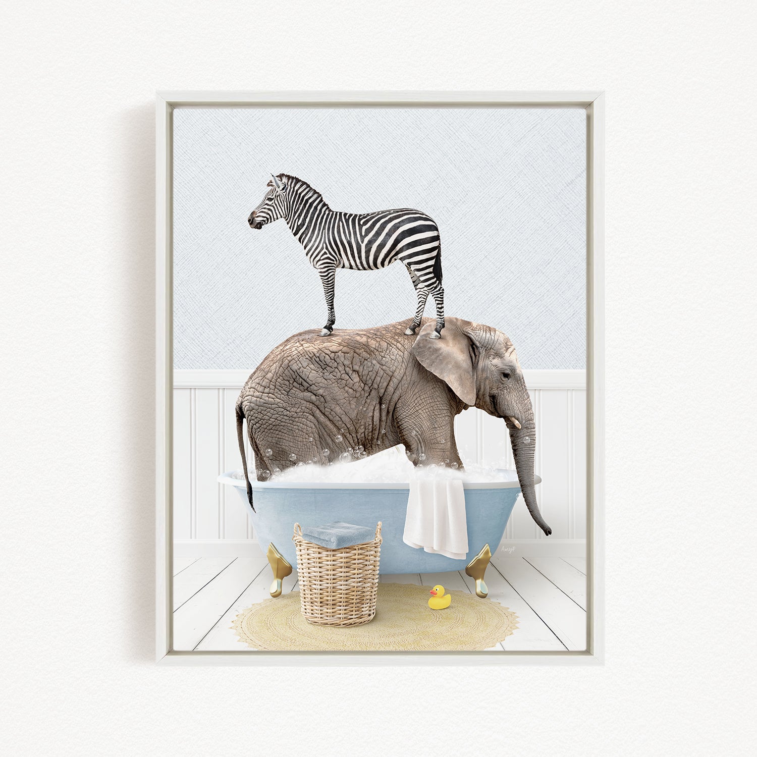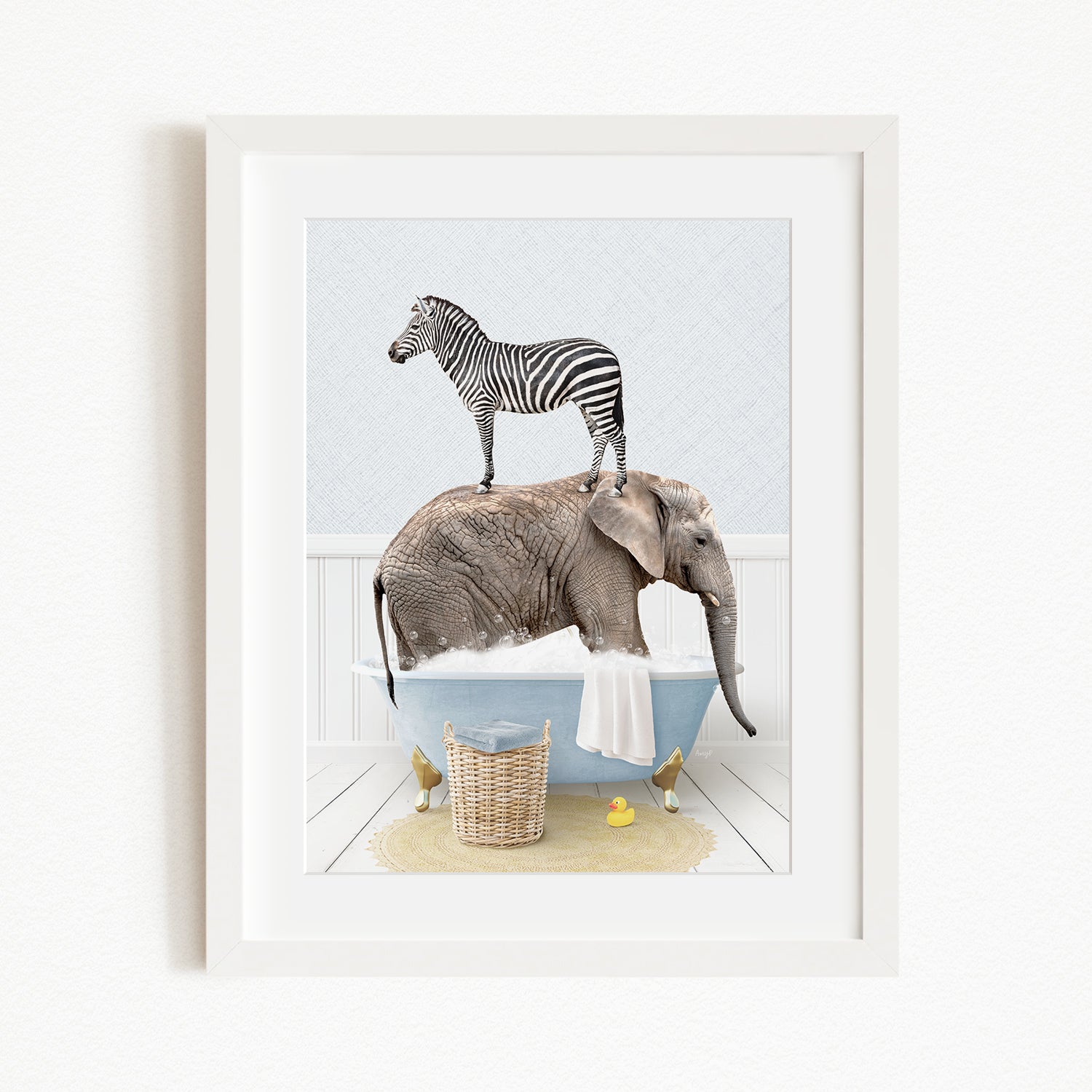 A zebra standing on an elephant's back, with a blue bathtub and yellow rubber ducks in the foreground, creating a whimsical and playful scene.