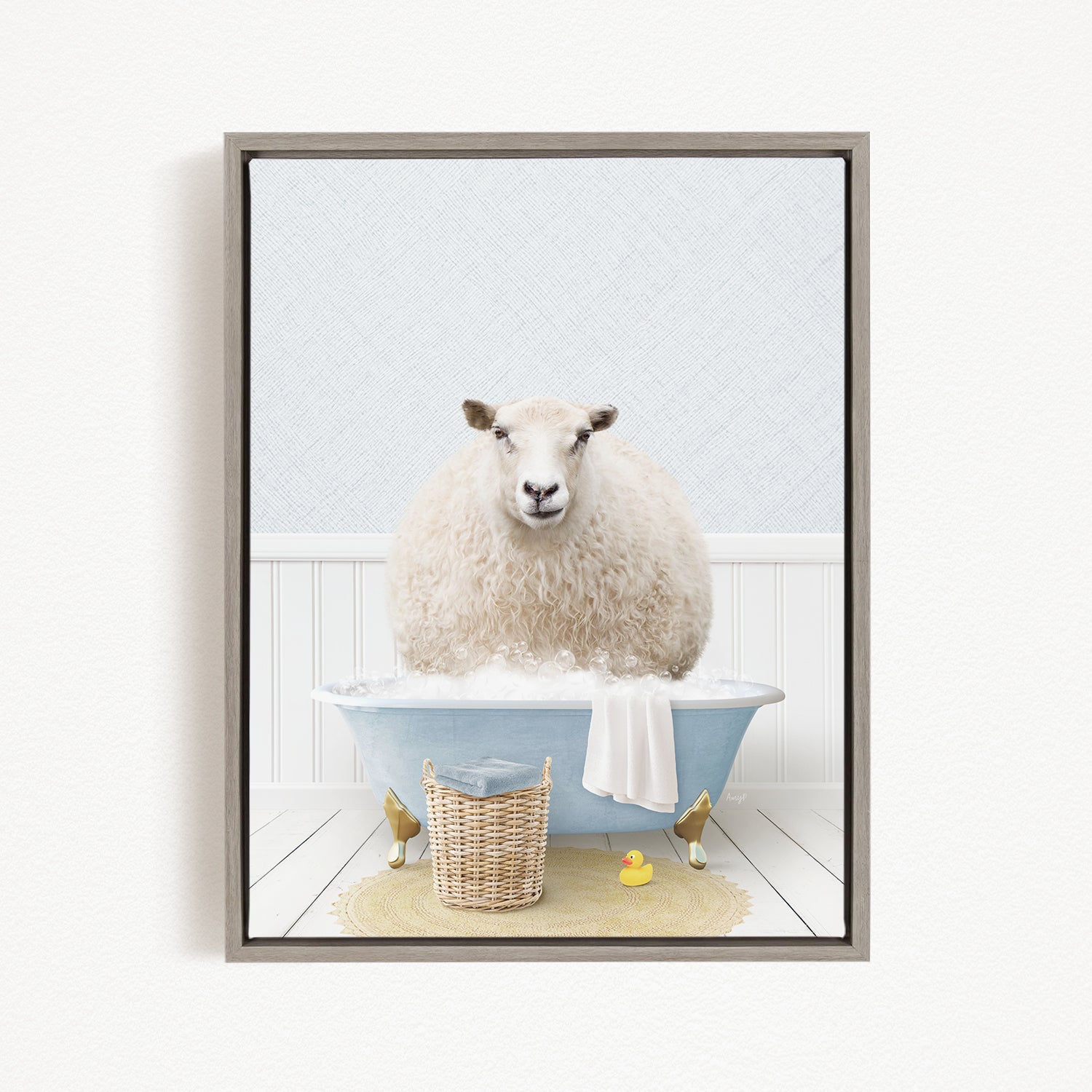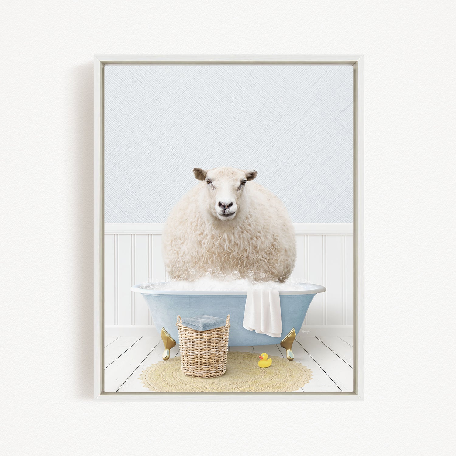 A fluffy white sheep sits in a blue bathtub filled with bubbles, surrounded by a yellow rubber duck and a wicker basket.