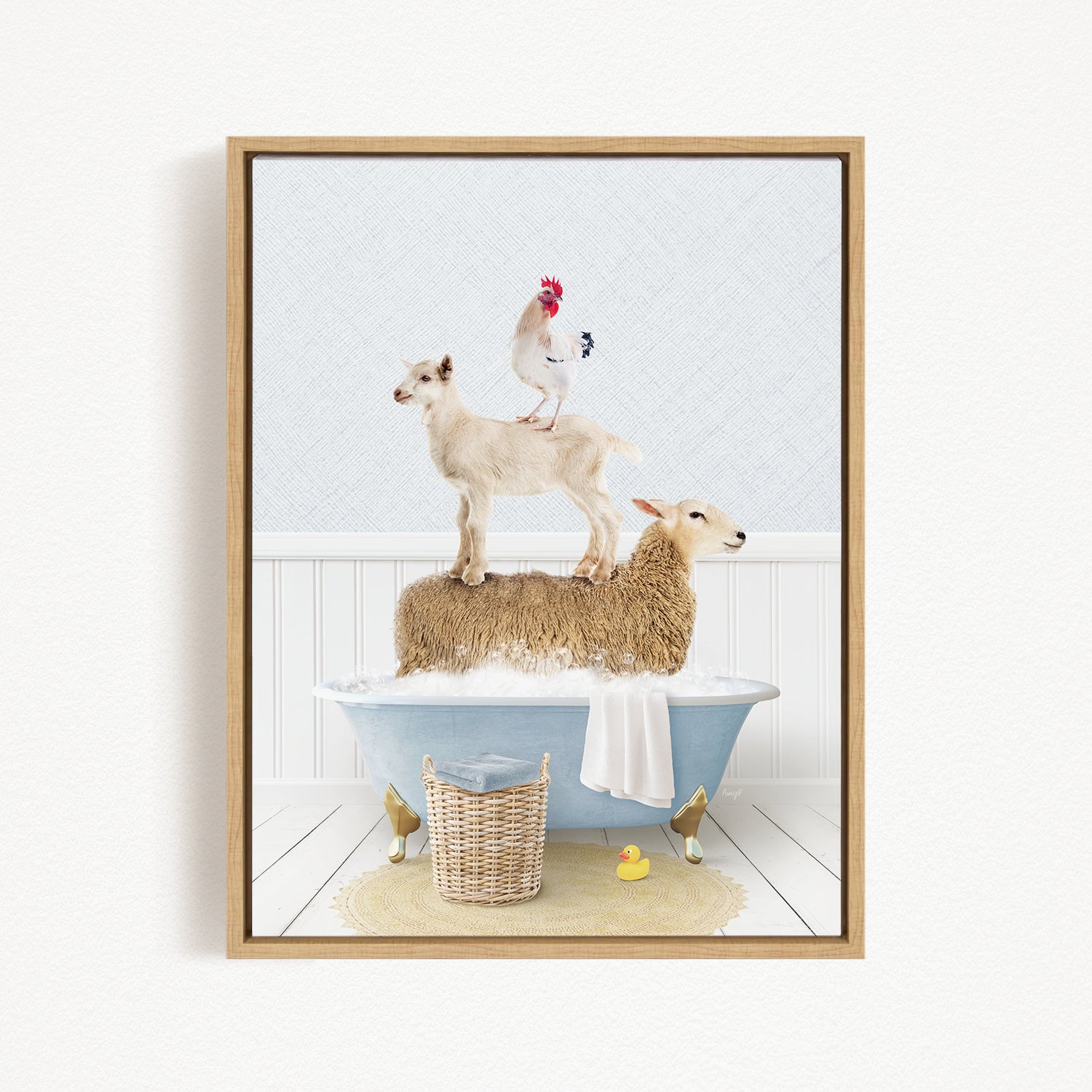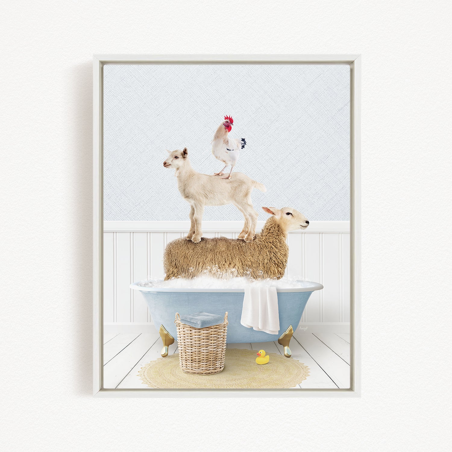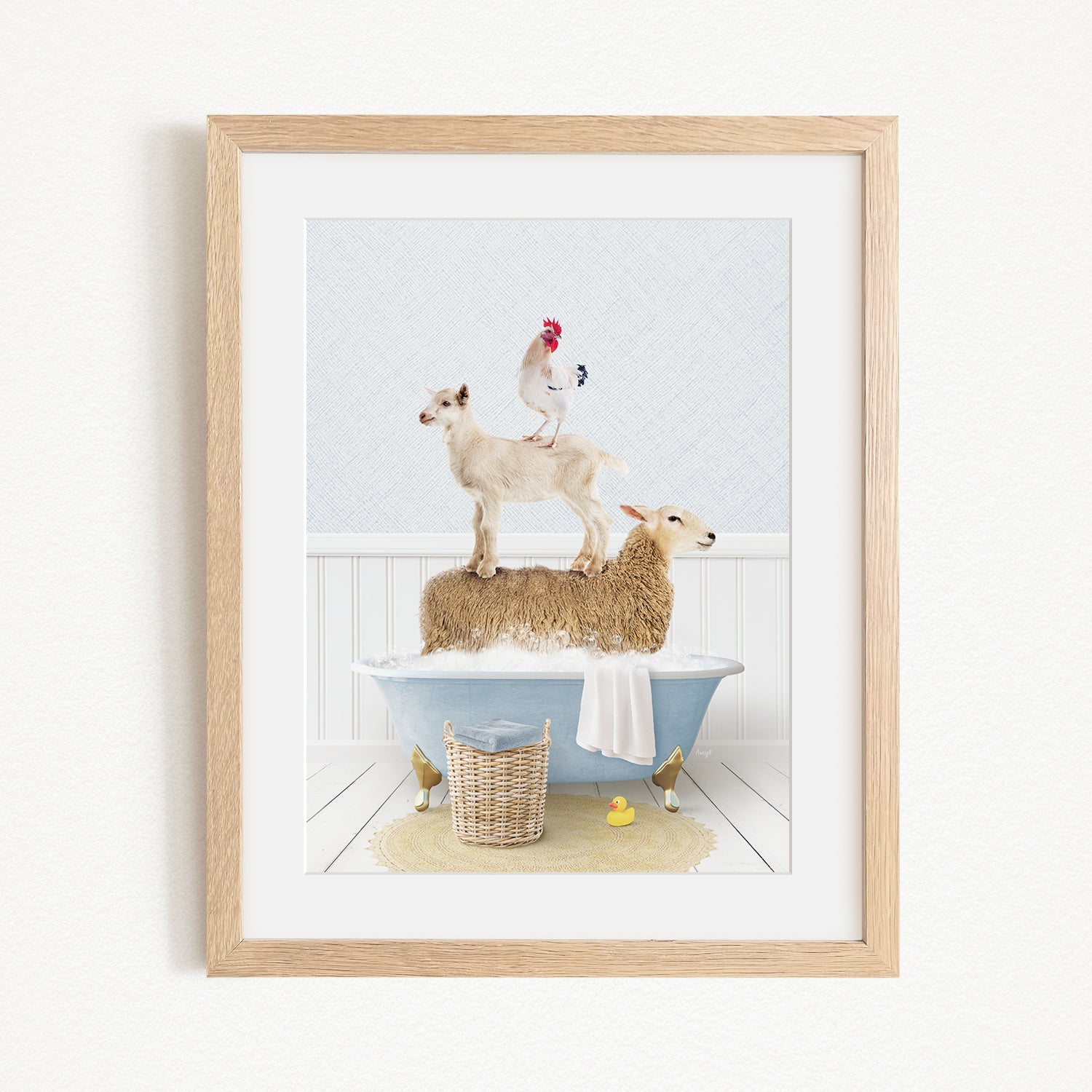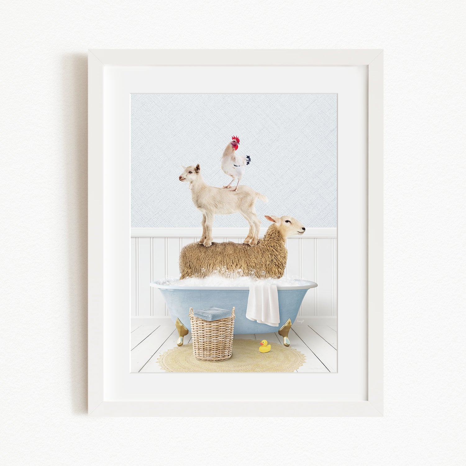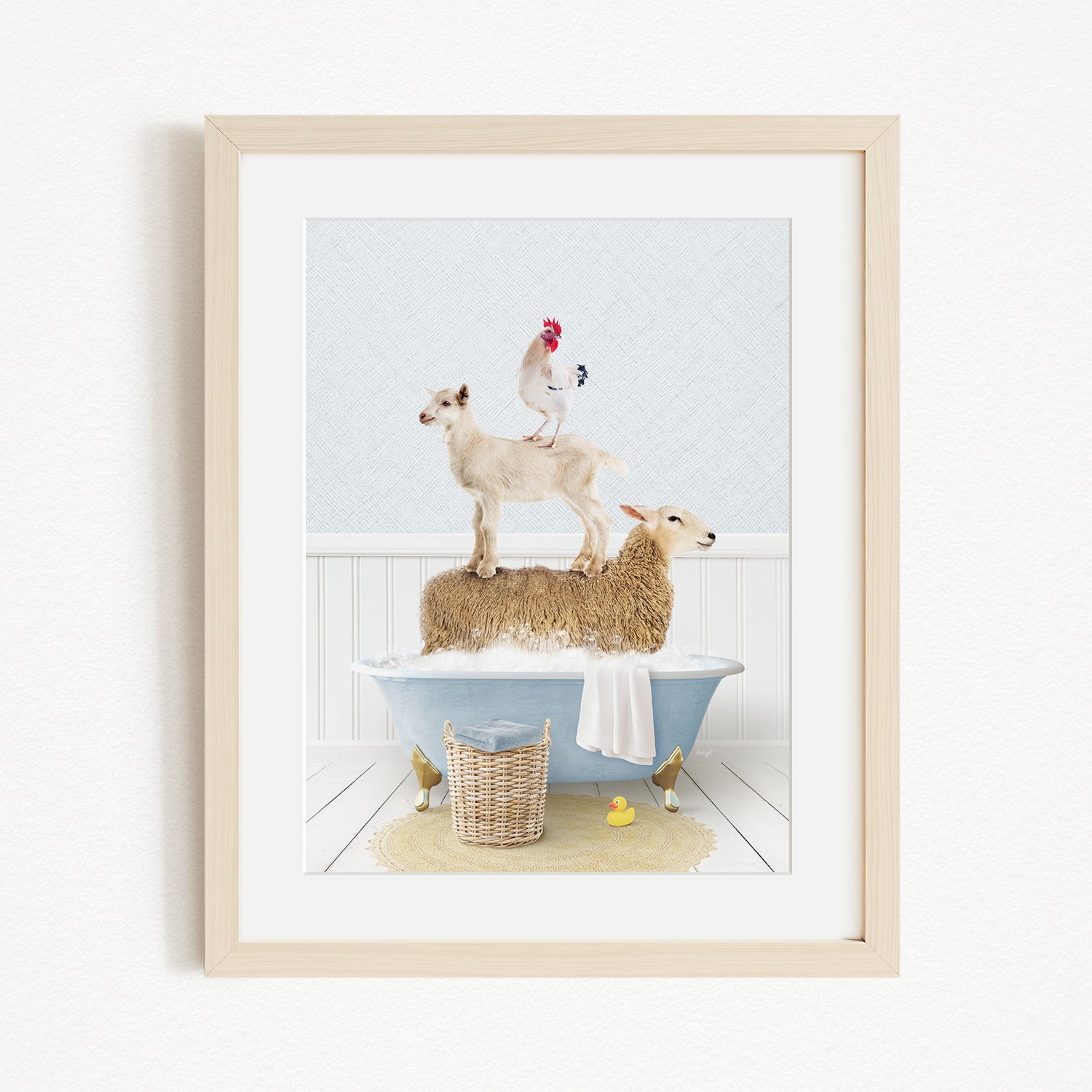 A framed image depicting a sheep standing on a goat's back while a chicken stands on top of a sheep, all in a bathtub.